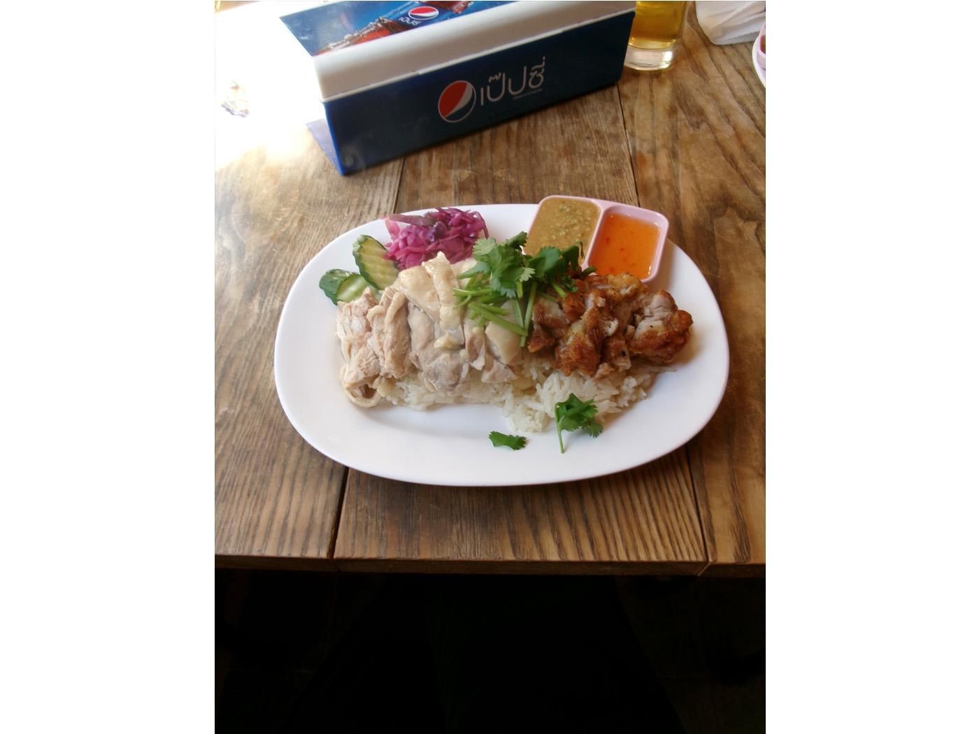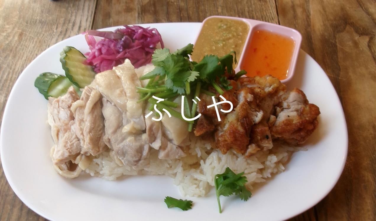 蒸した鶏と揚げた鶏どちらも乗っているカオマンガイMIXを注文しました。