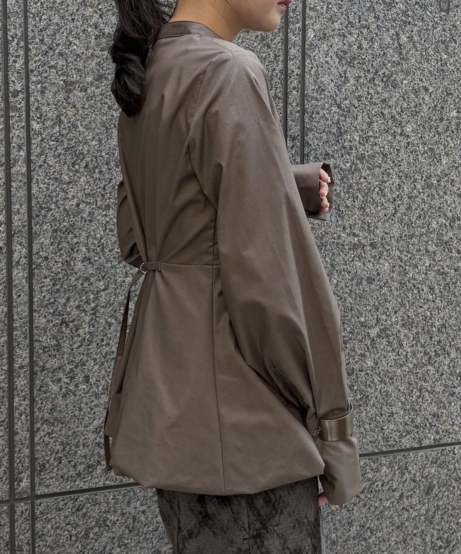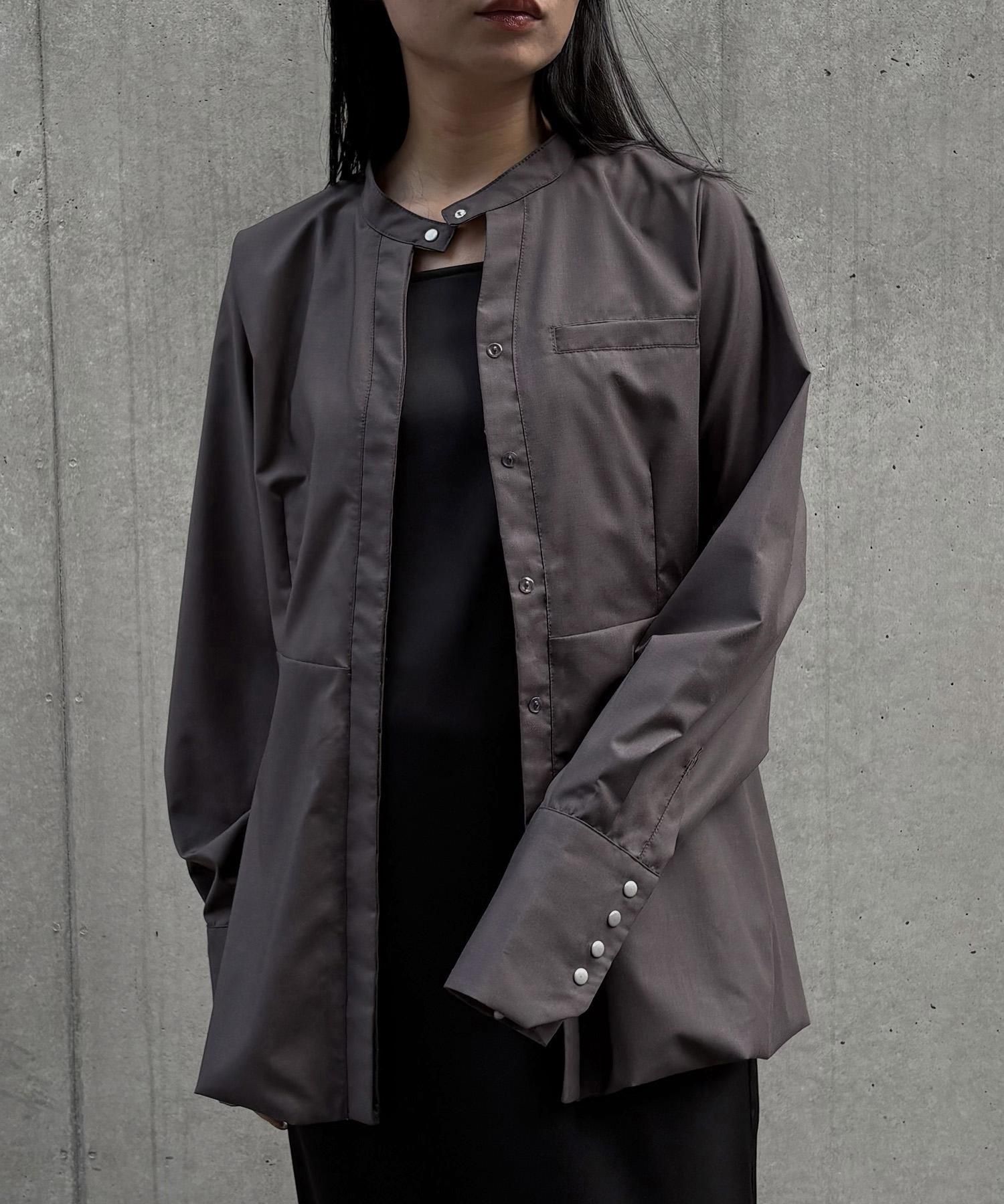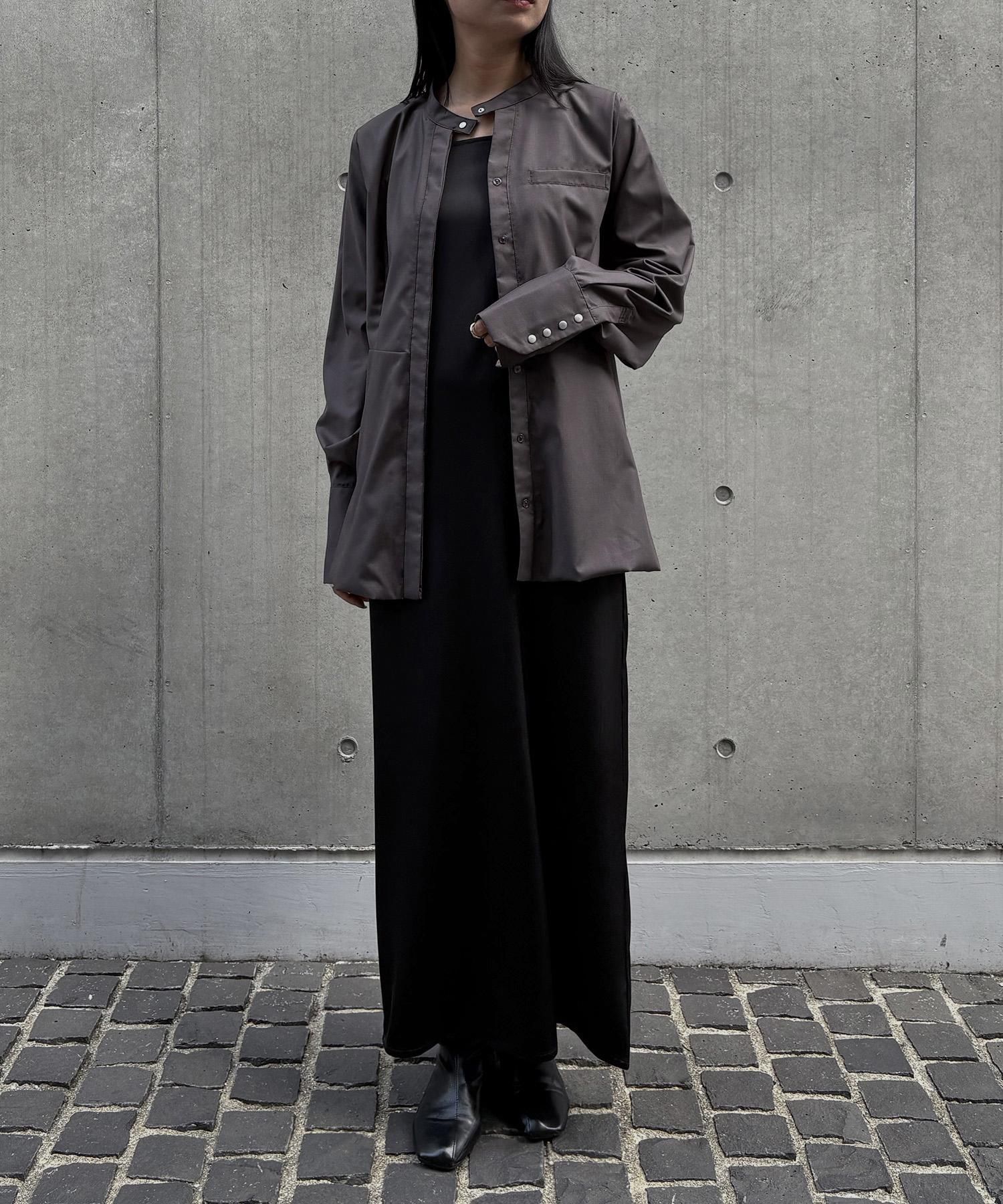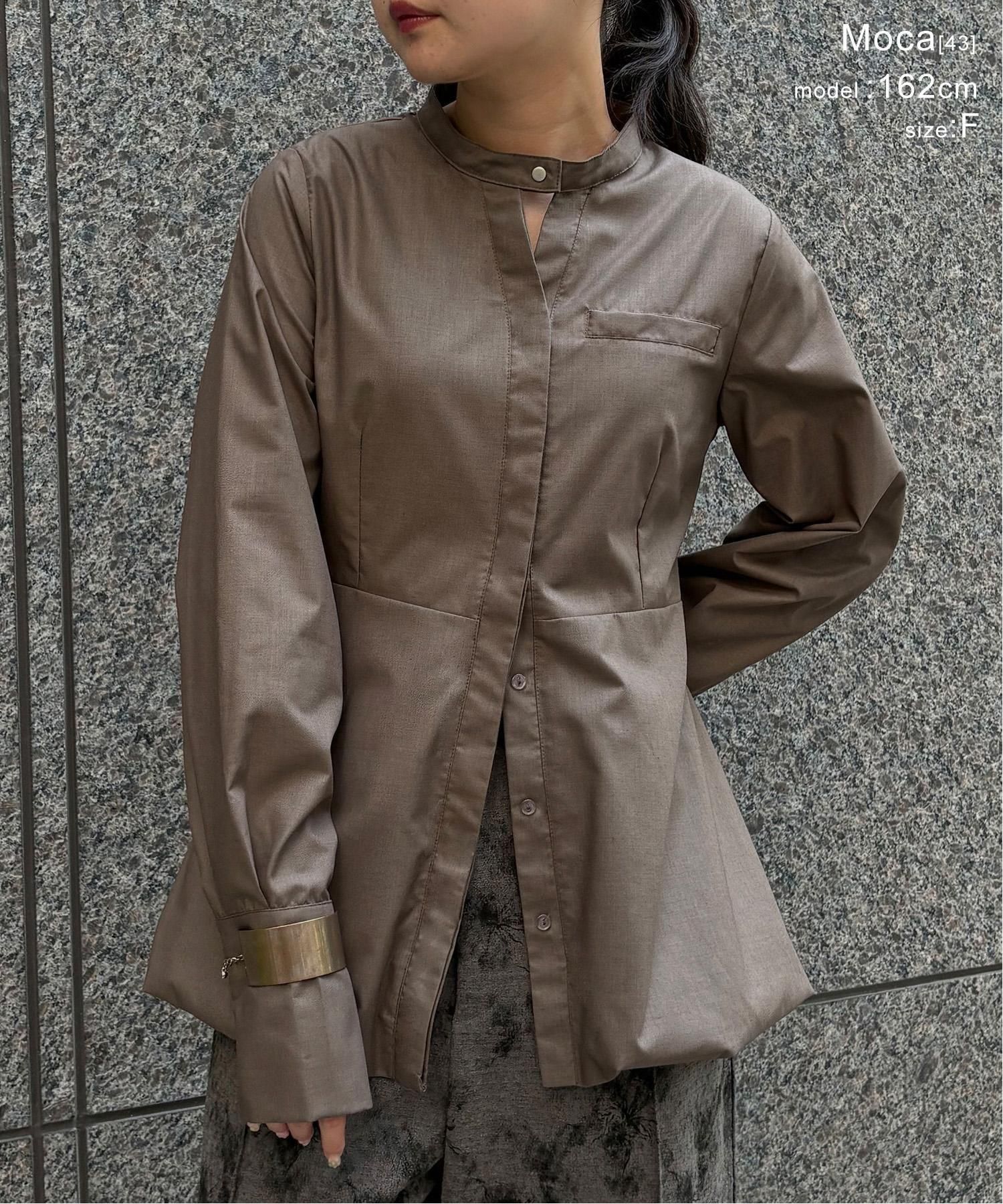 スタンドネックにあしらったシルバーボタンとスリットが、&g’aimeらしいモード感をプラス。