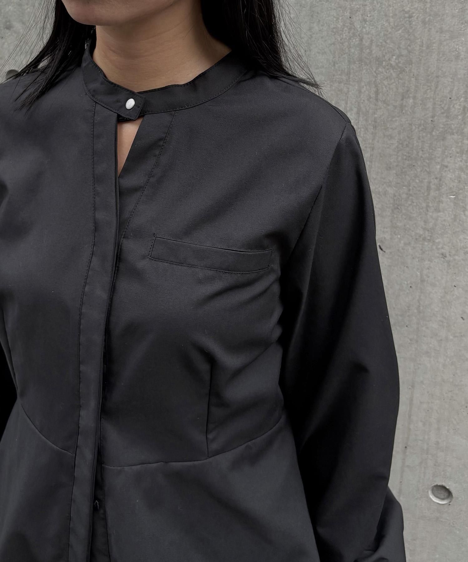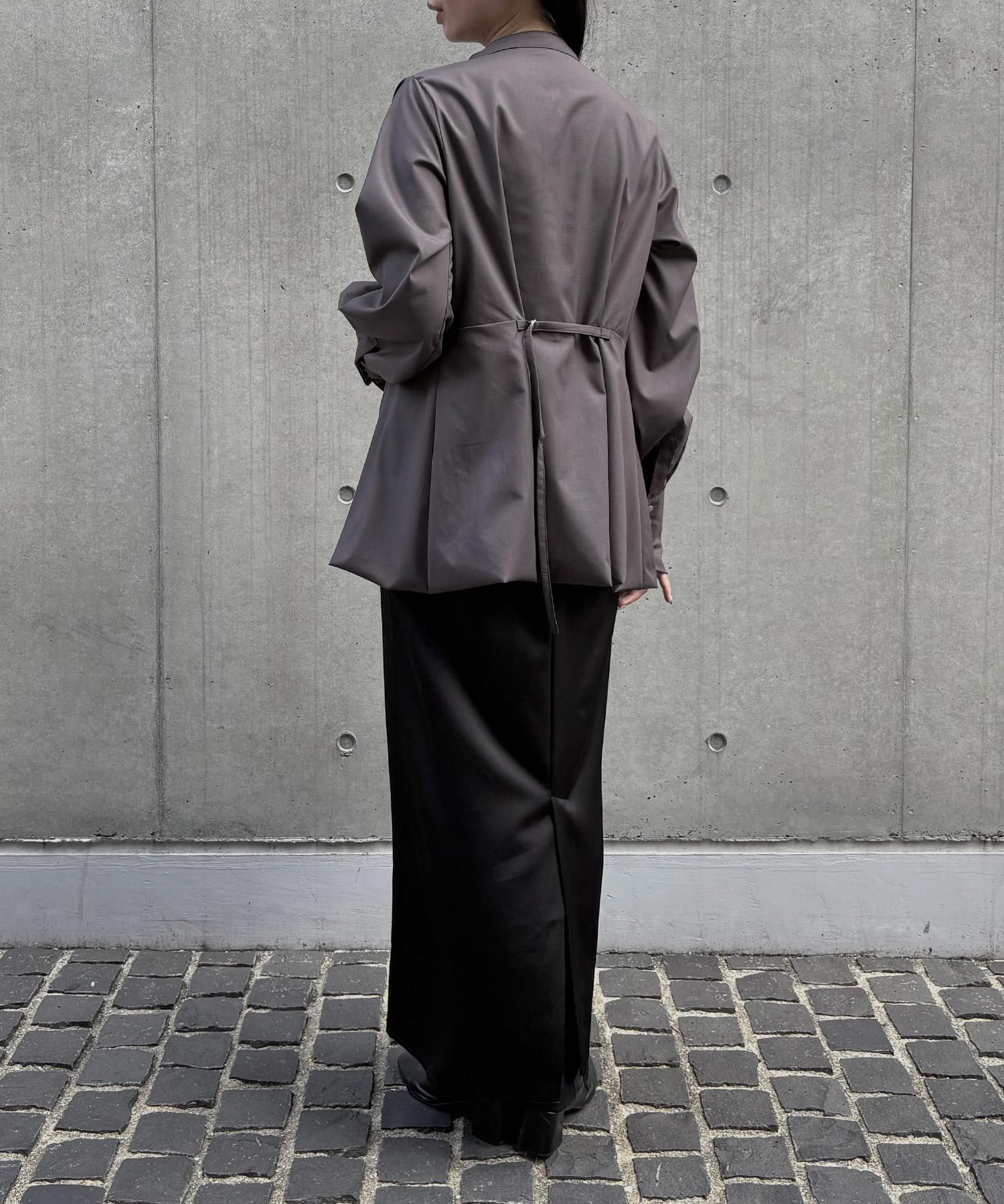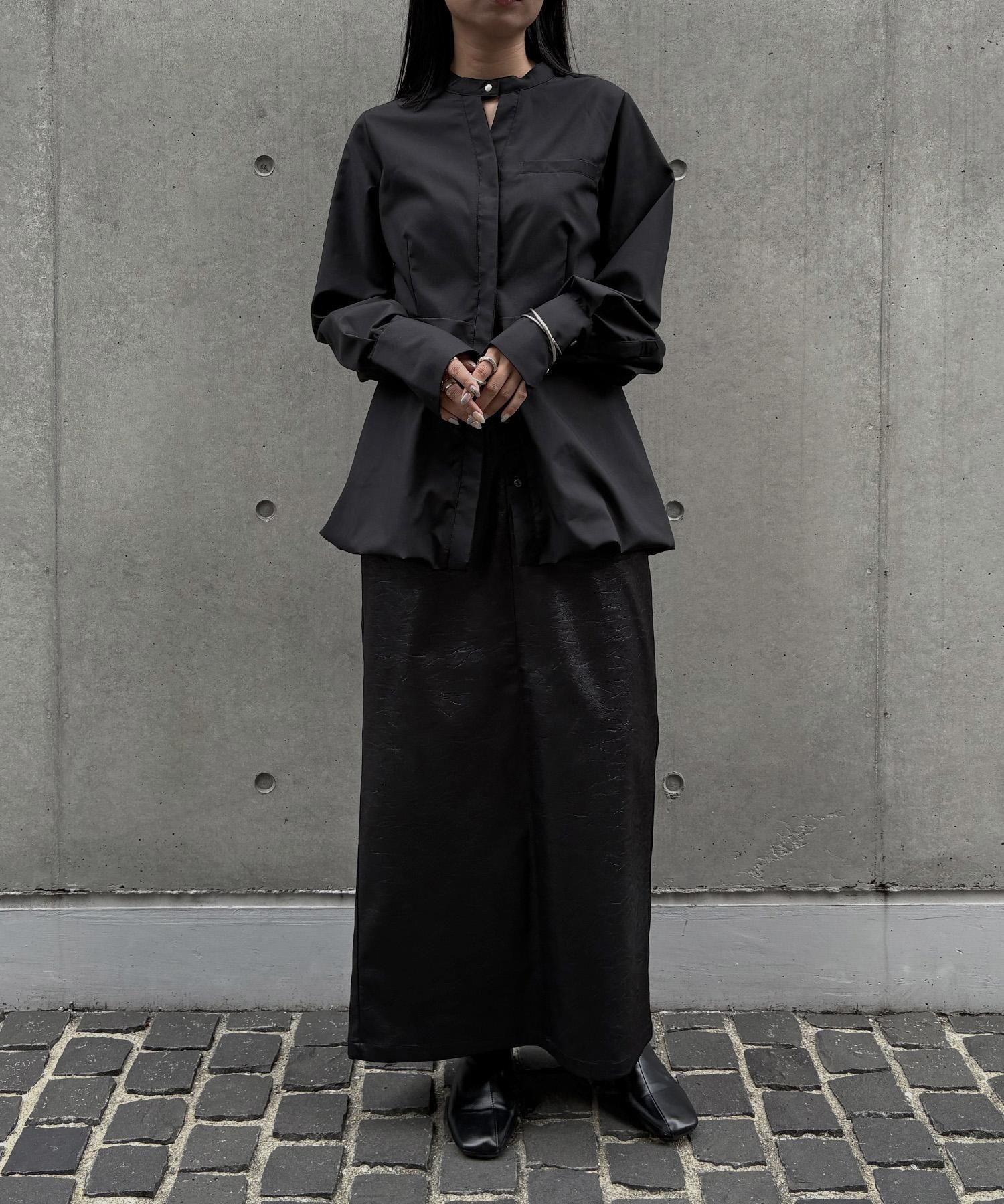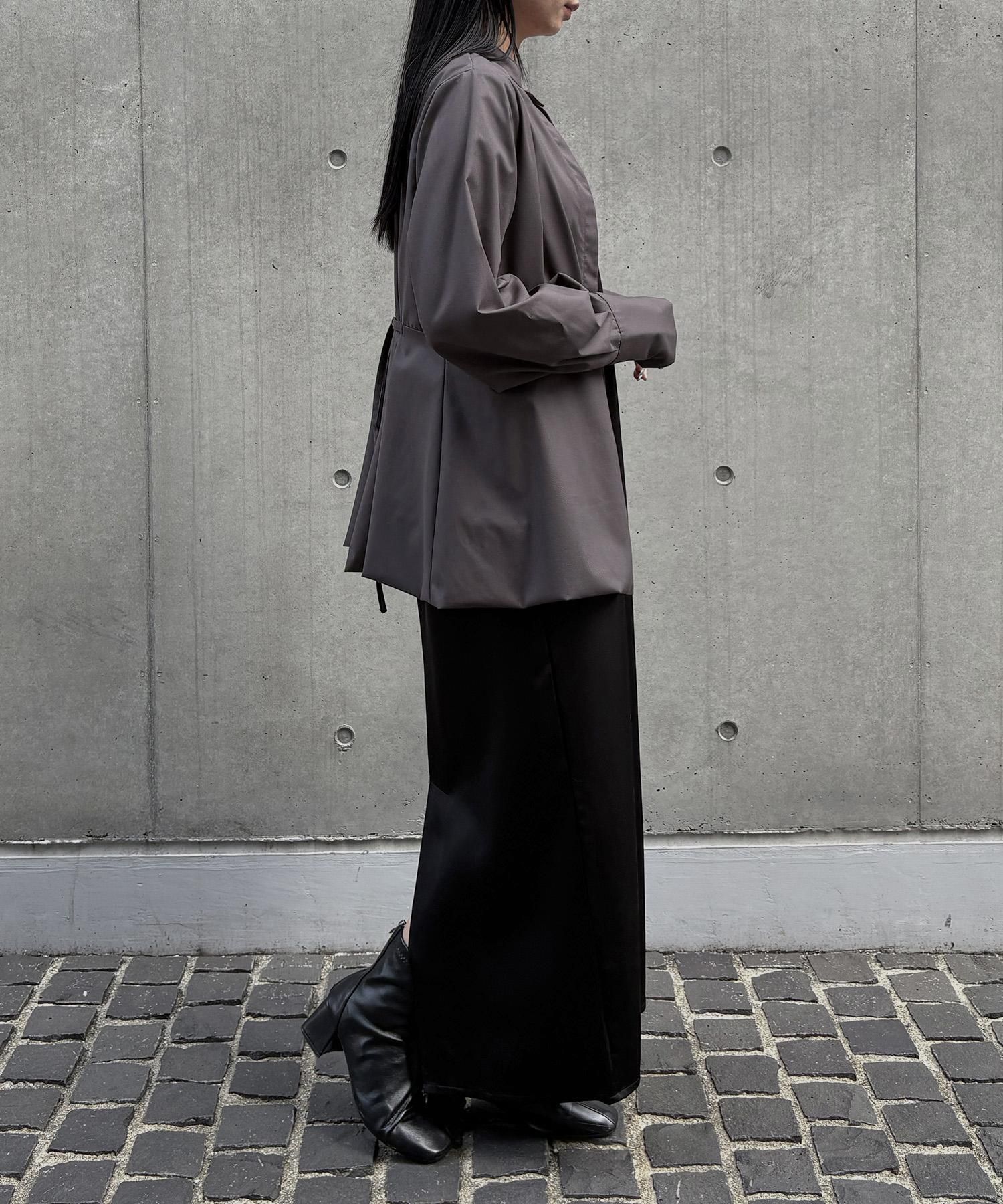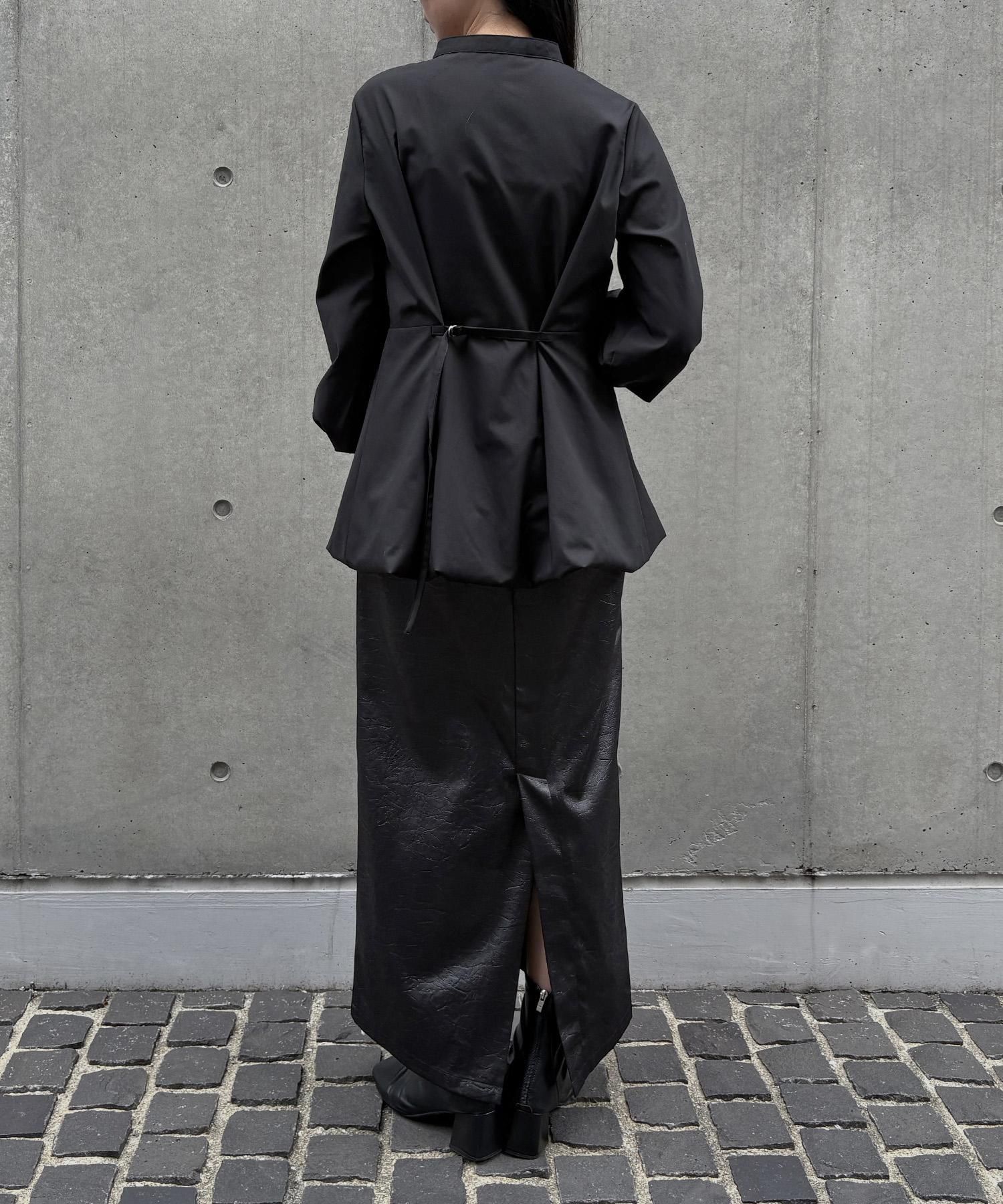 スタンドネックにあしらったシルバーボタンとスリットが、&g’aimeらしいモード感をプラス。