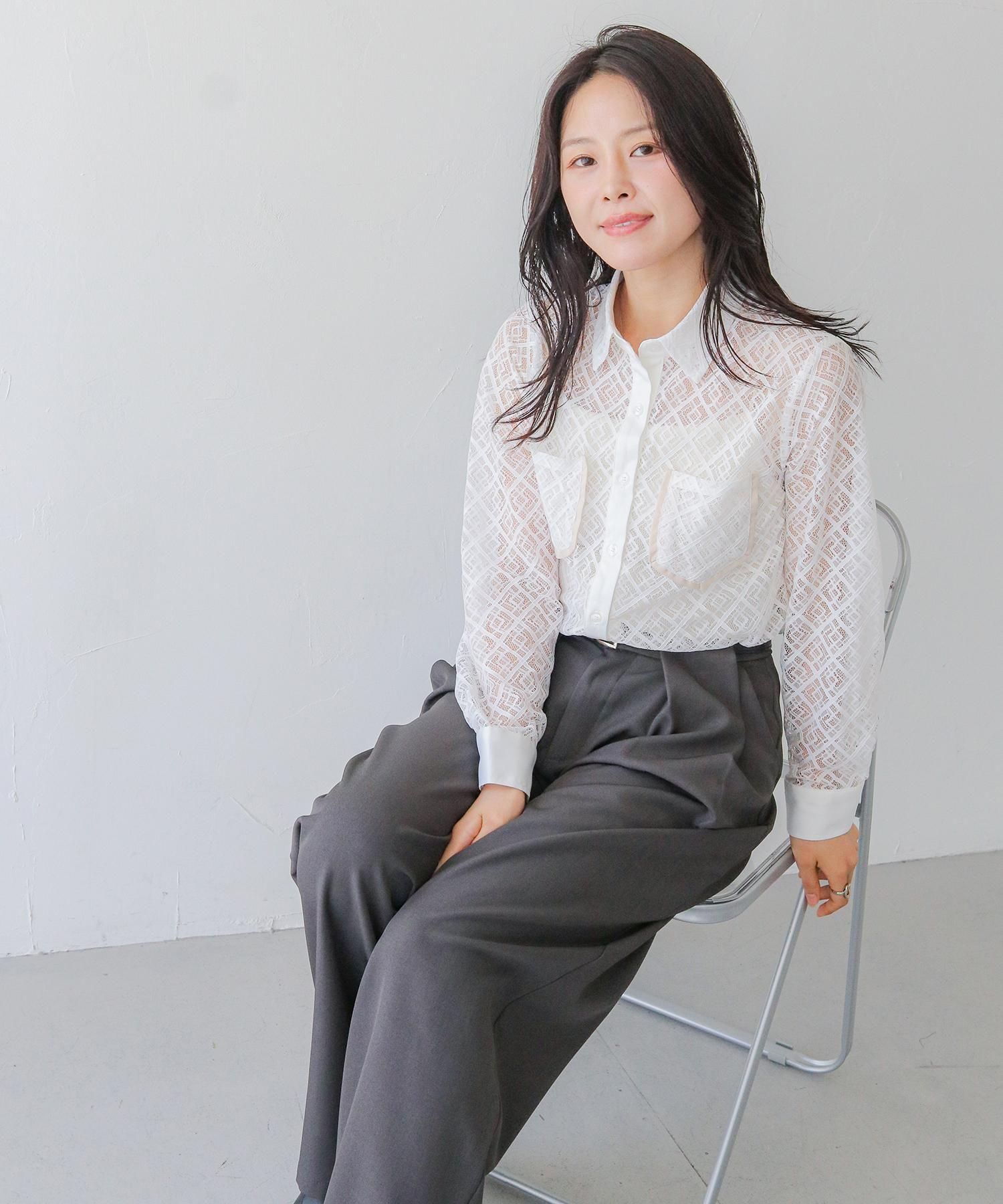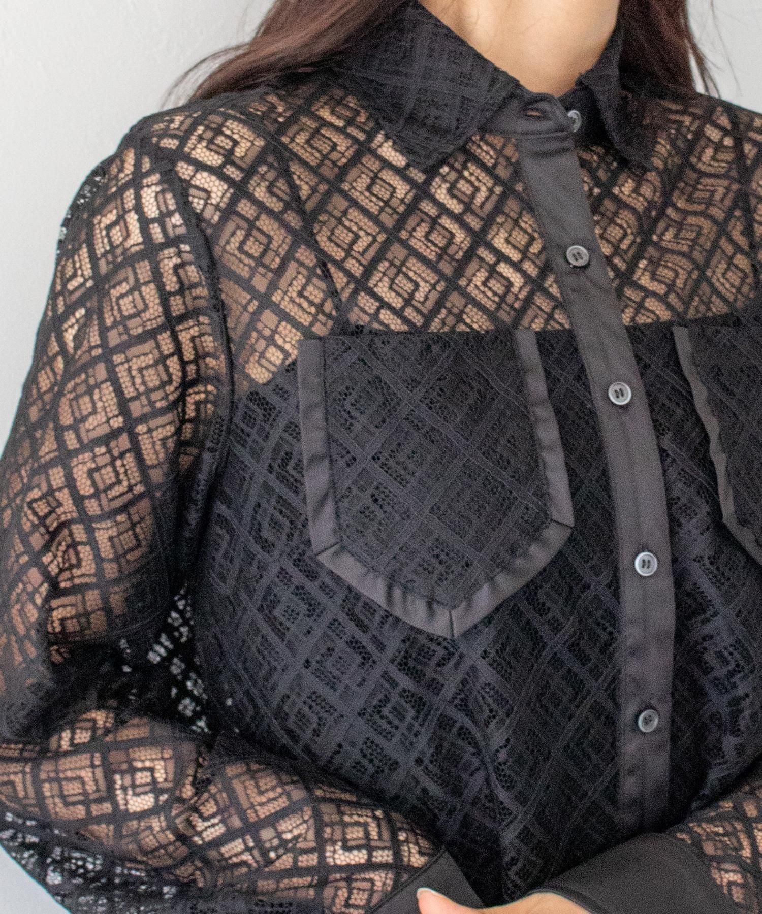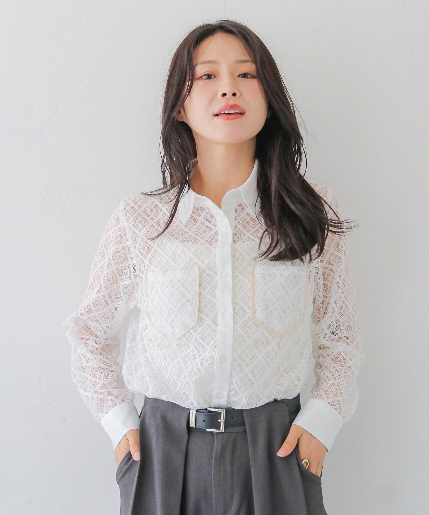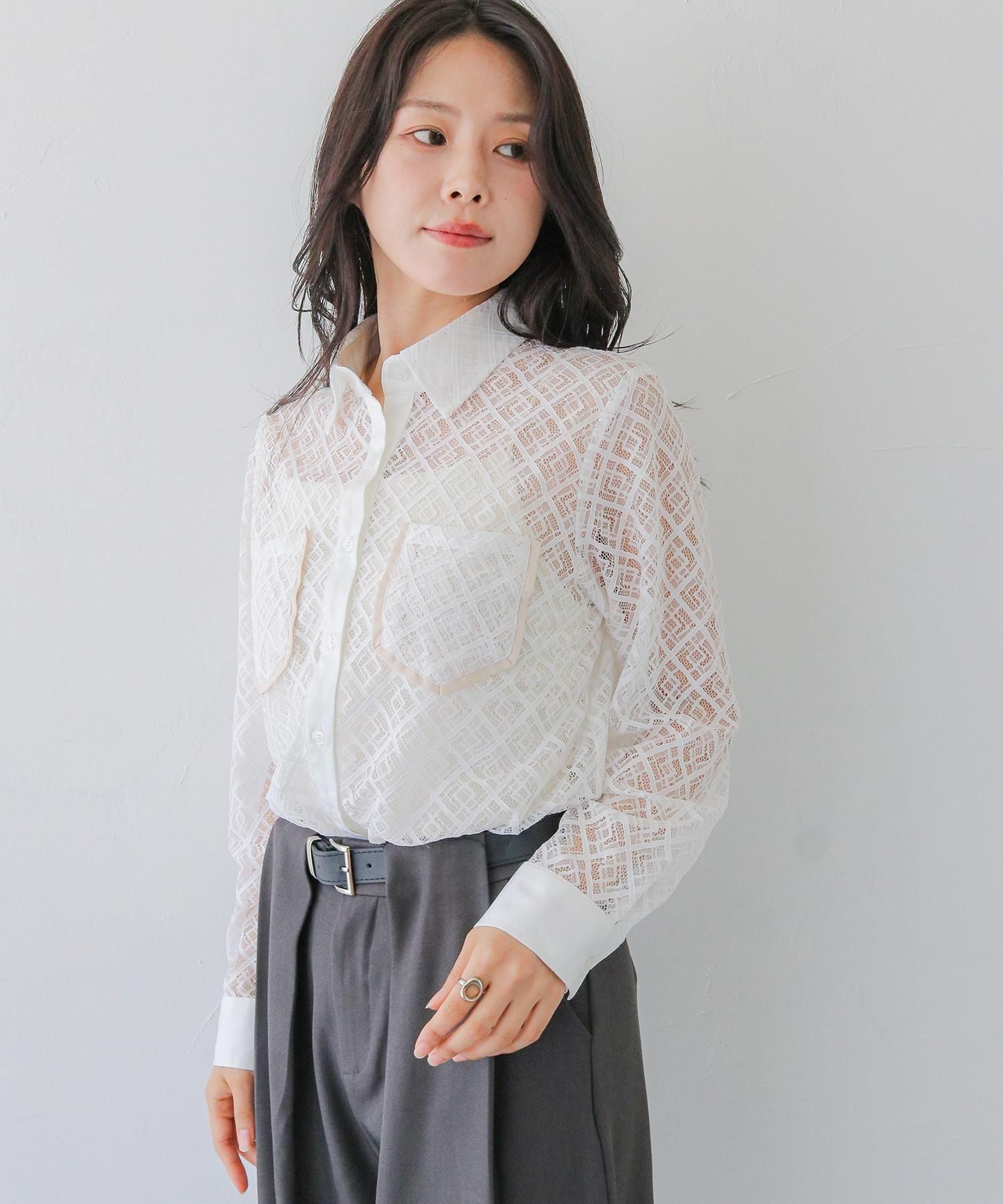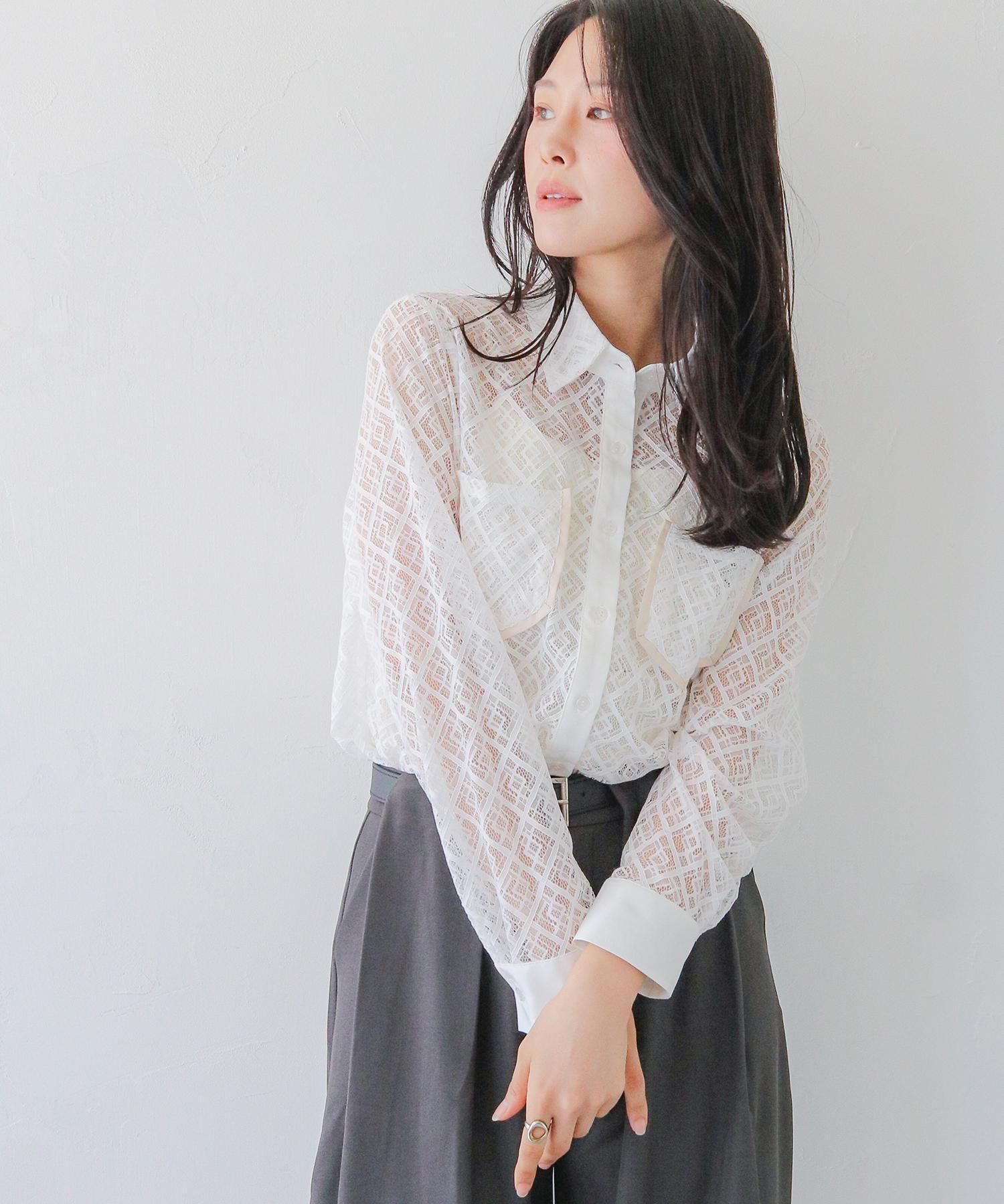 さらりとしたレースにポケットのパイピングがポイントの長袖レースシャツブラウス