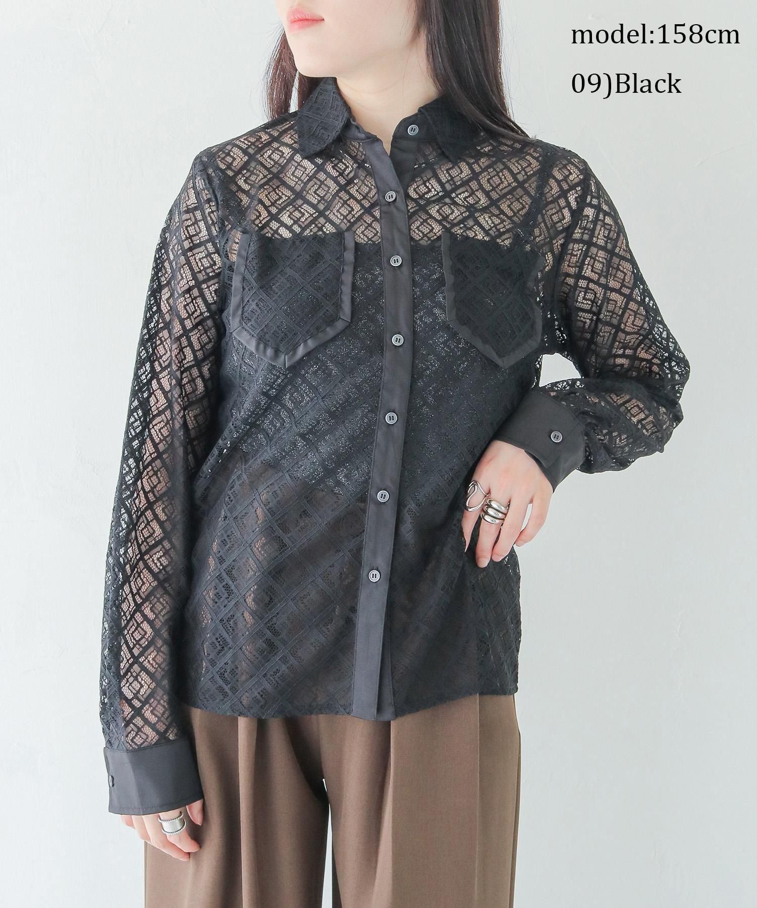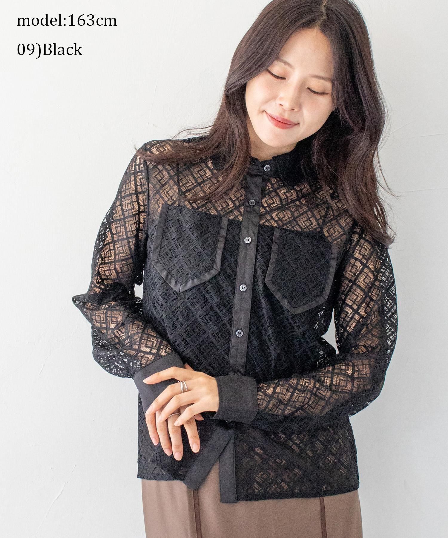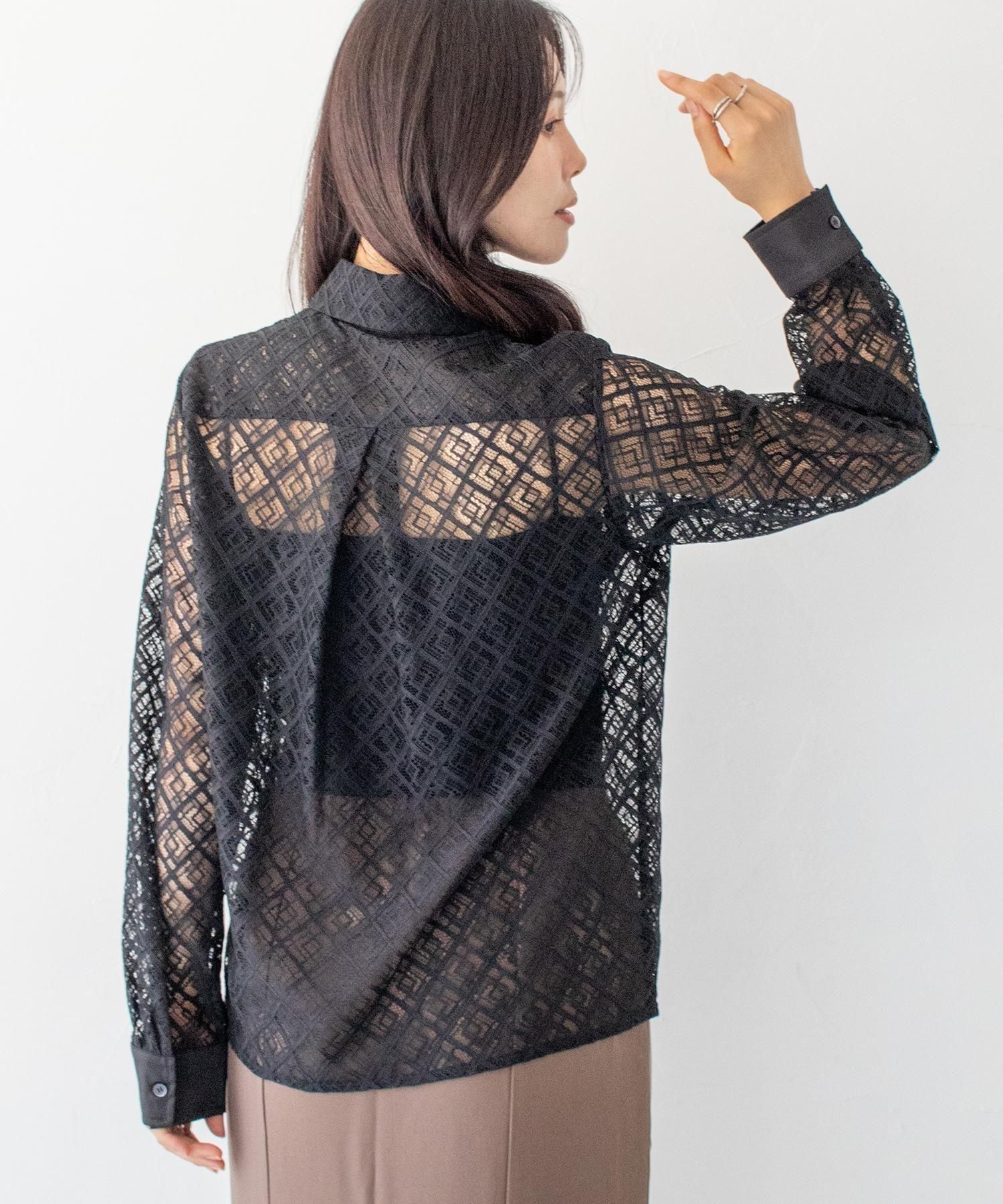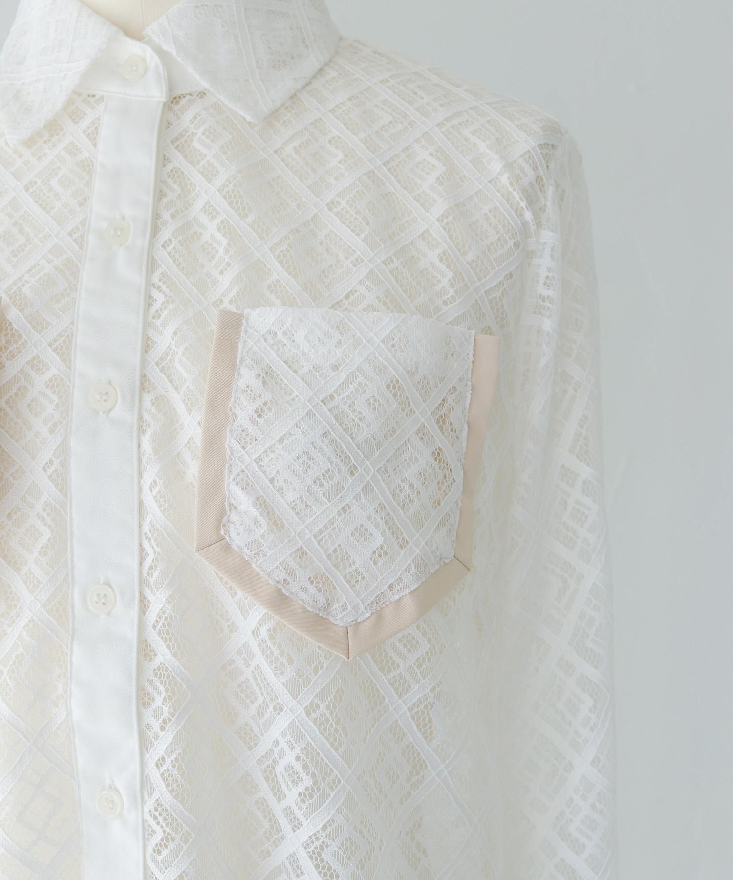 さらりとしたレースにポケットのパイピングがポイントの長袖レースシャツブラウス
