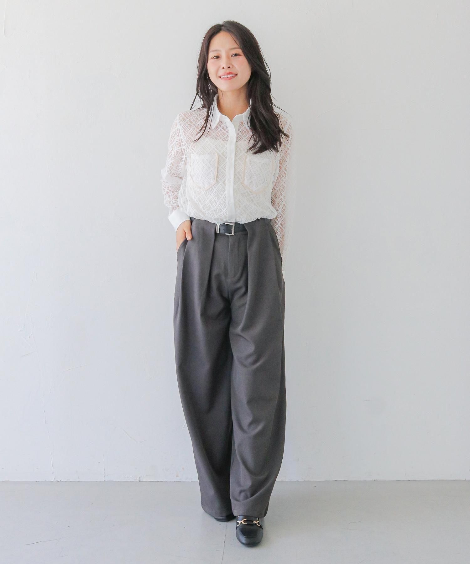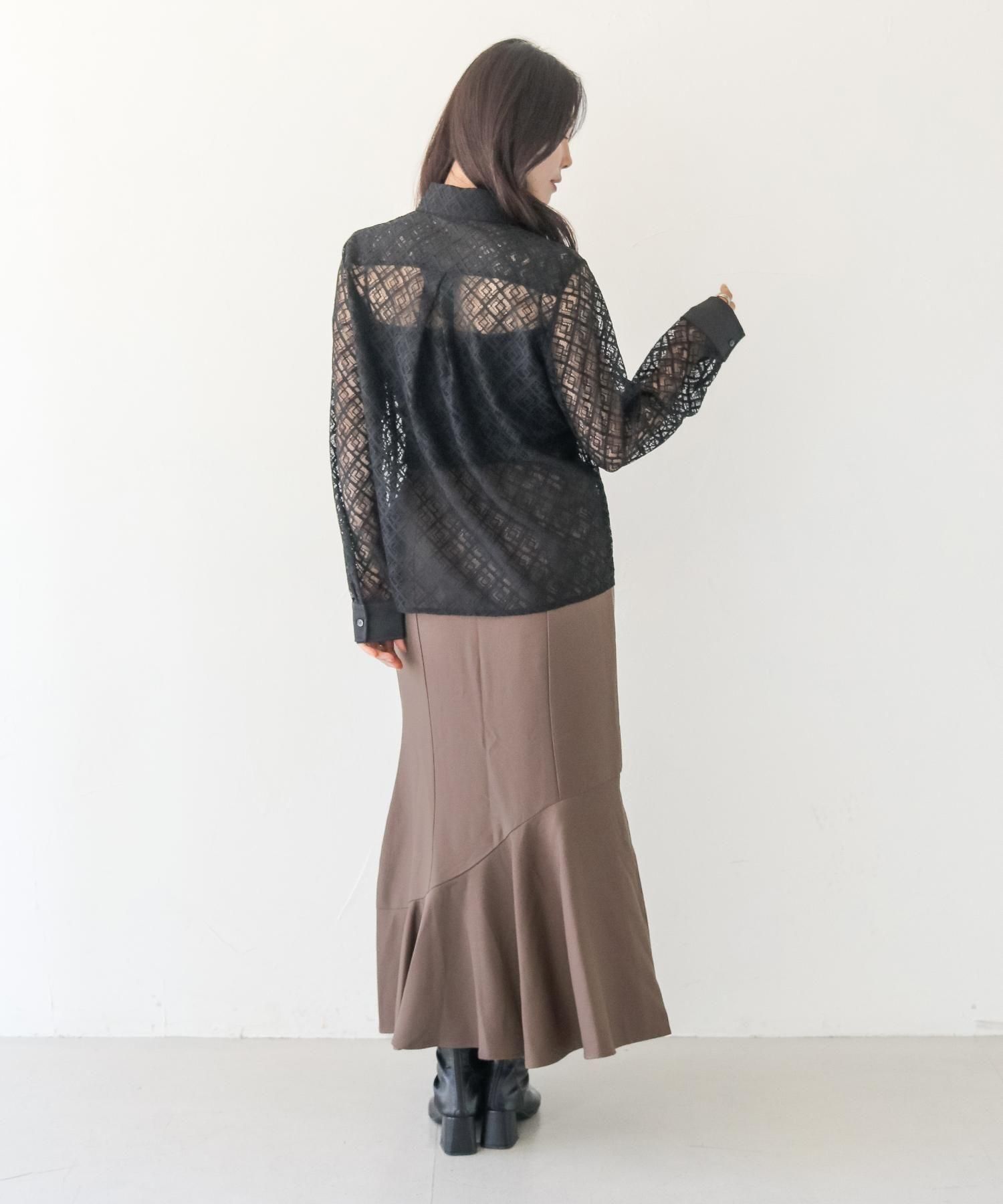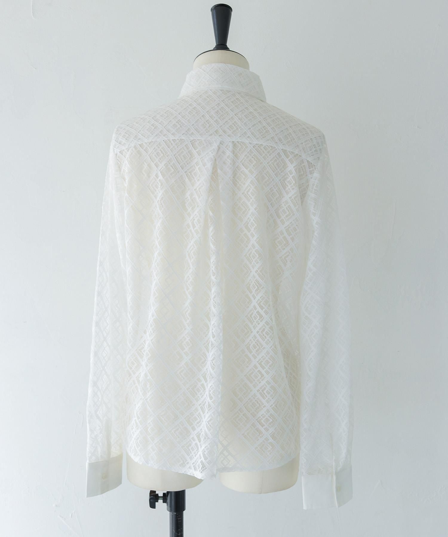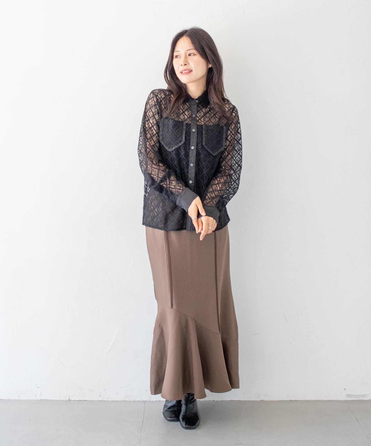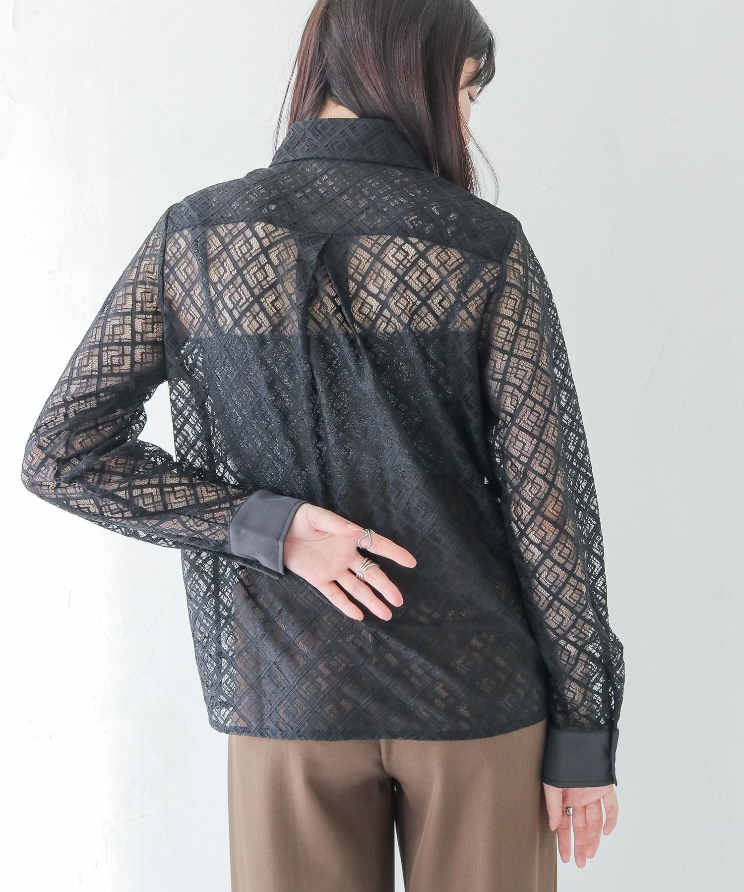 さらりとしたレースにポケットのパイピングがポイントの長袖レースシャツブラウス