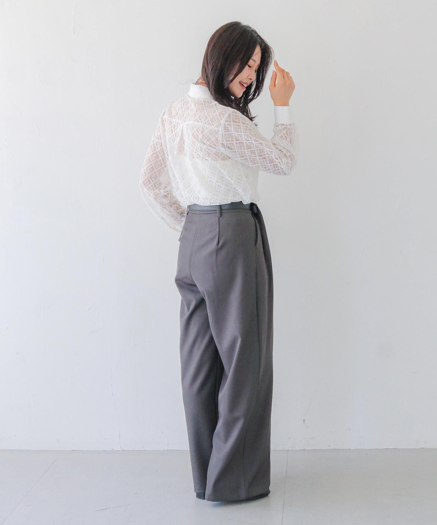 ・ベージュやホワイトのキャミソールを合わせて透け感を調整。テーパードパンツやタイトスカートできれいめオフィスコーデに。