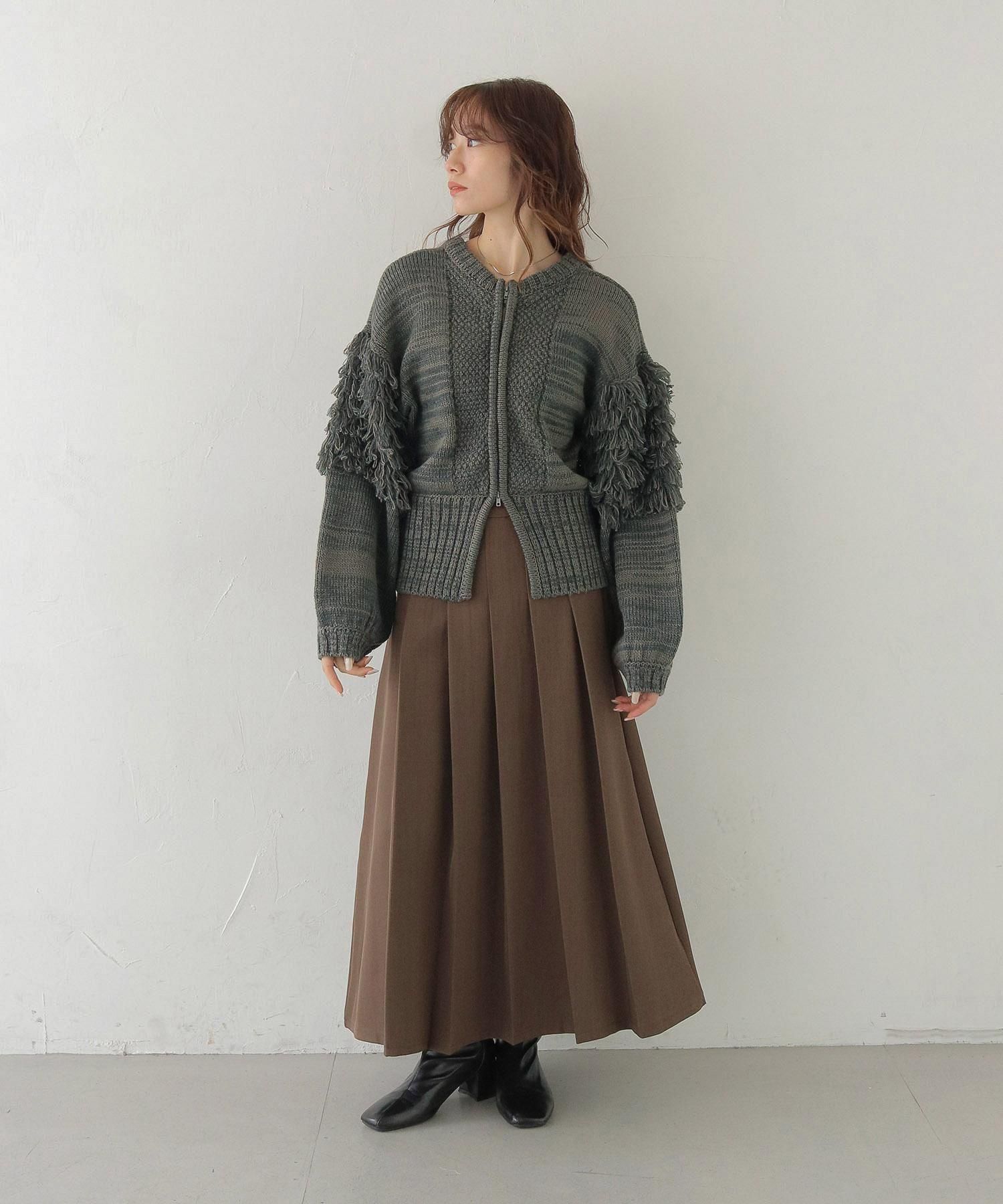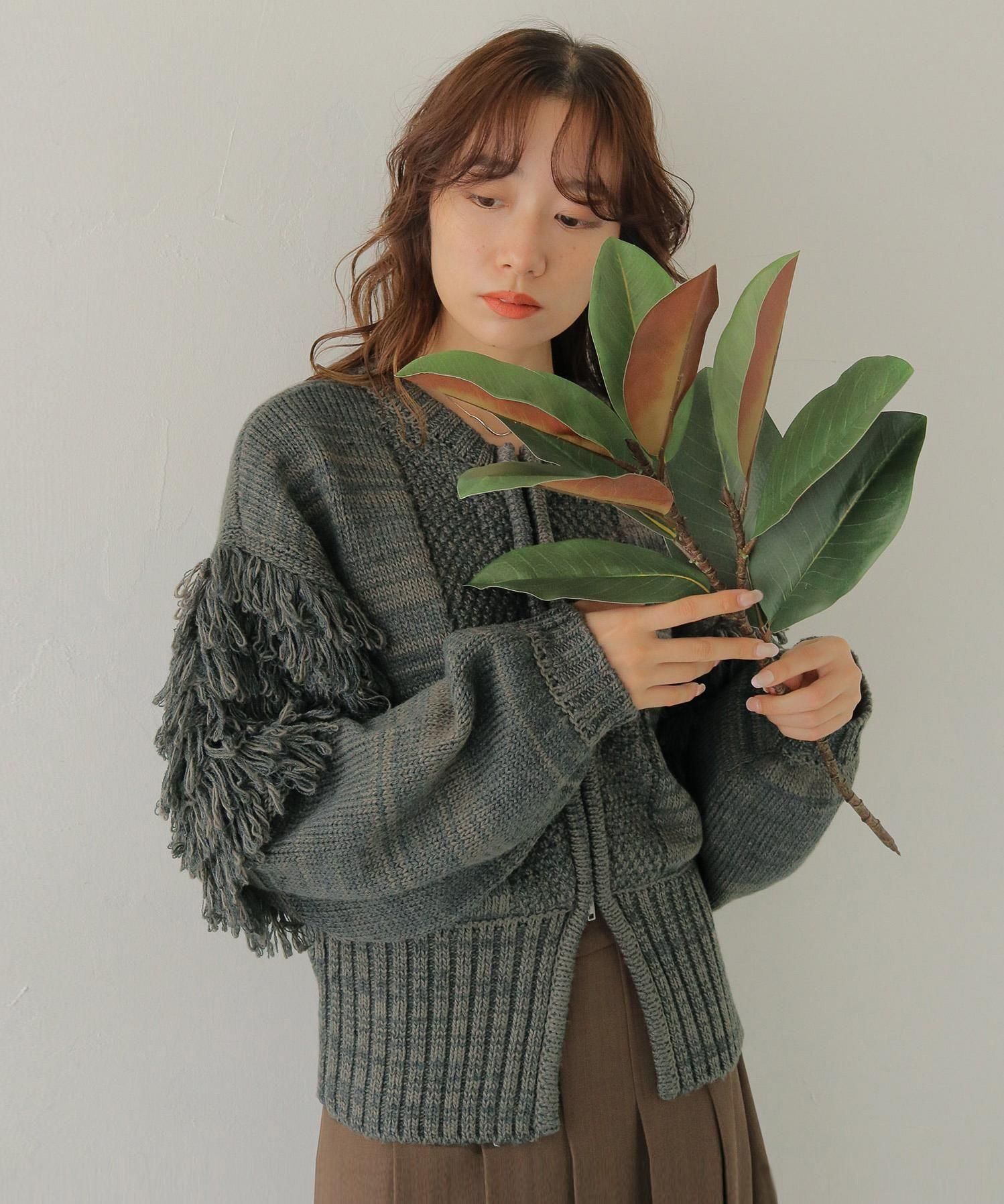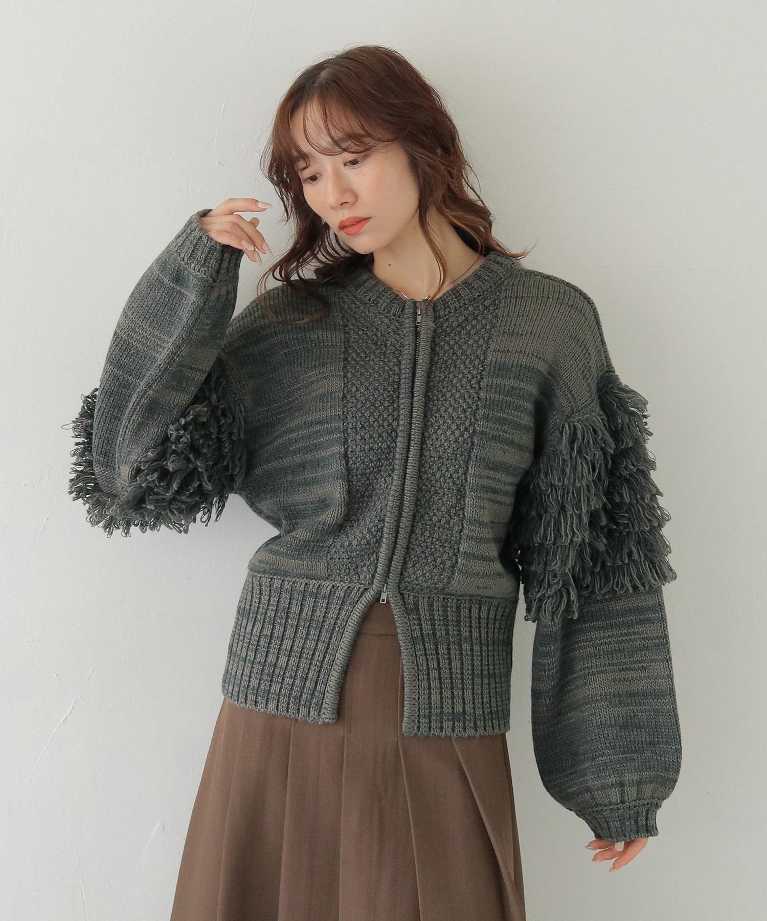 混合糸でのループ編みとジップ下の大きなスリットが特徴で、フリンジ袖のボリューム感も程よくバランスが取れているアイテムです。
