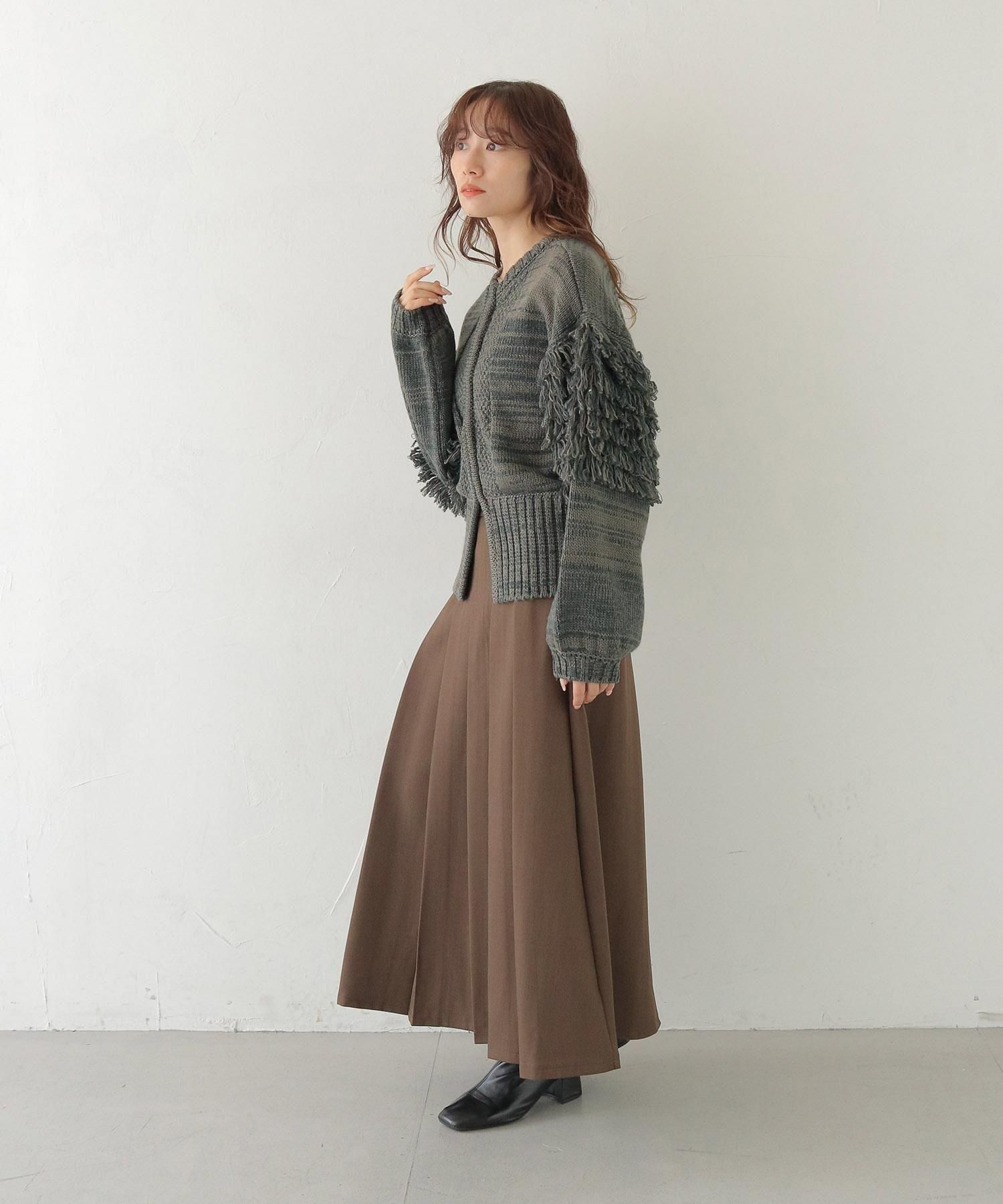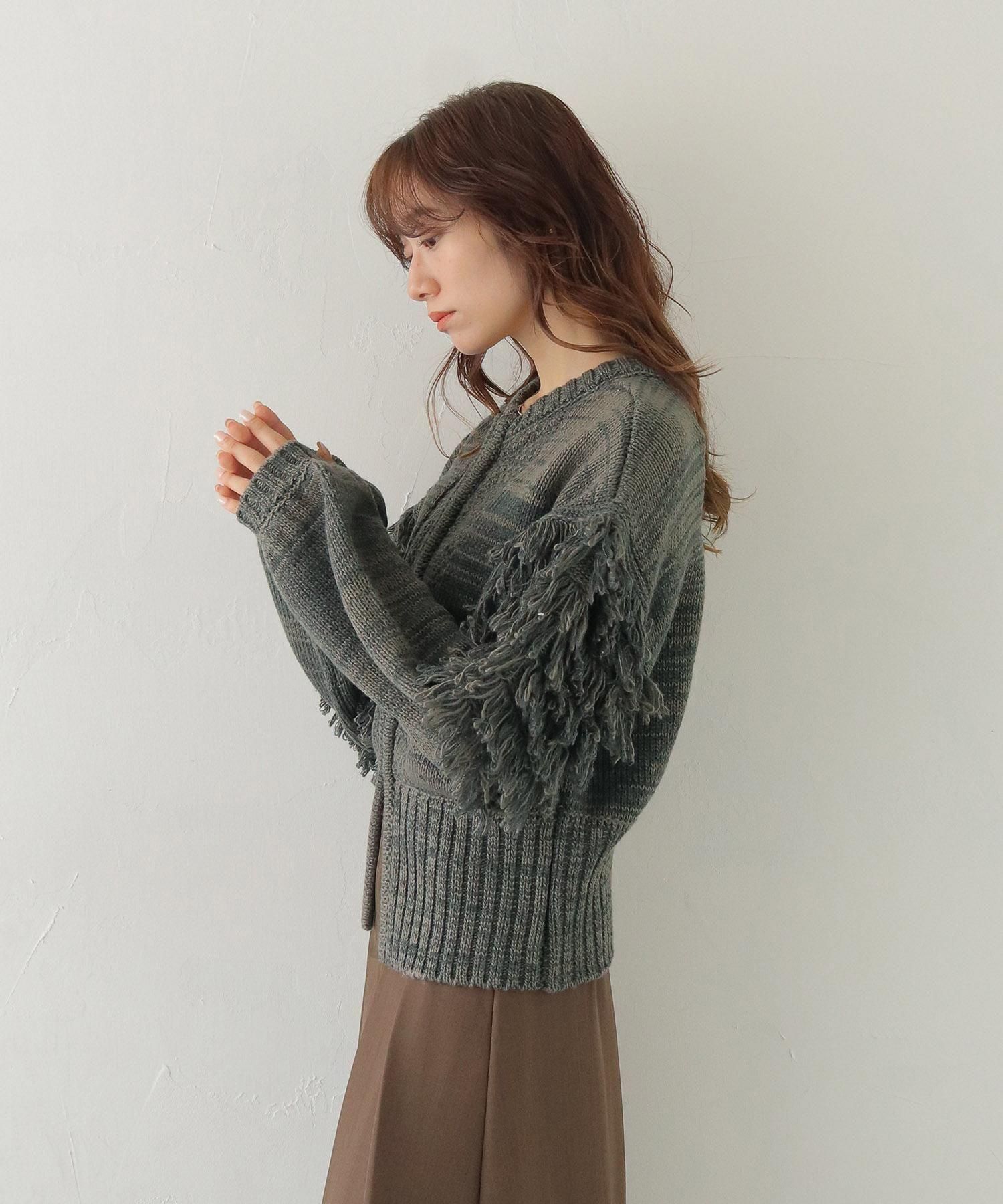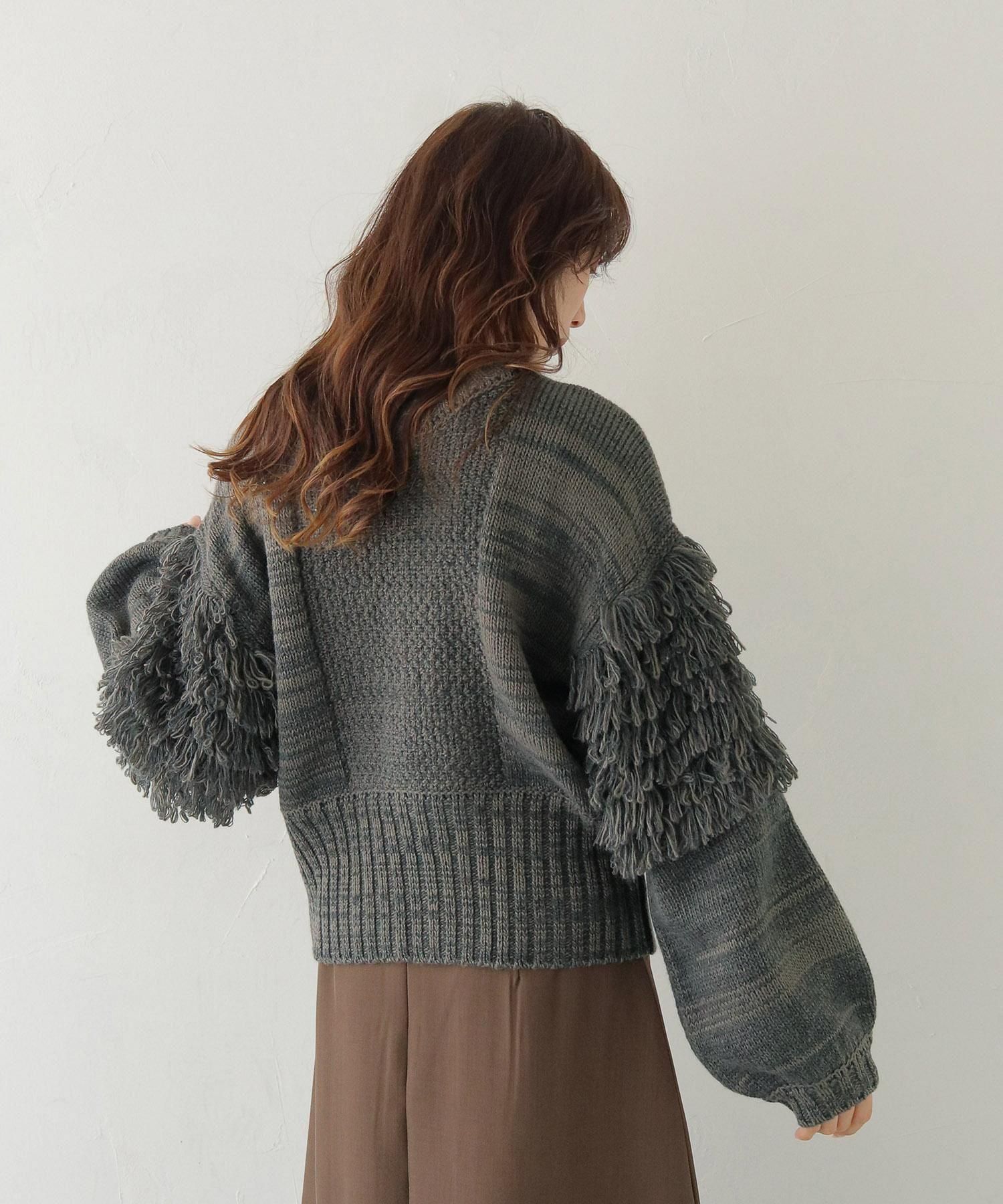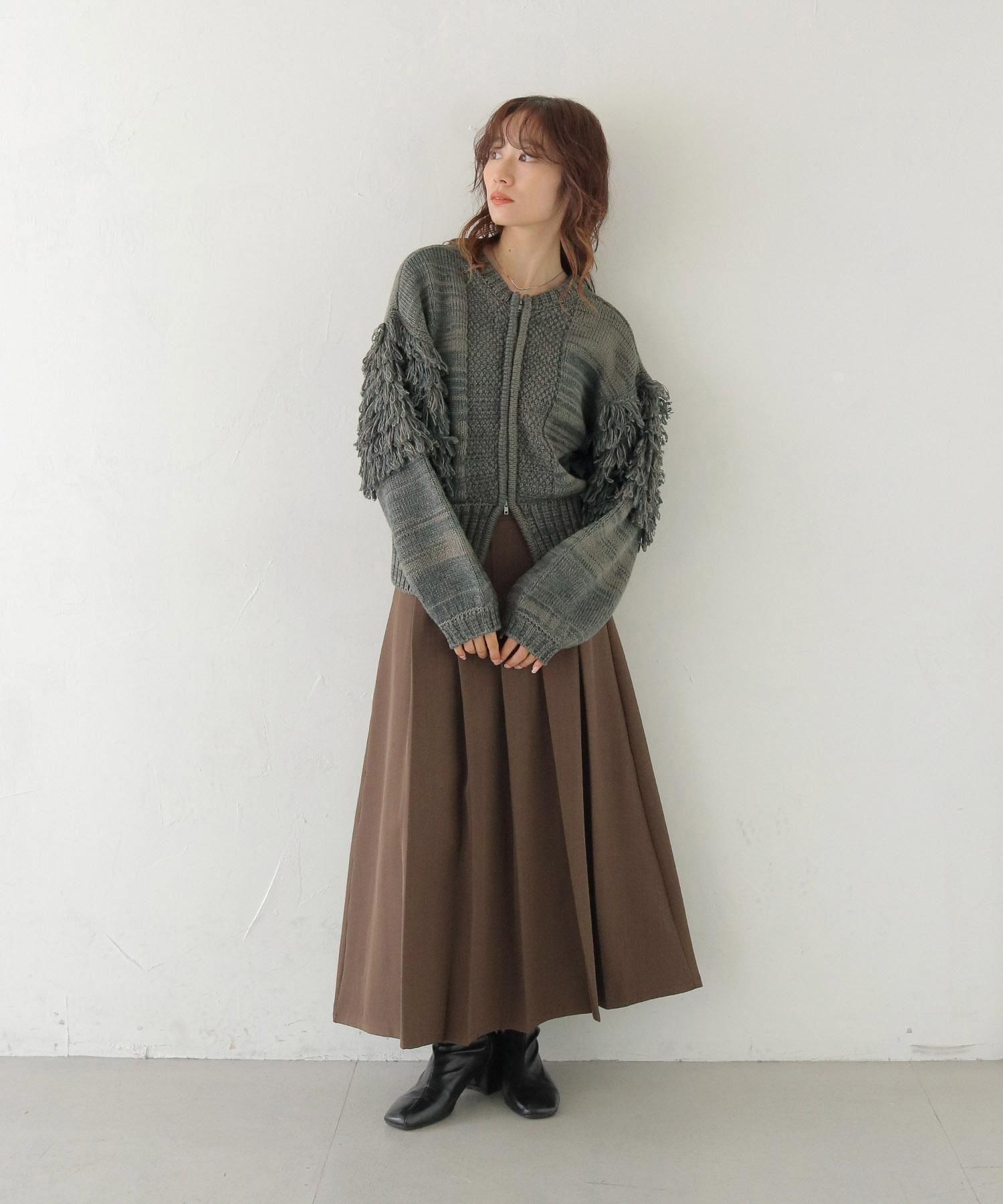 混合糸でのループ編みとジップ下の大きなスリットが特徴で、フリンジ袖のボリューム感も程よくバランスが取れているアイテムです。