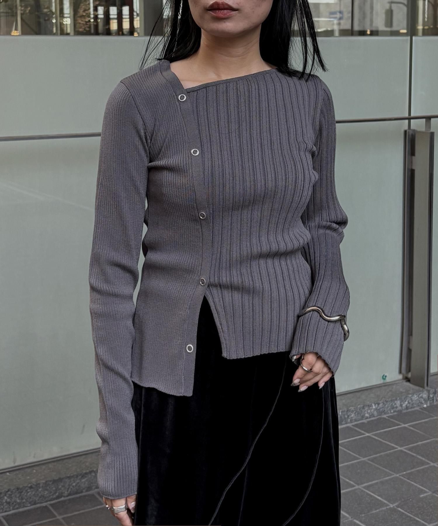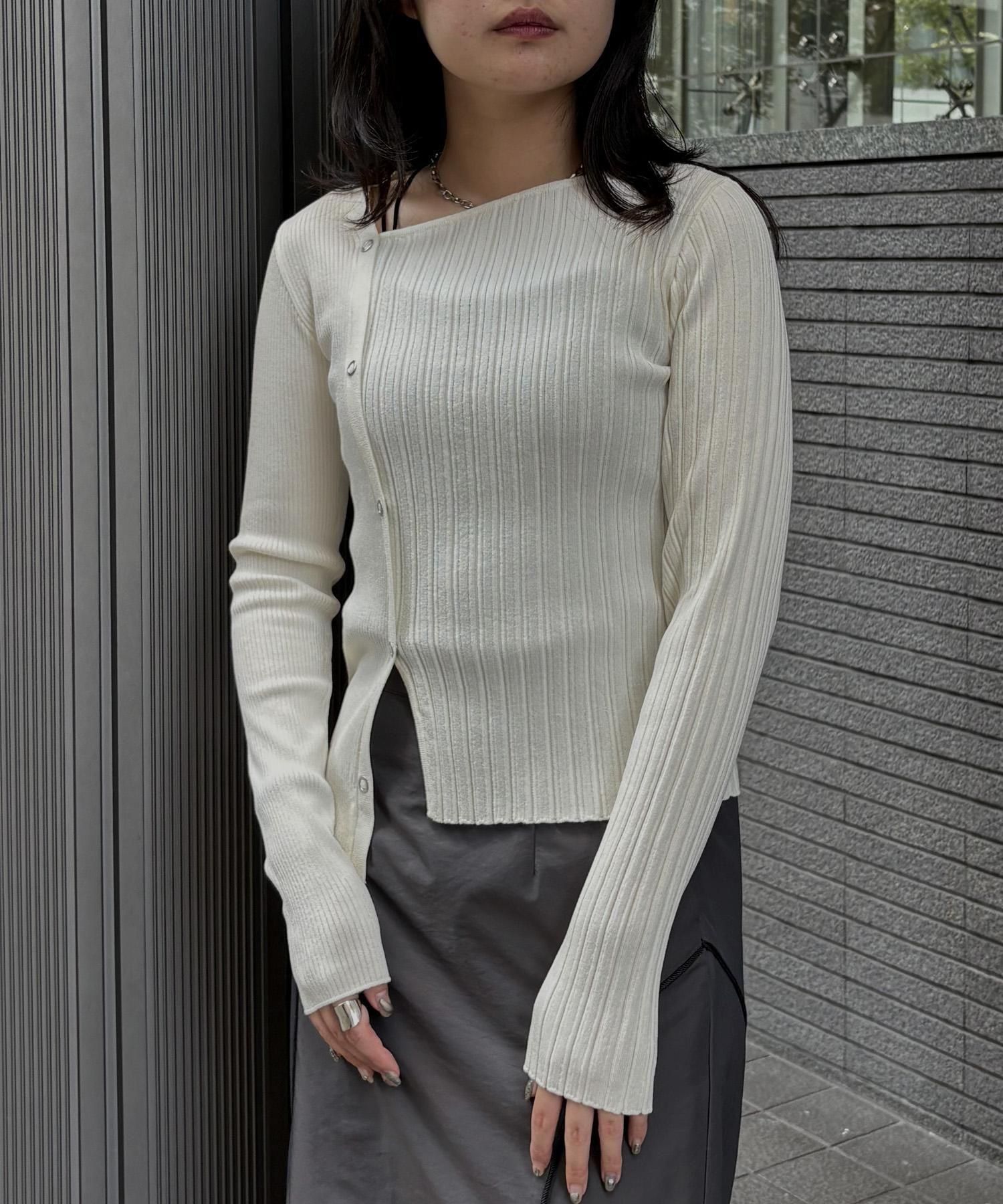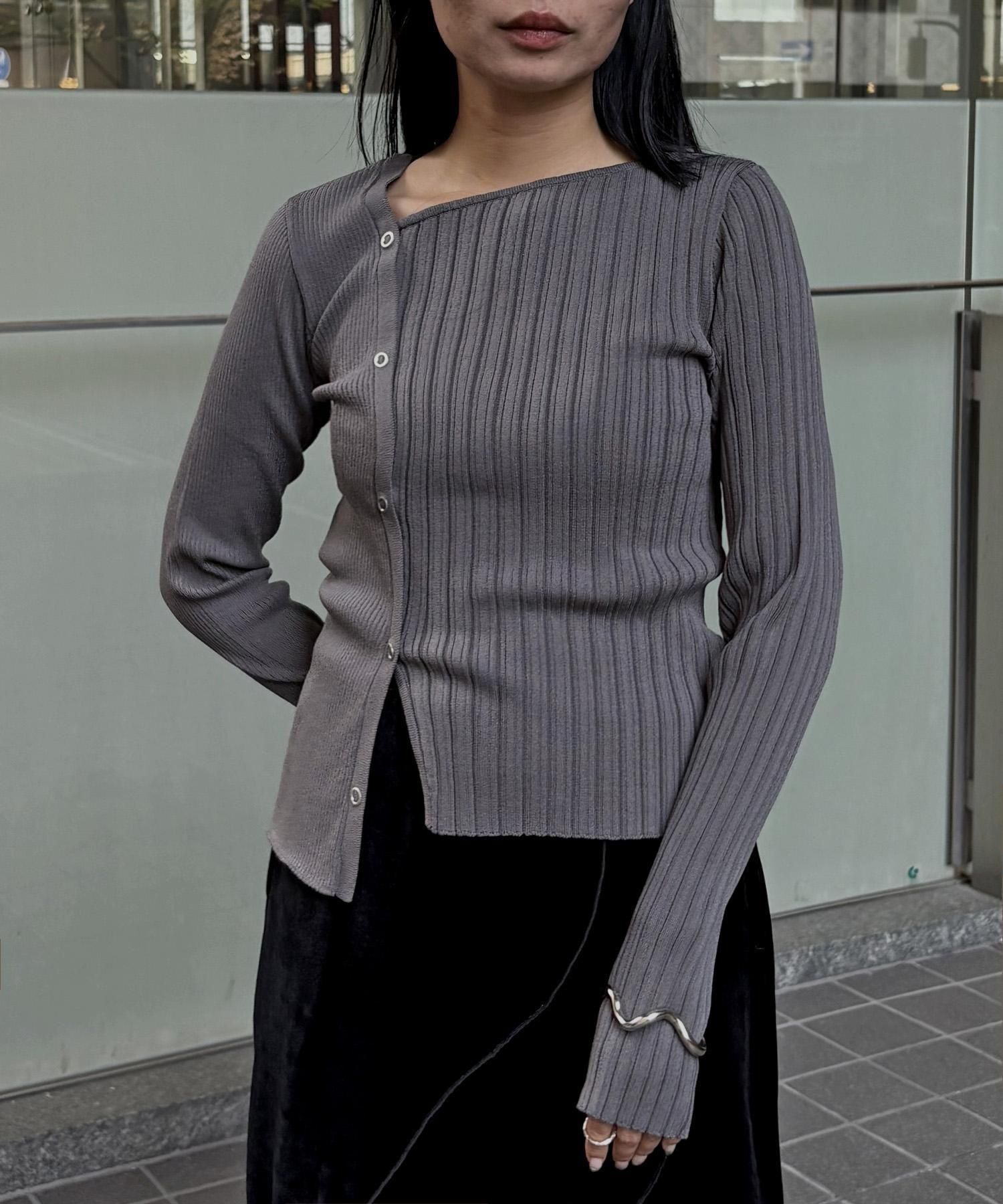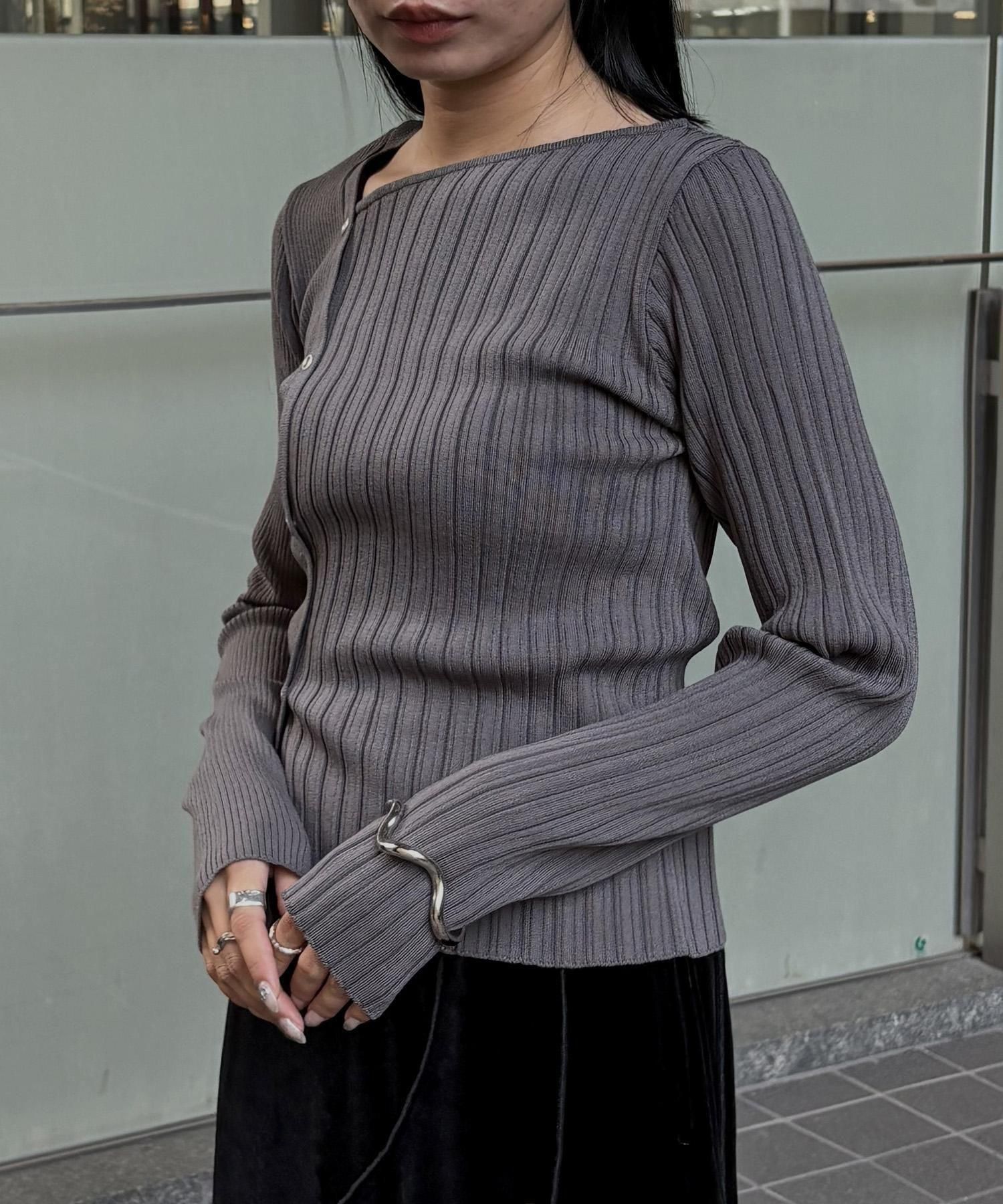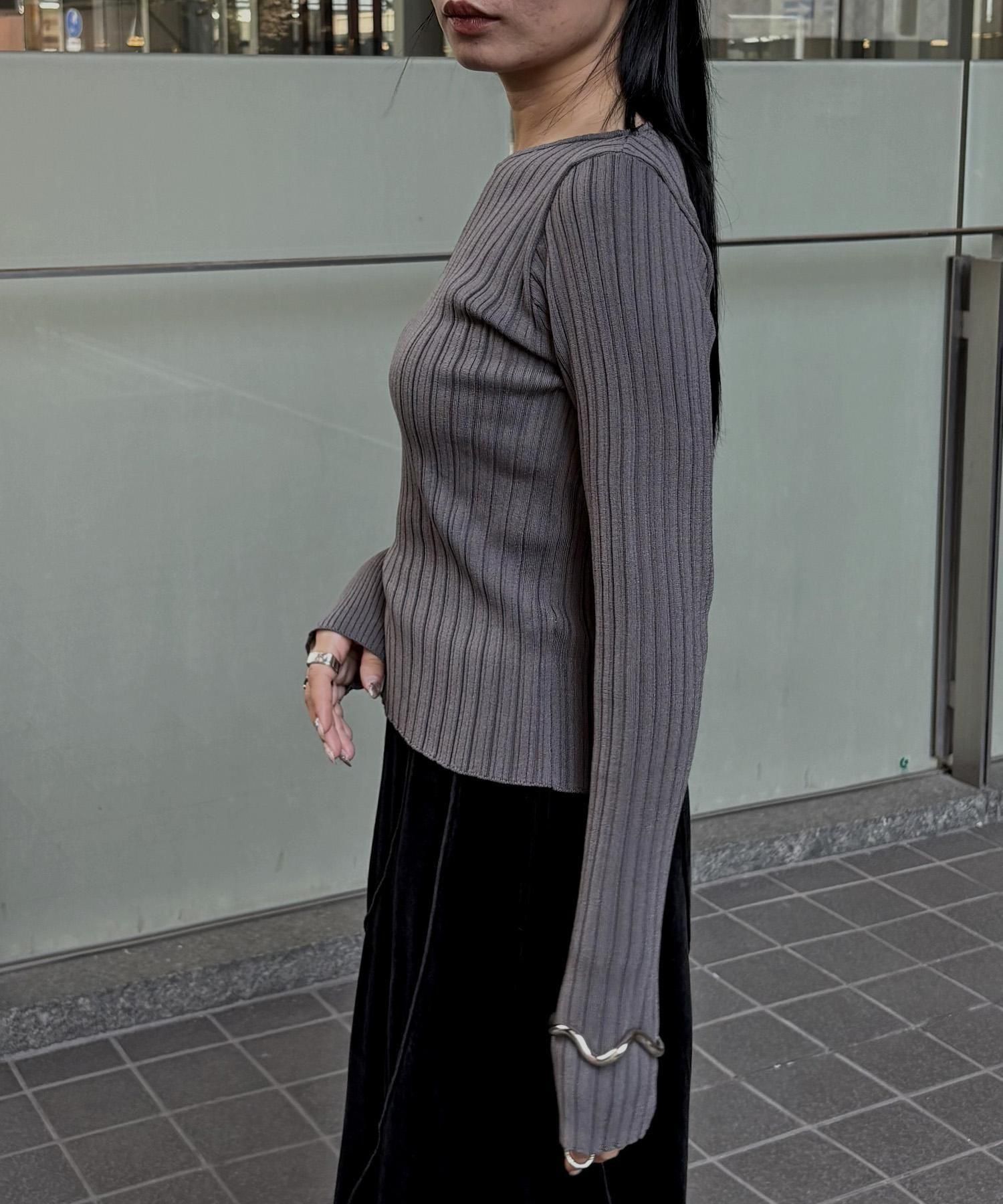 幅の異なるリブを切り替えることで、左右で異なる表情を楽しめるリブニット。