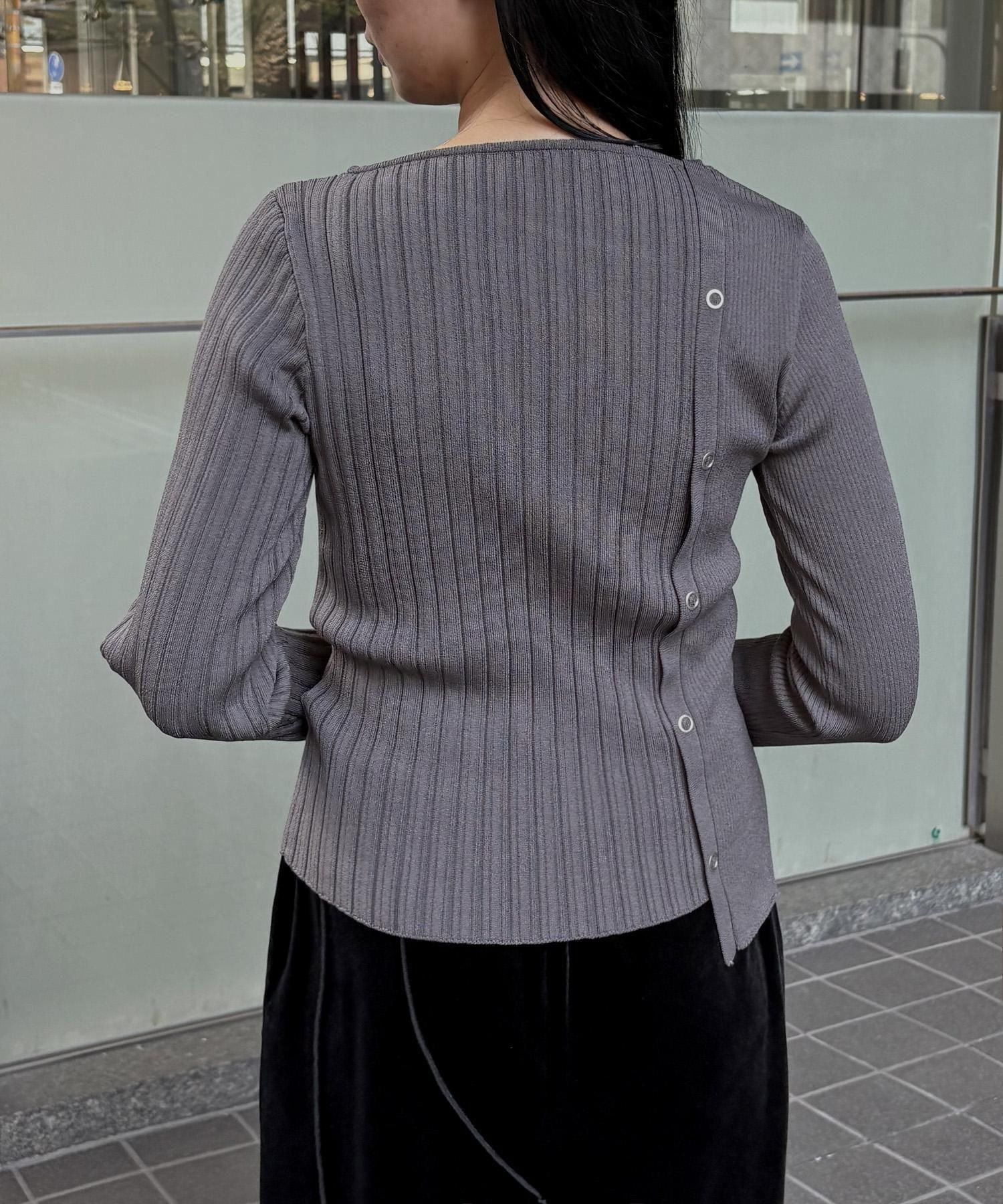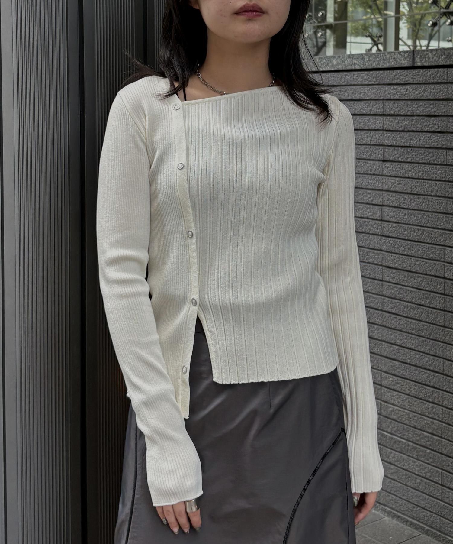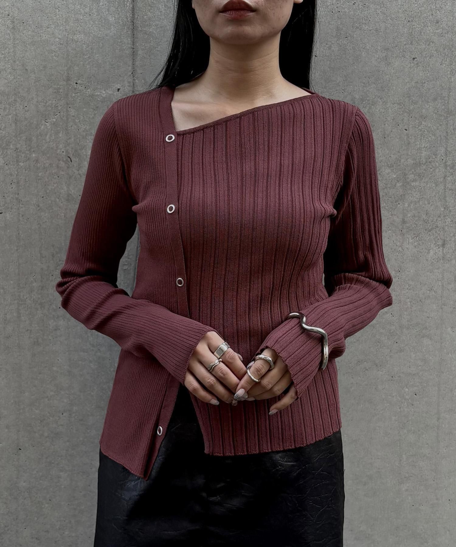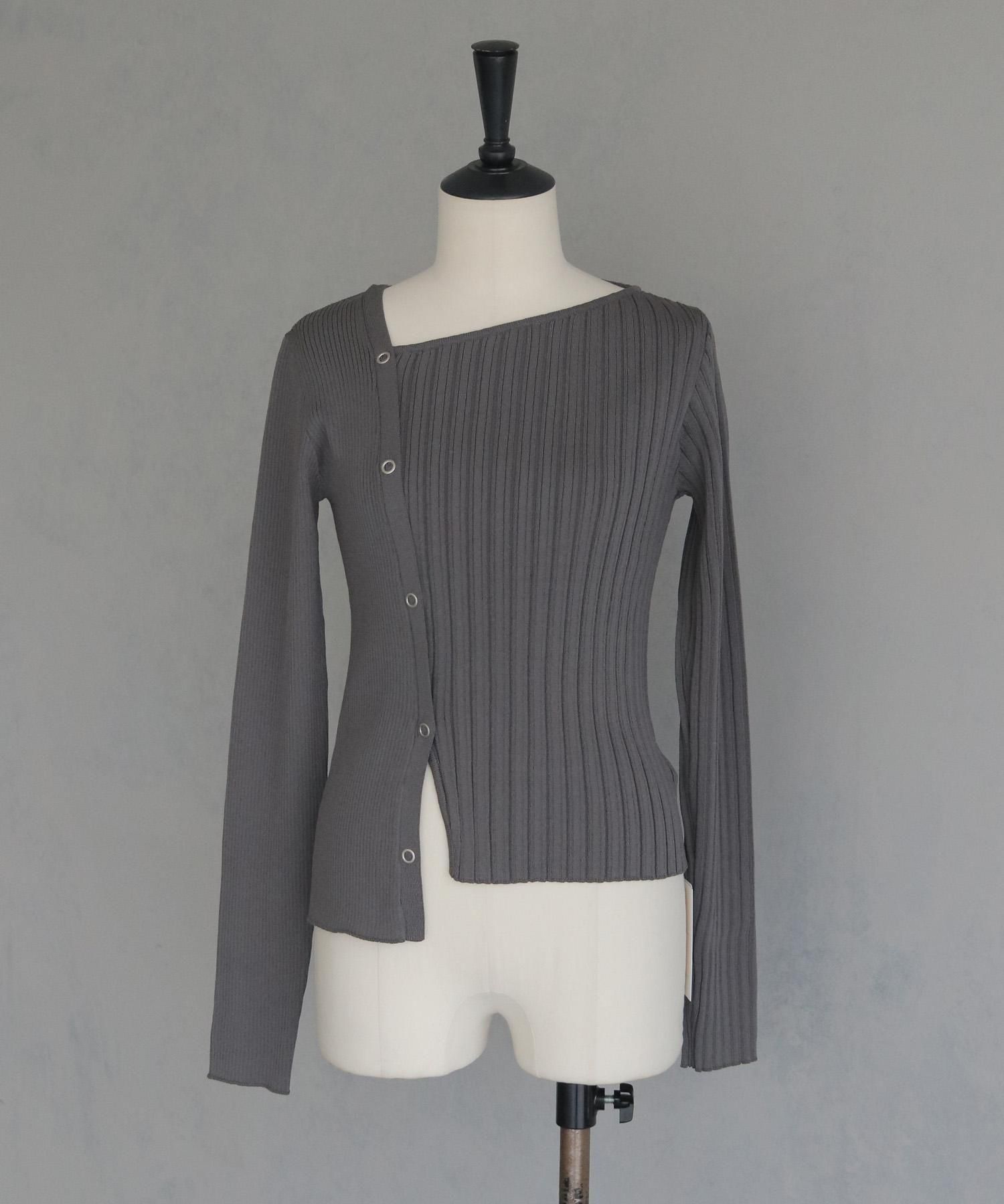 幅の異なるリブを切り替えることで、左右で異なる表情を楽しめるリブニット。