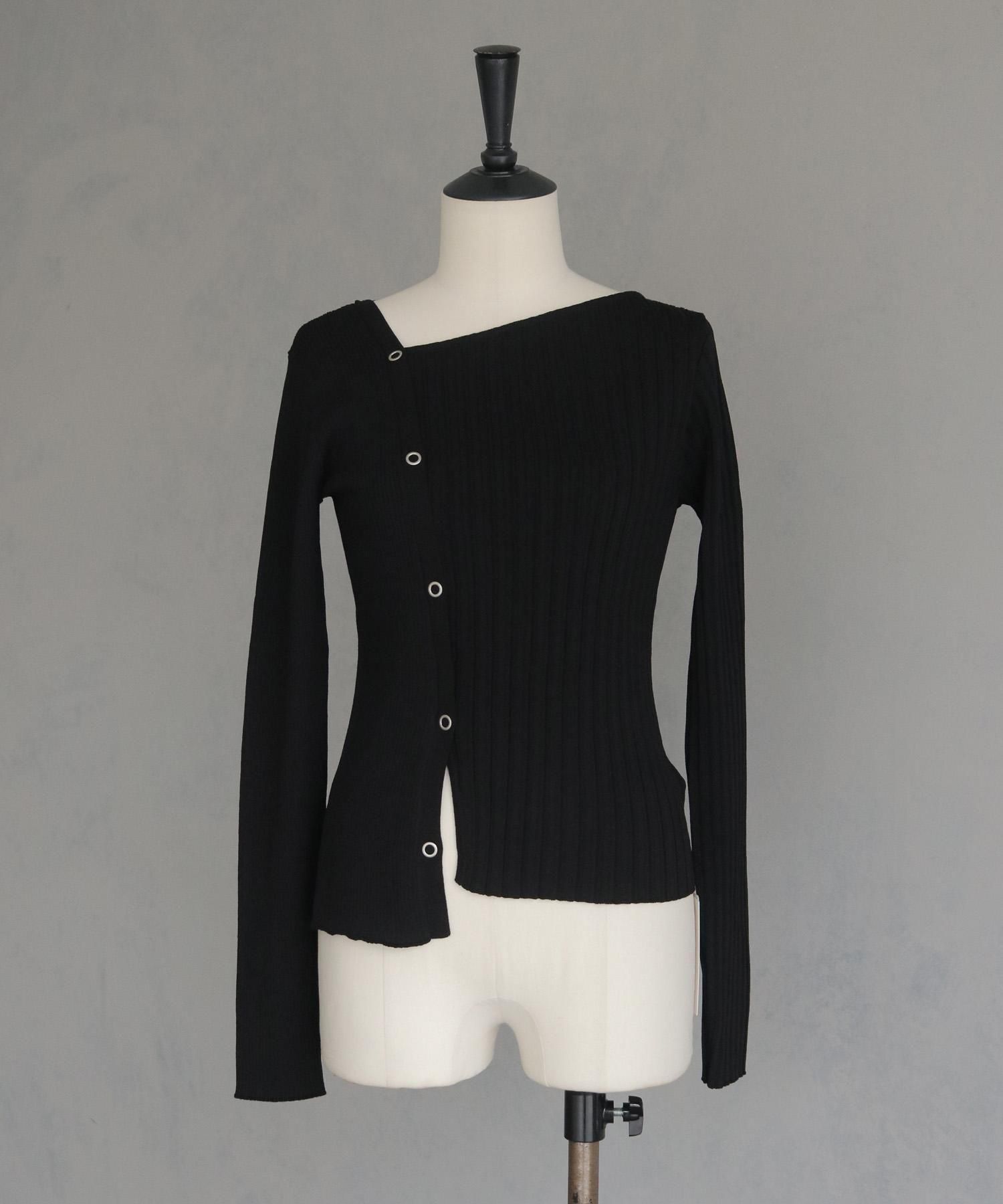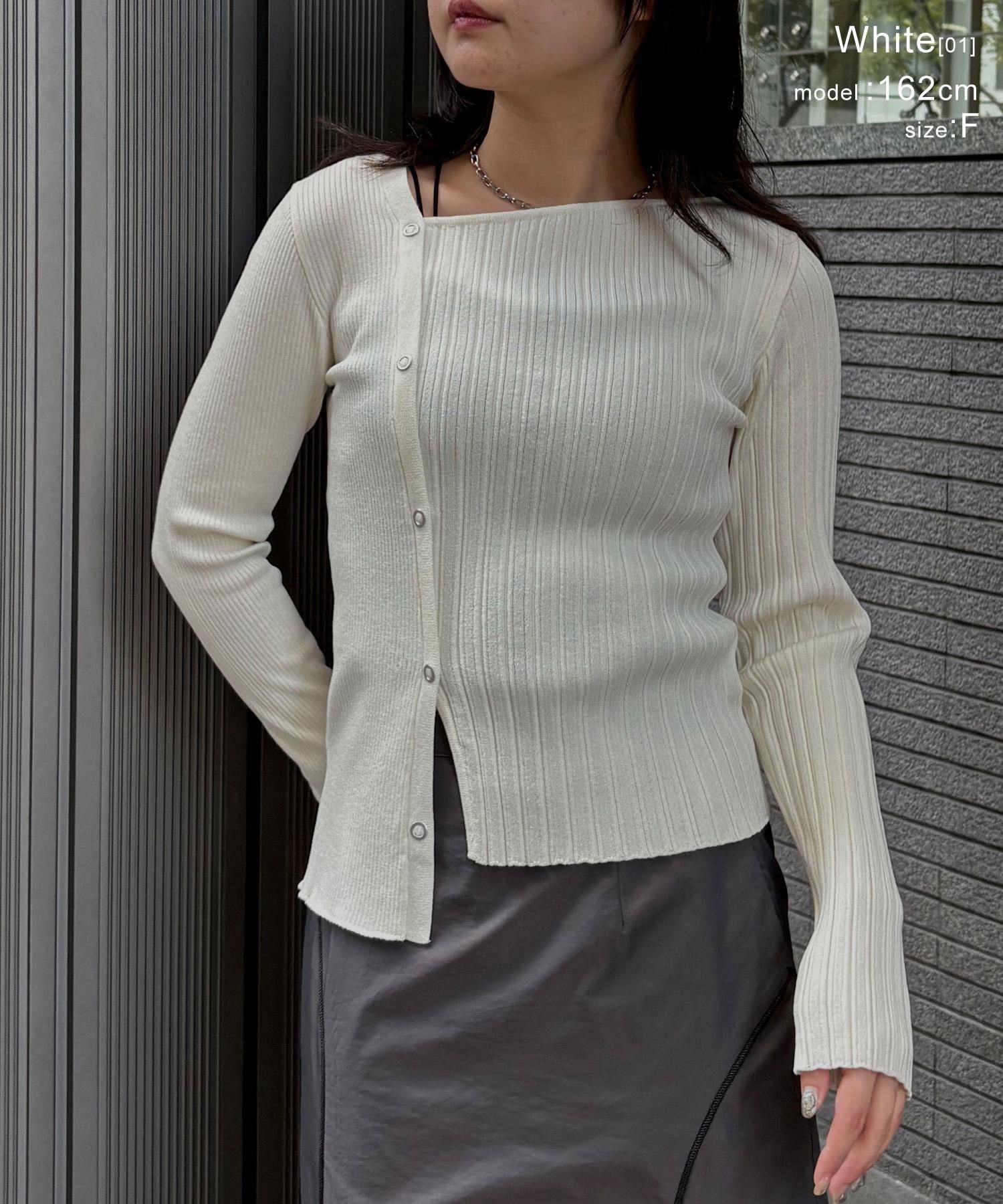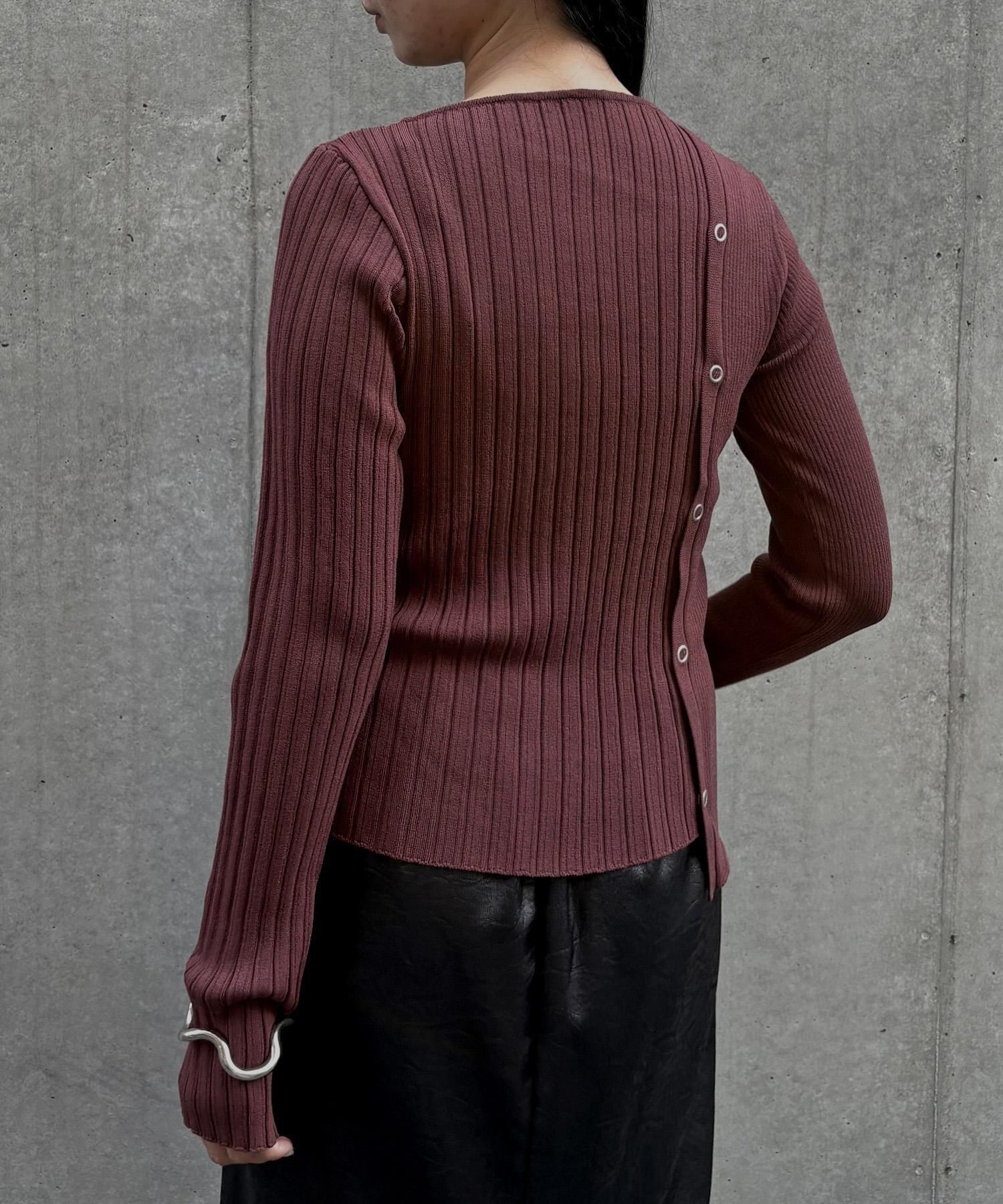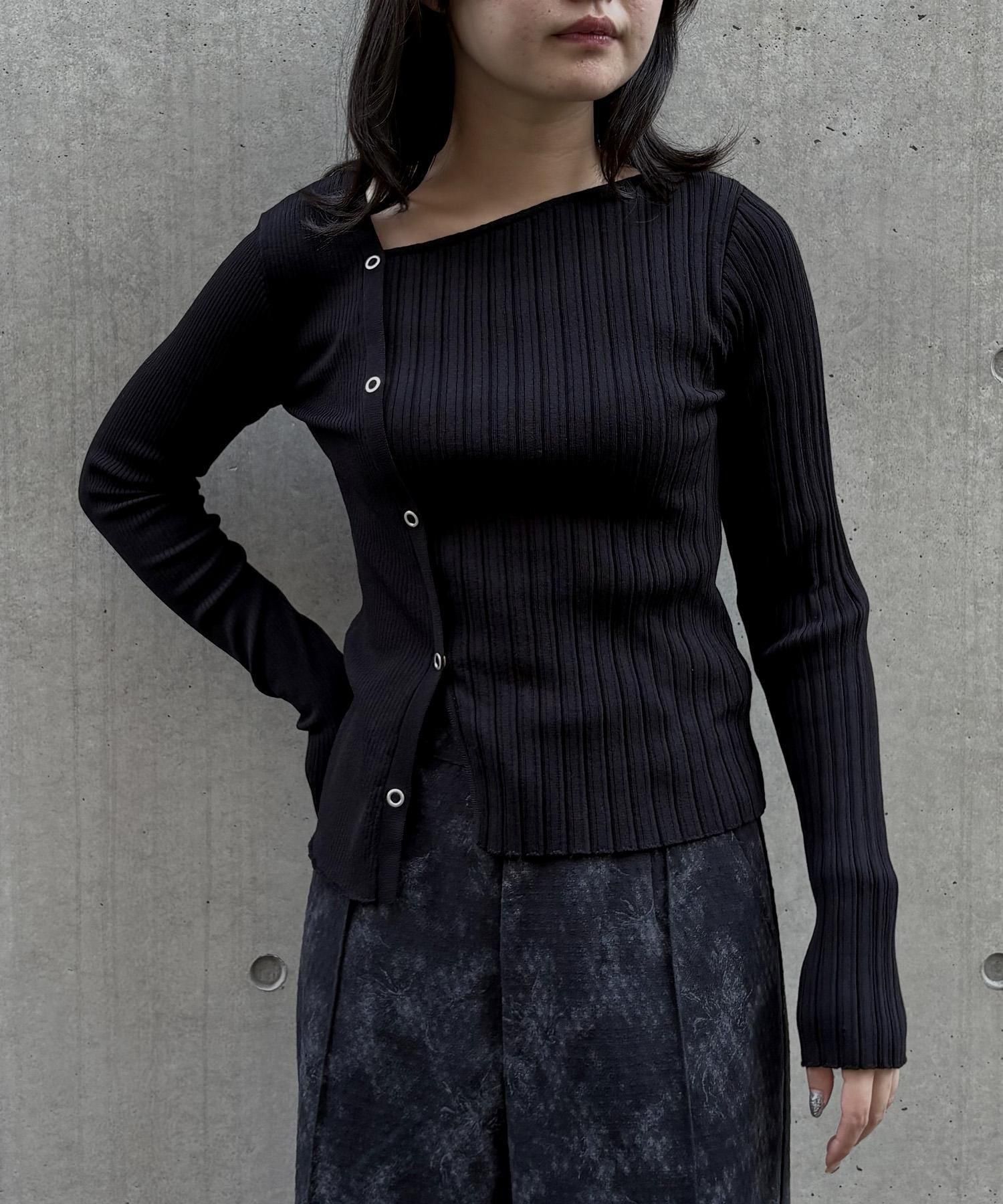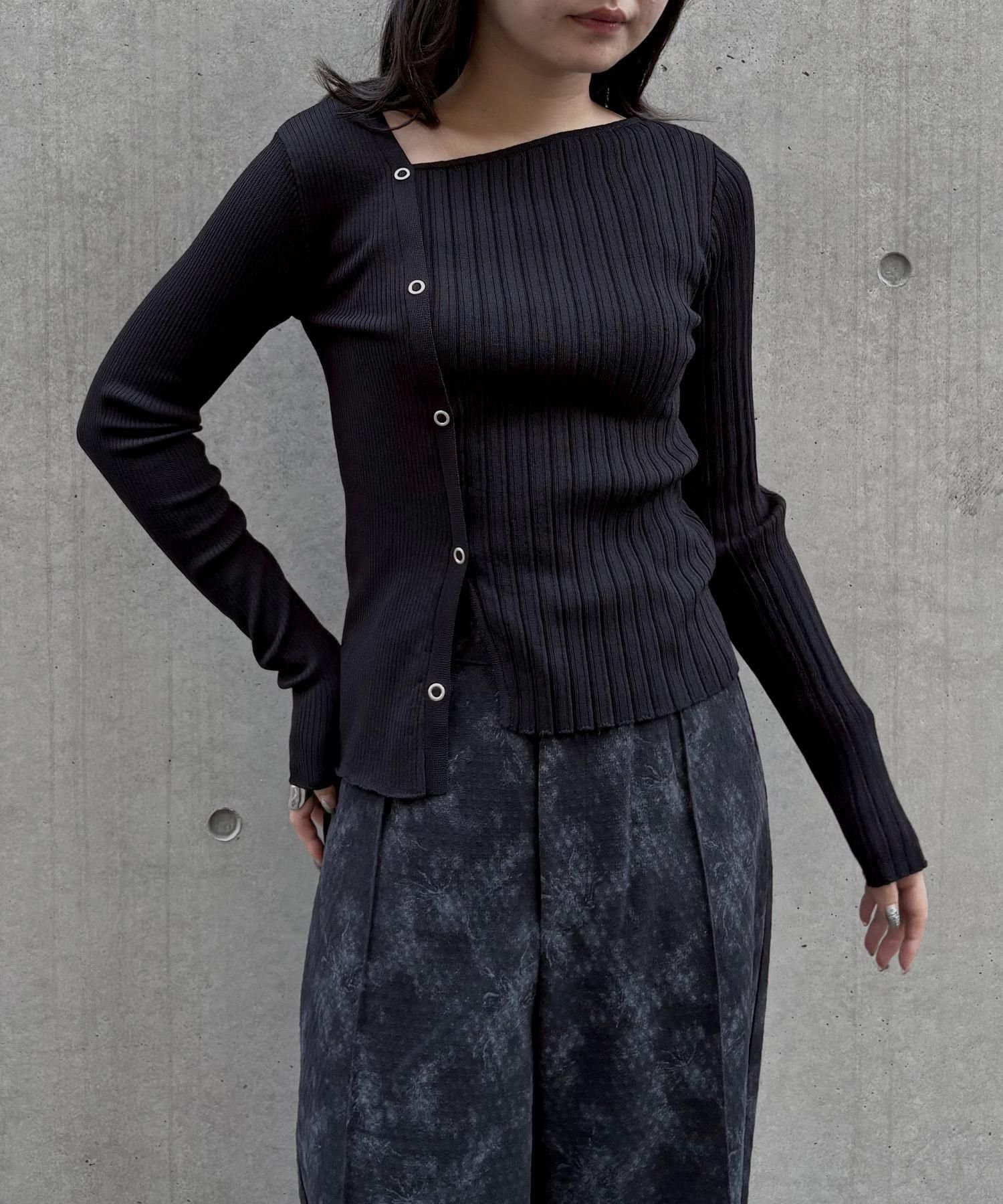 幅の異なるリブを切り替えることで、左右で異なる表情を楽しめるリブニット。