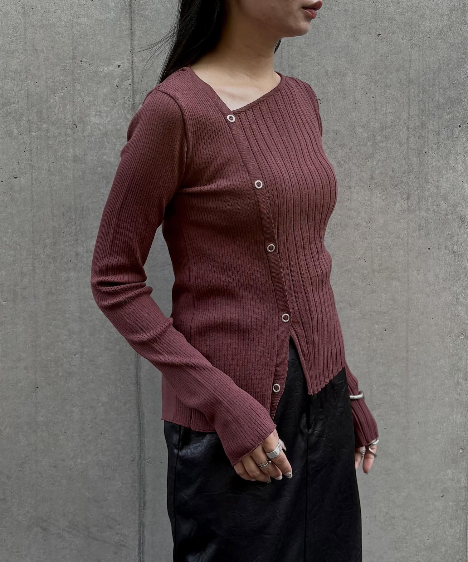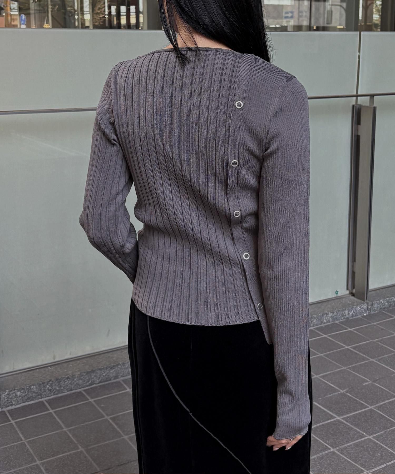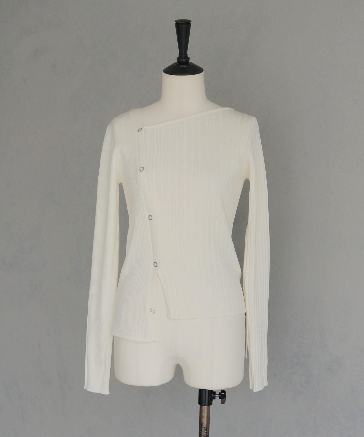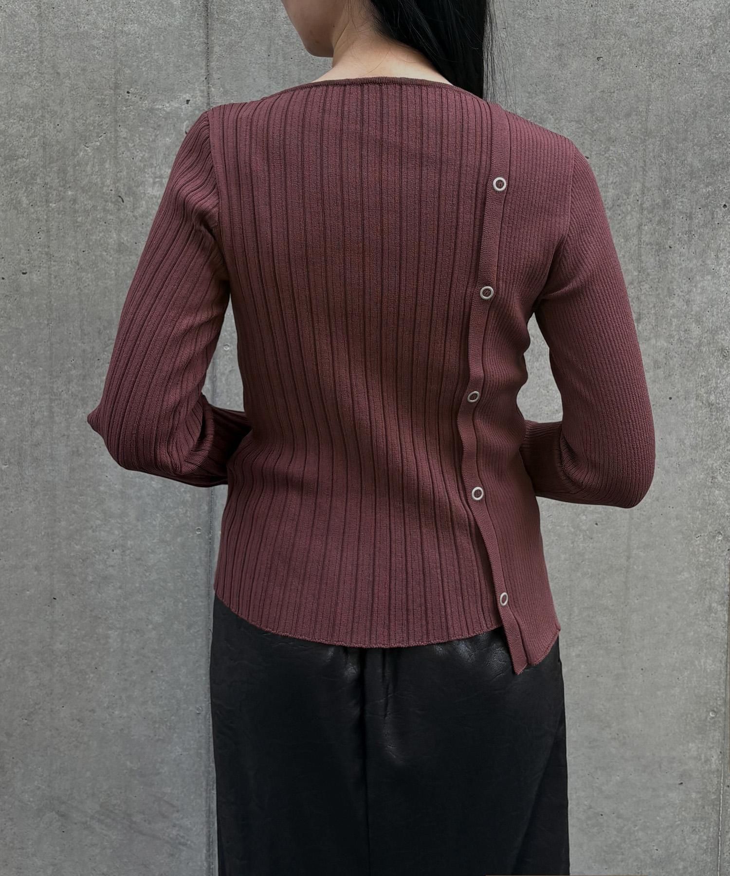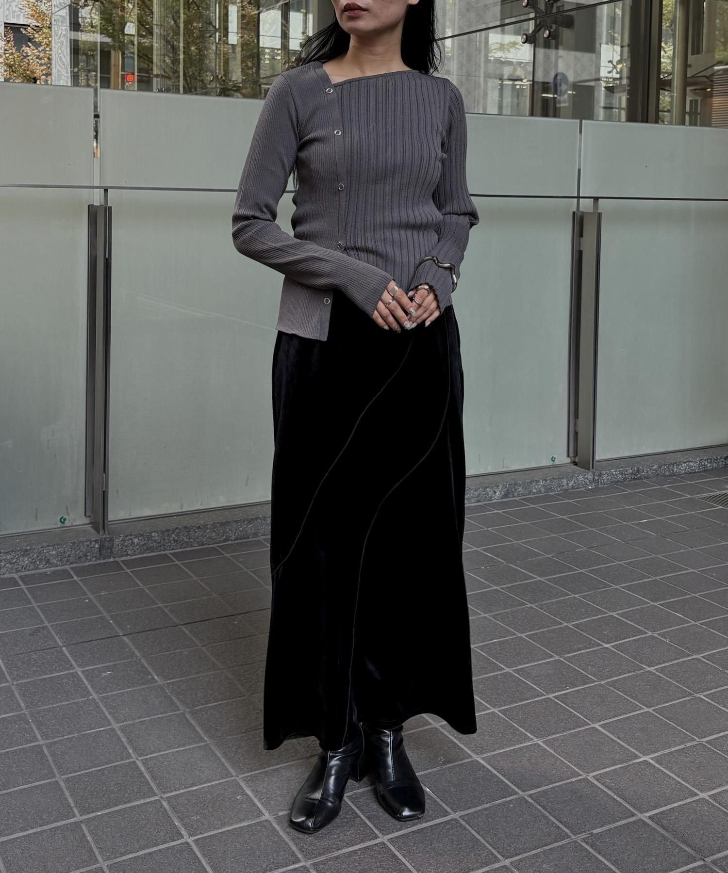 幅の異なるリブを切り替えることで、左右で異なる表情を楽しめるリブニット。