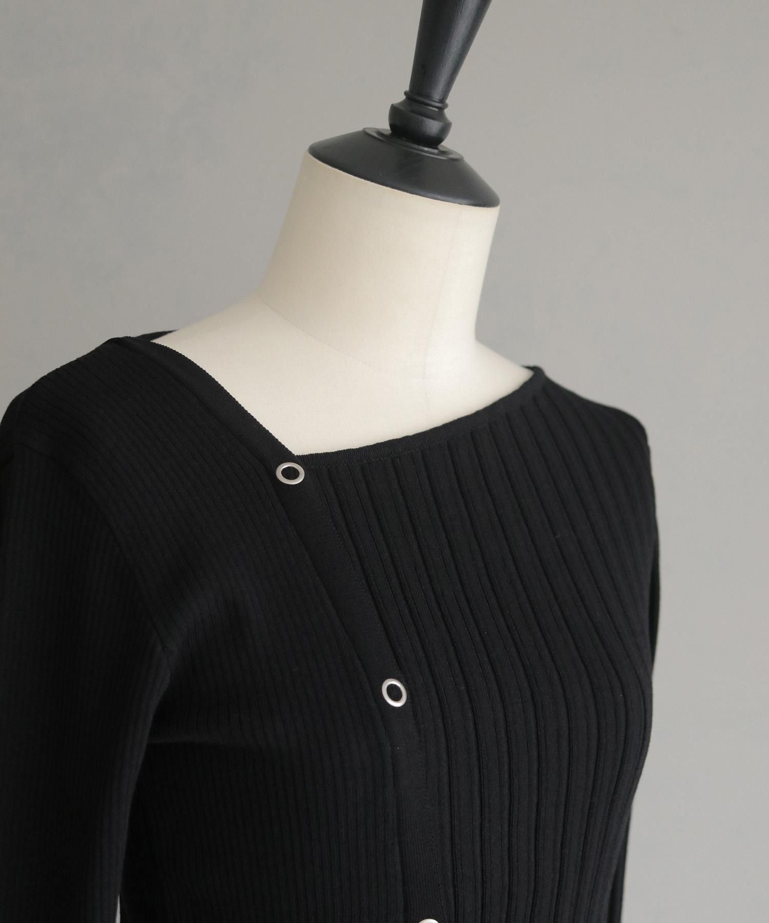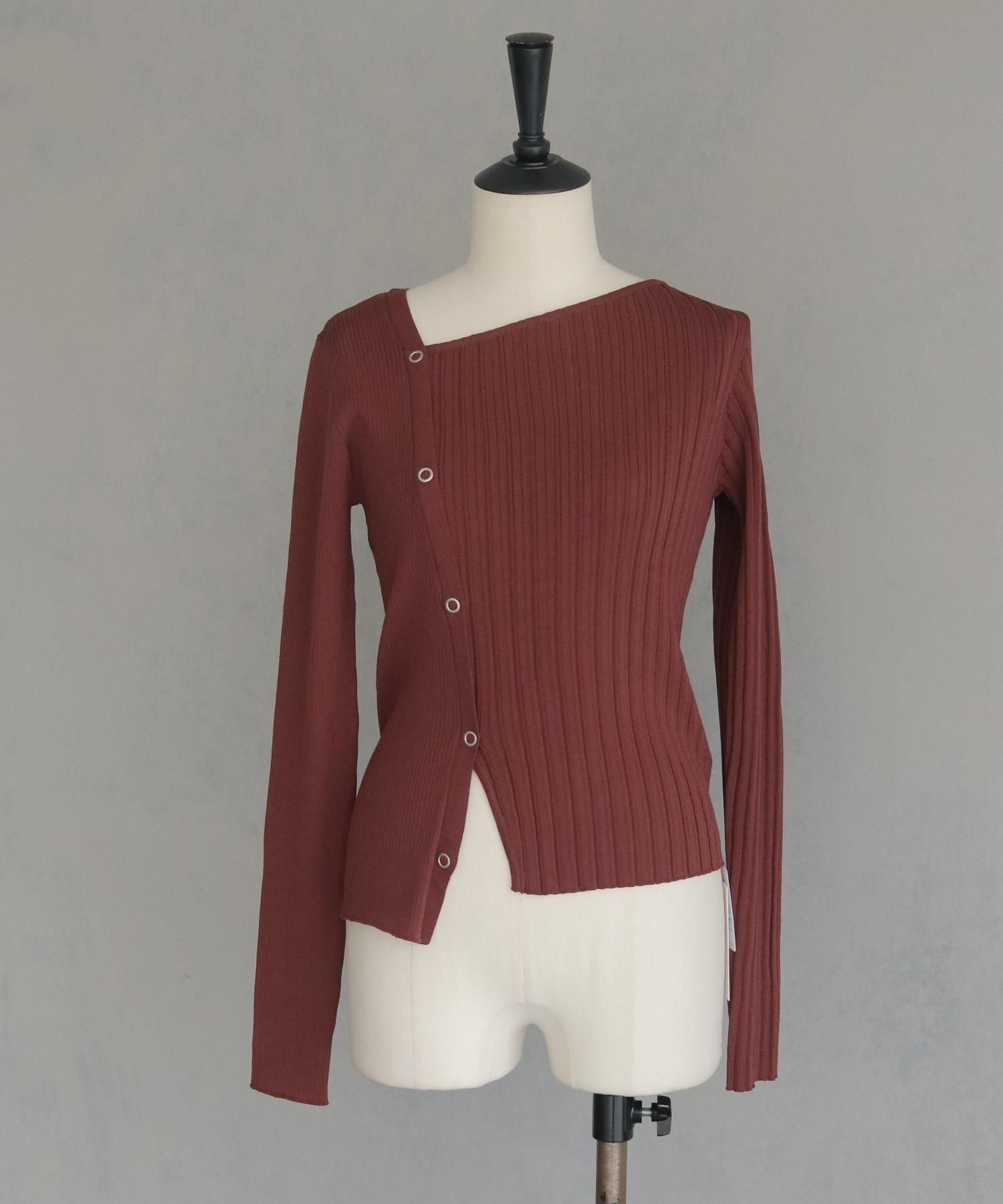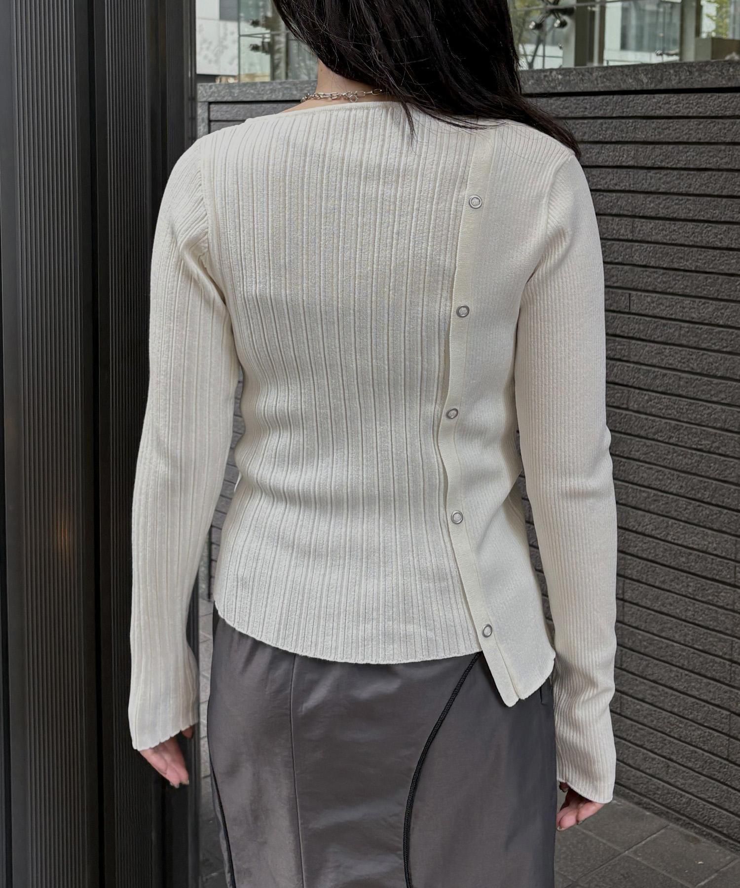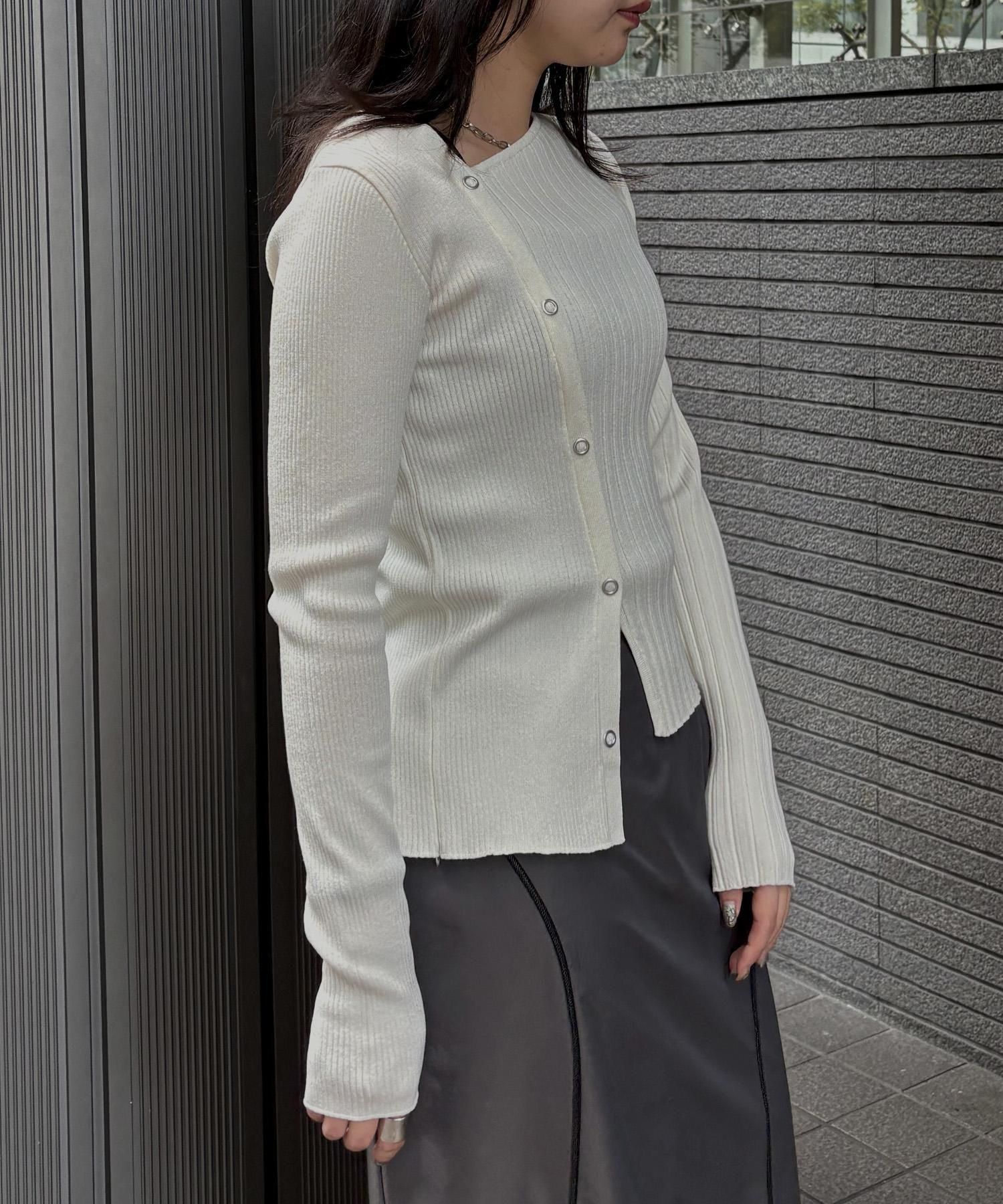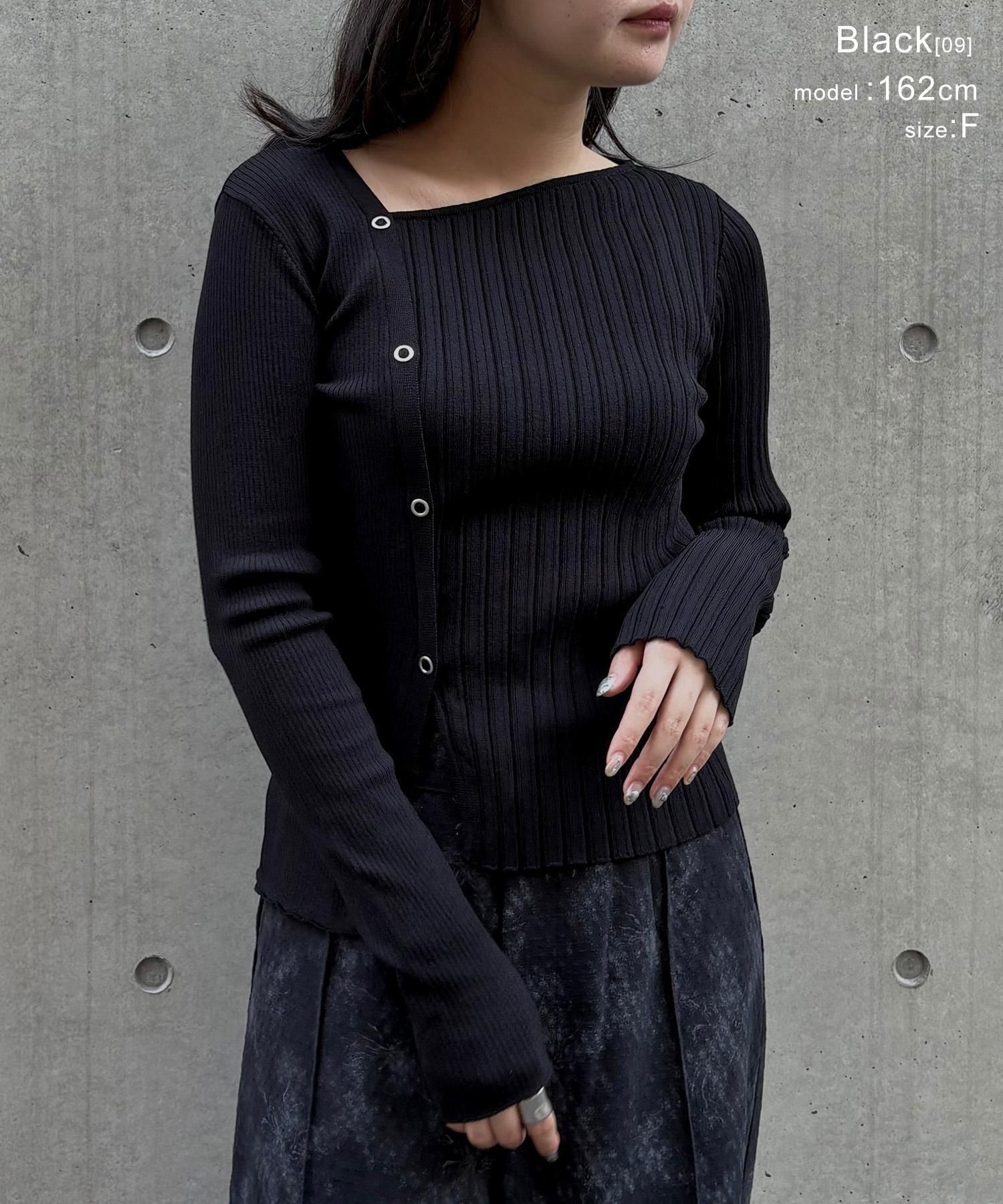 幅の異なるリブを切り替えることで、左右で異なる表情を楽しめるリブニット。