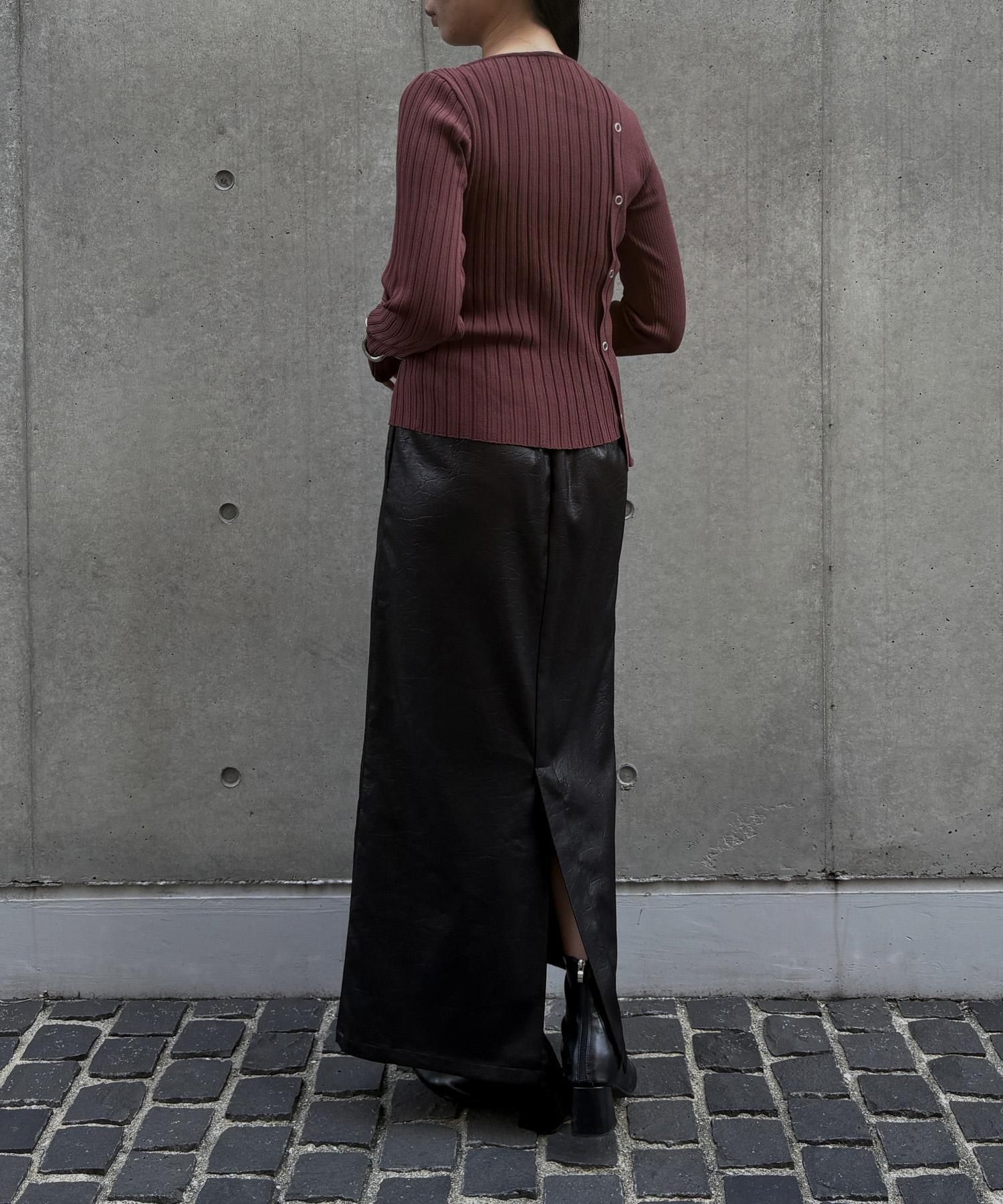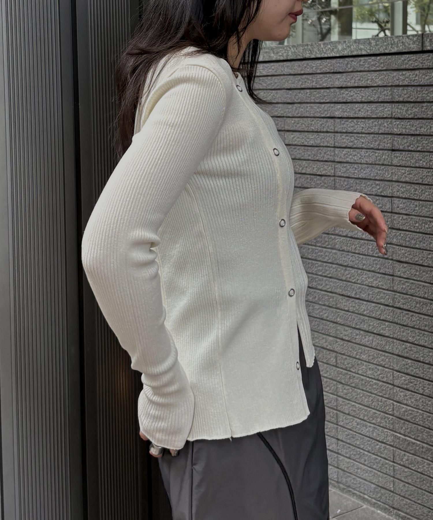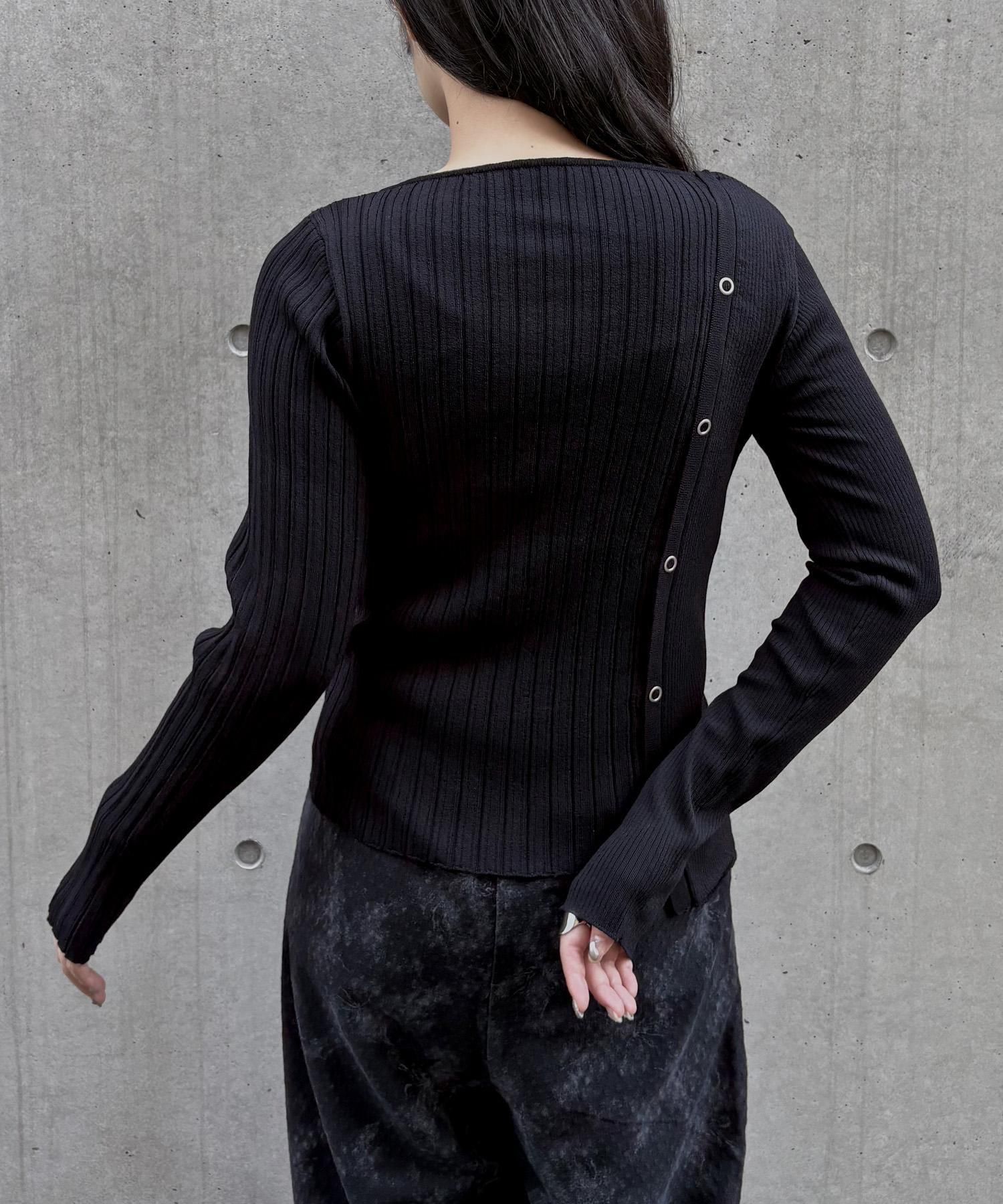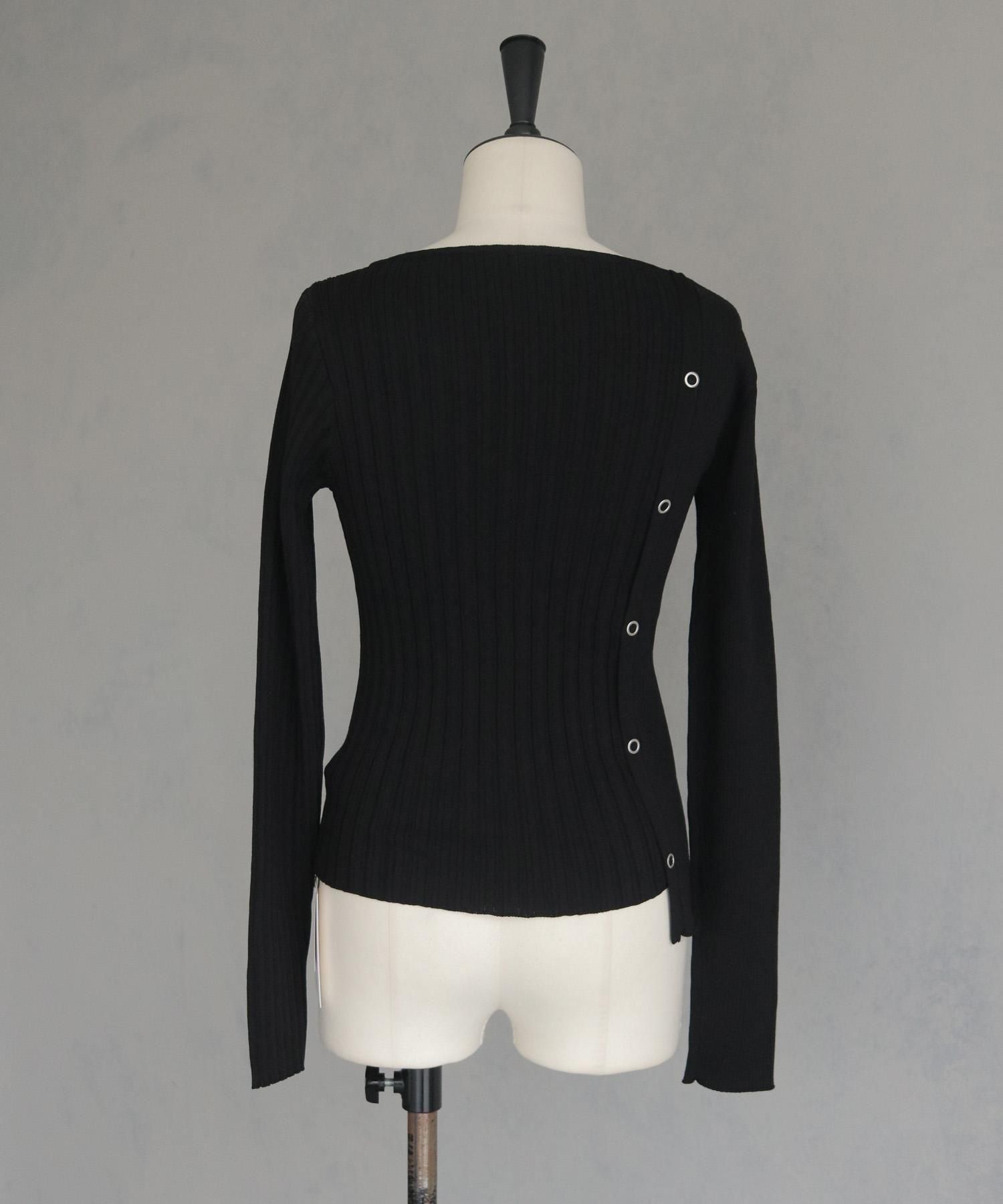 幅の異なるリブを切り替えることで、左右で異なる表情を楽しめるリブニット。