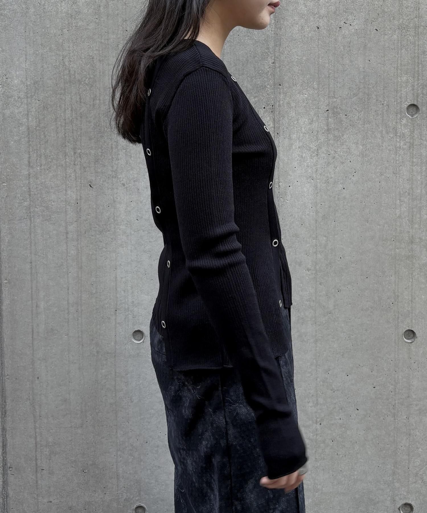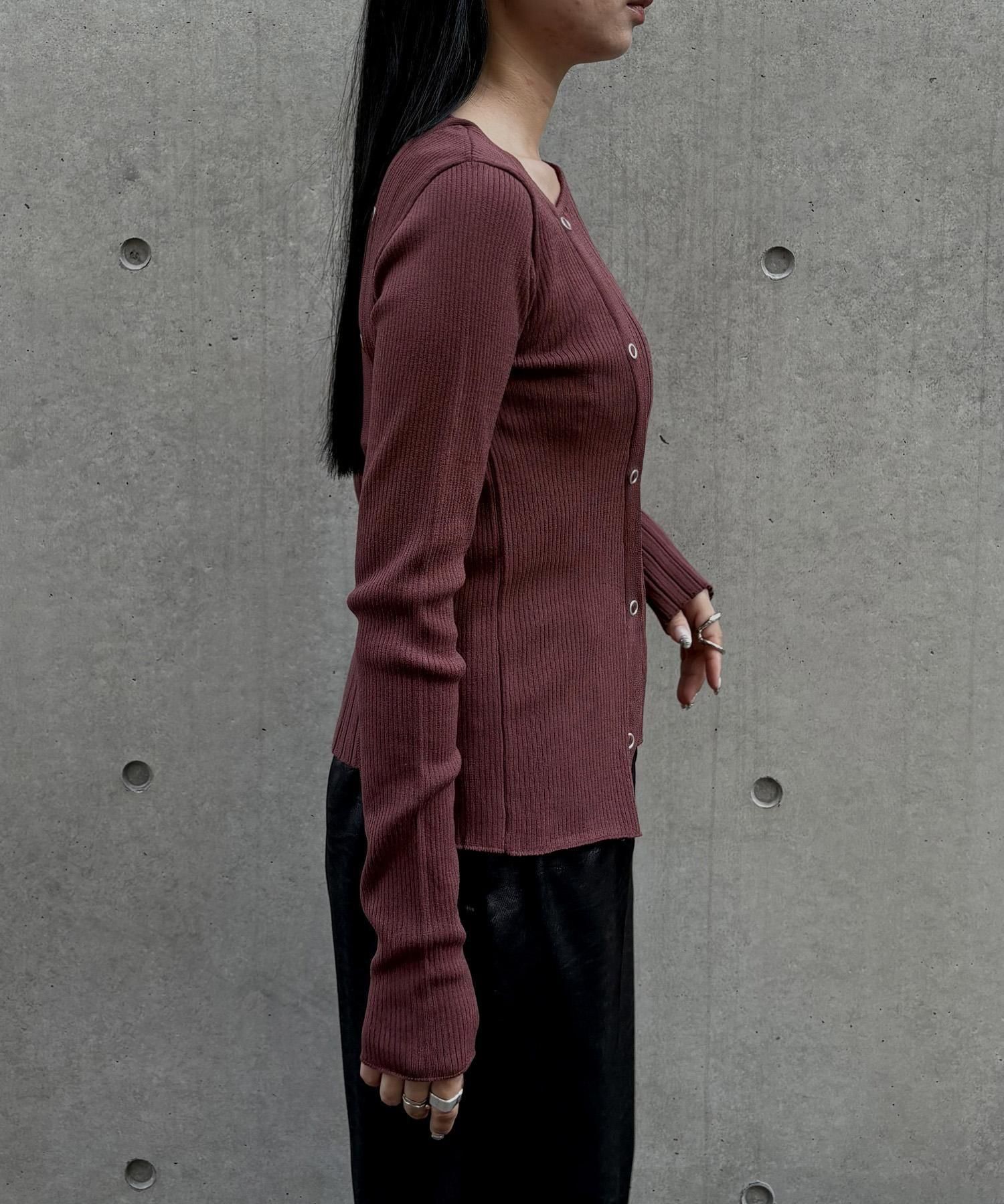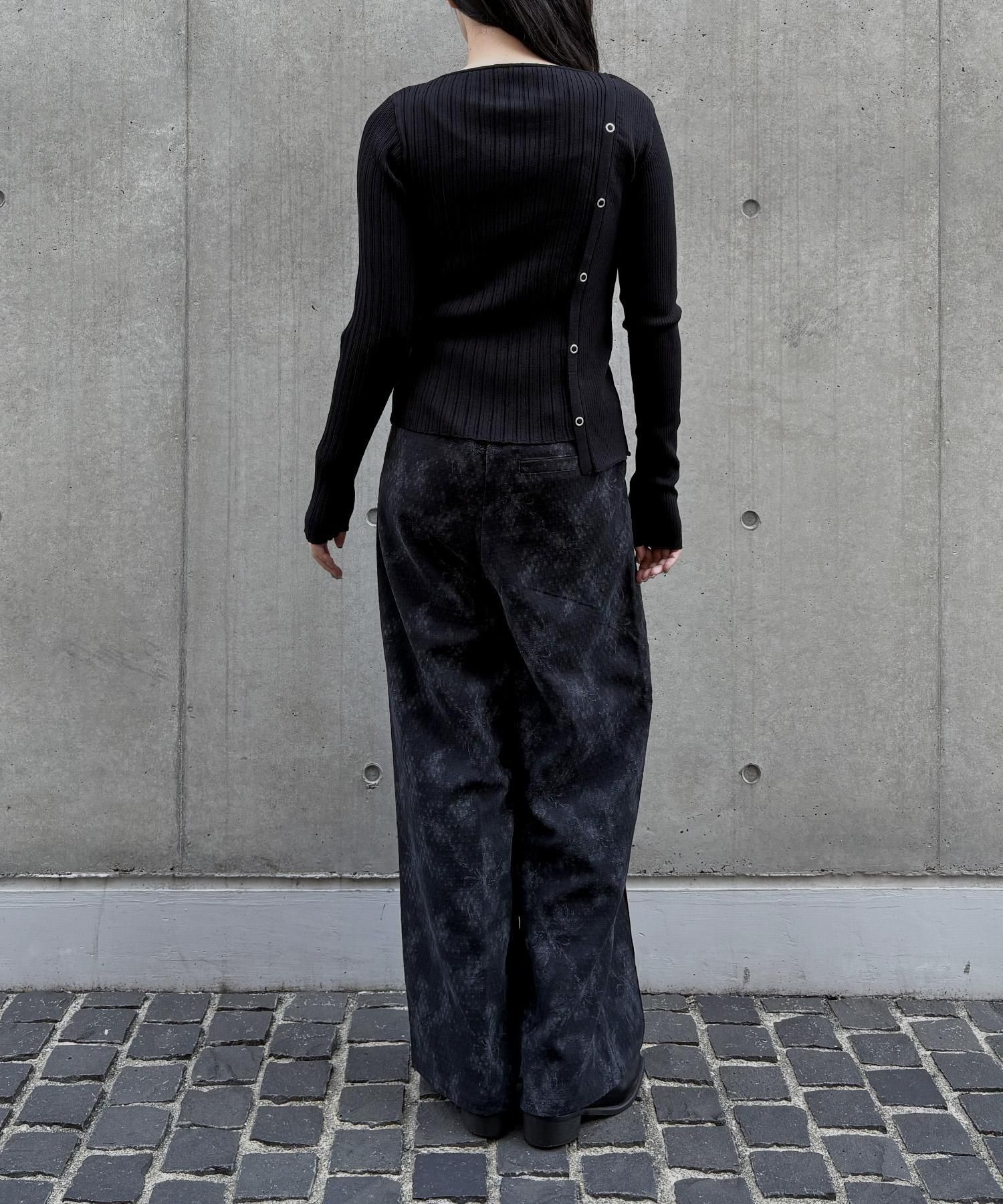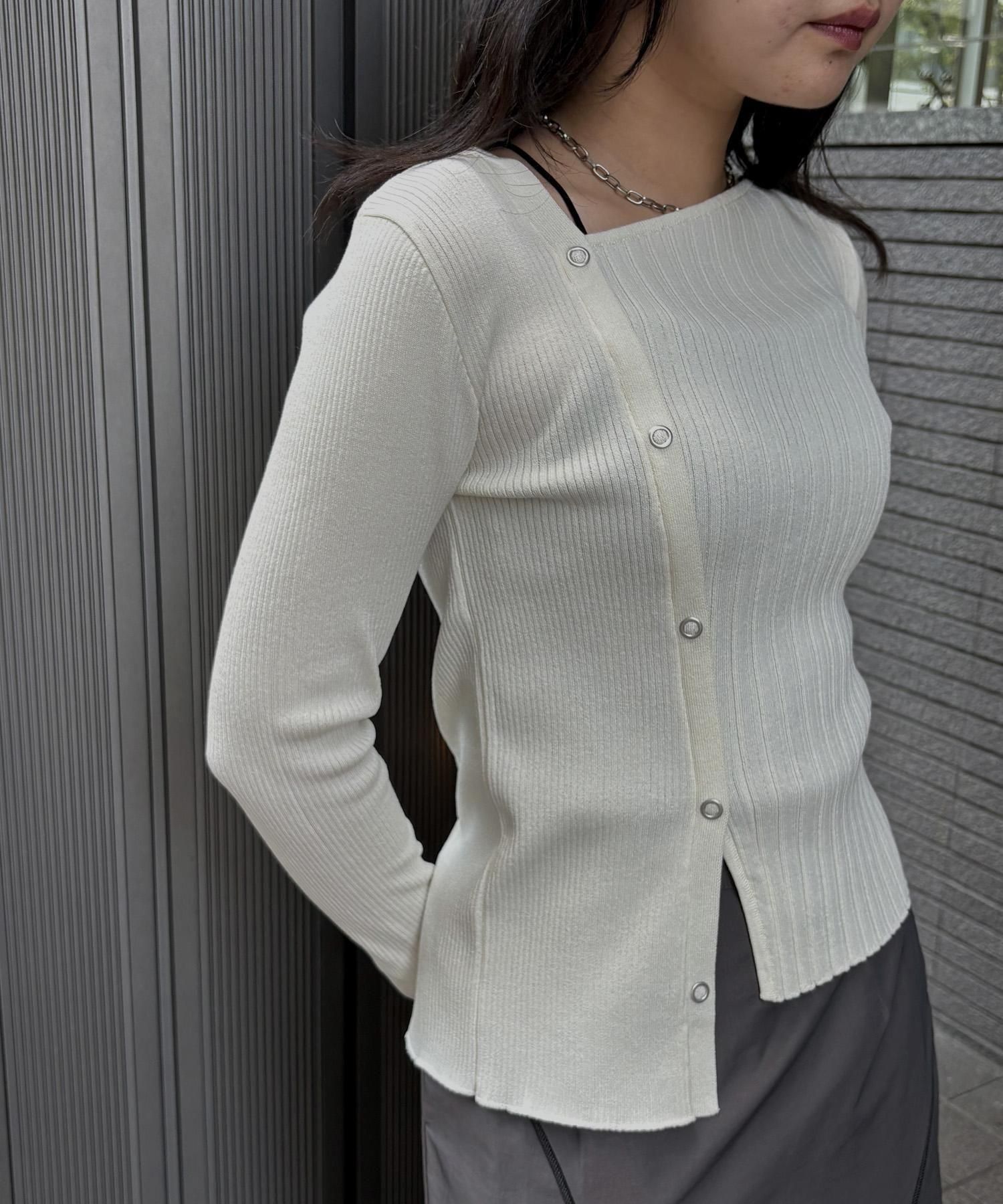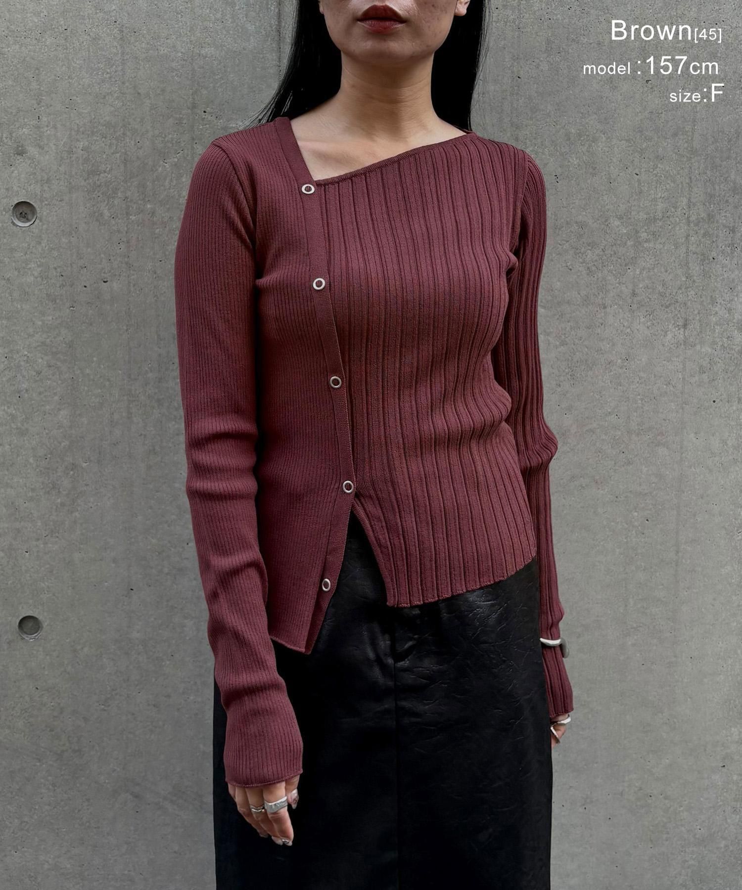 幅の異なるリブを切り替えることで、左右で異なる表情を楽しめるリブニット。