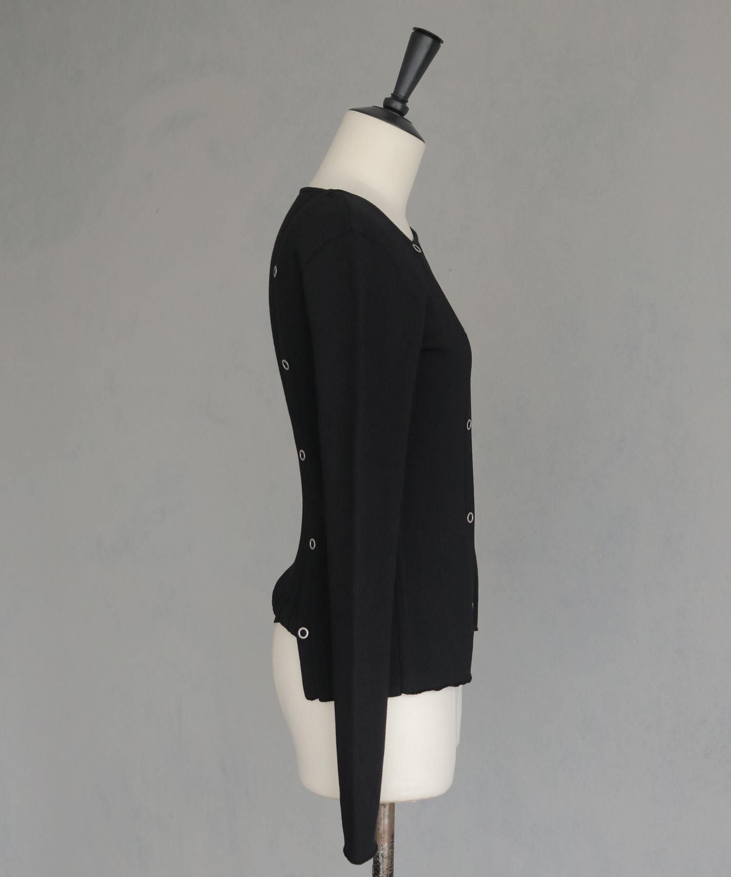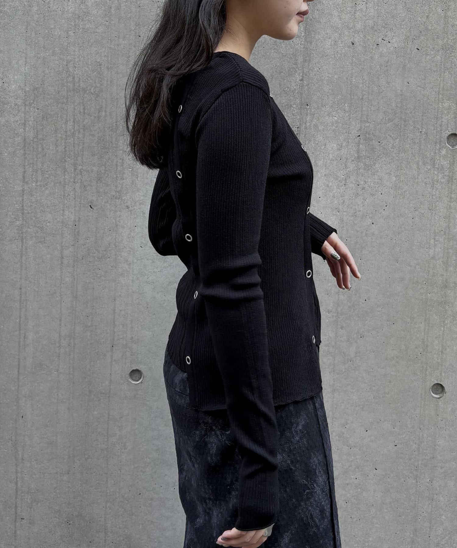 リブ編みの縦ラインと切り替えラインがすっきりとした印象を与えます。