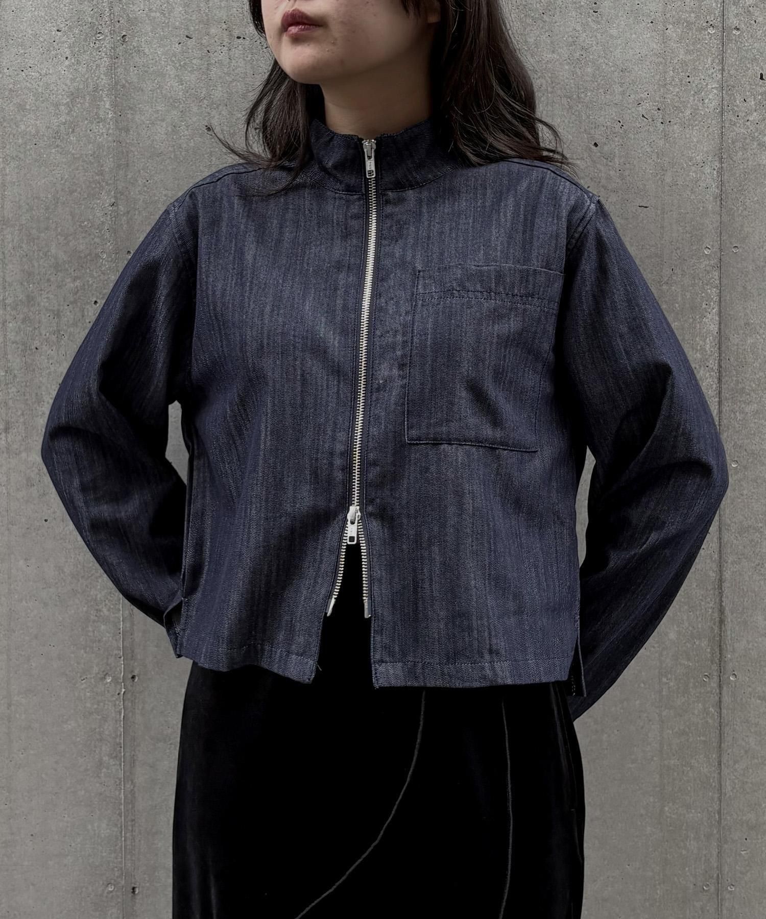 ヘリンボーンのような独特の模様を施したデニム生地で、カジュアルさと上品さを両立。
