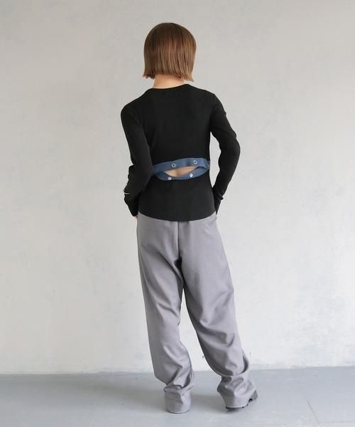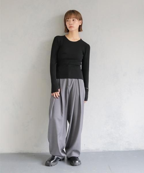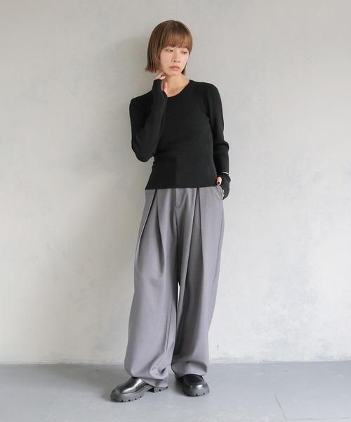 アクセントになるモードな印象のニットトップス。