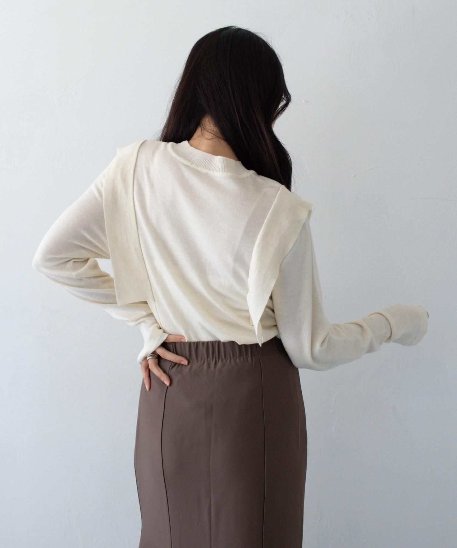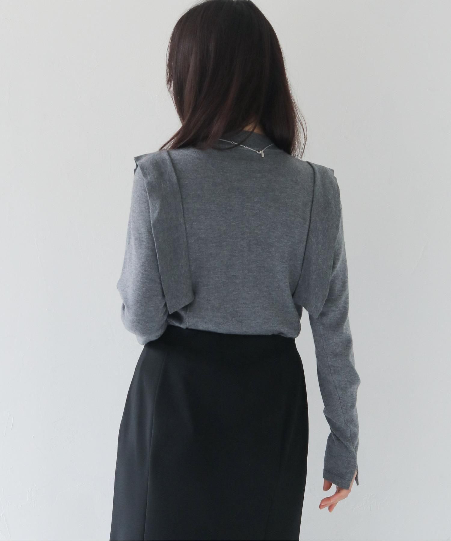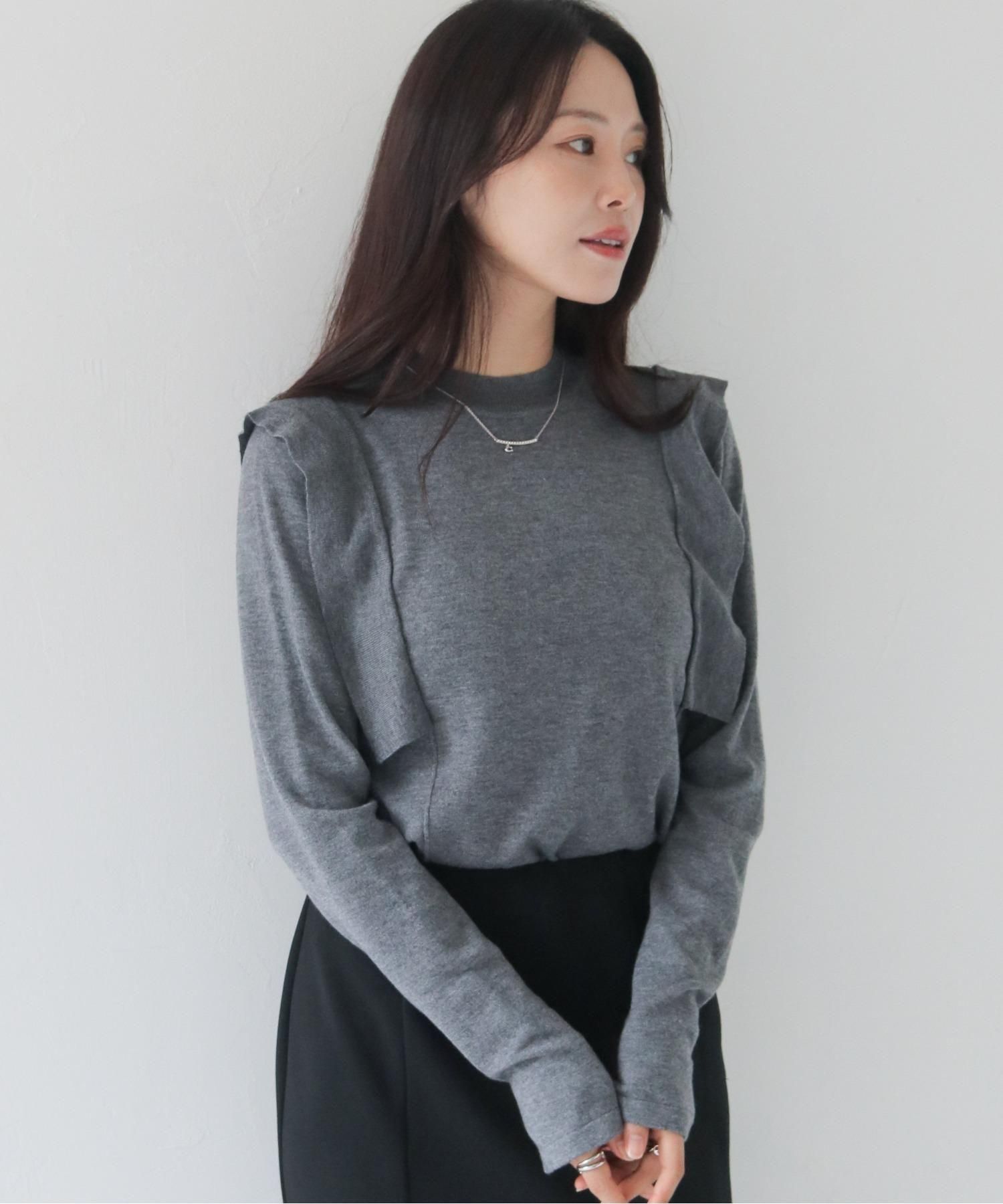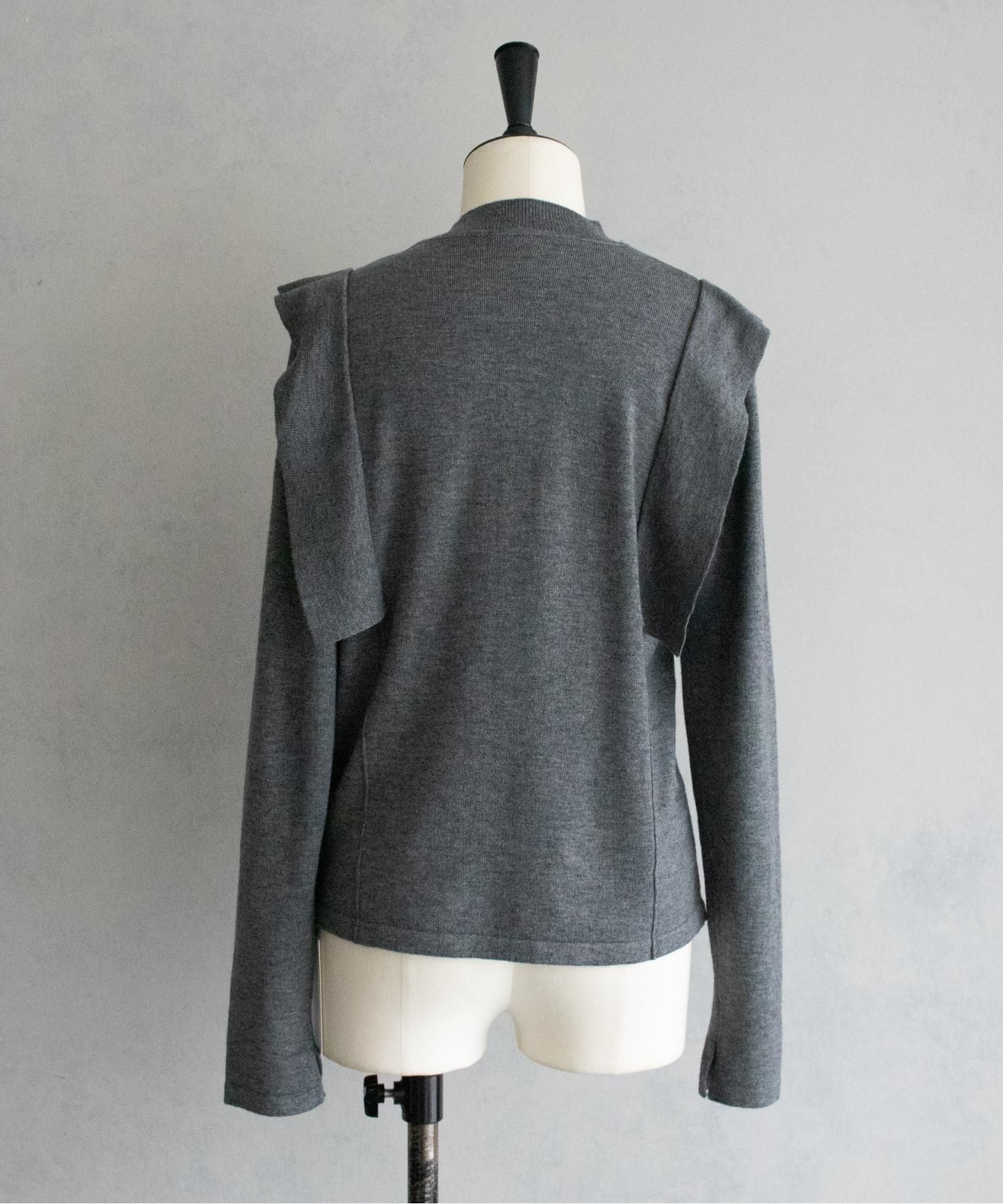 ウール混の素材感で、軽やかさと暖かさを兼ね備えたショルダーデザインニット。