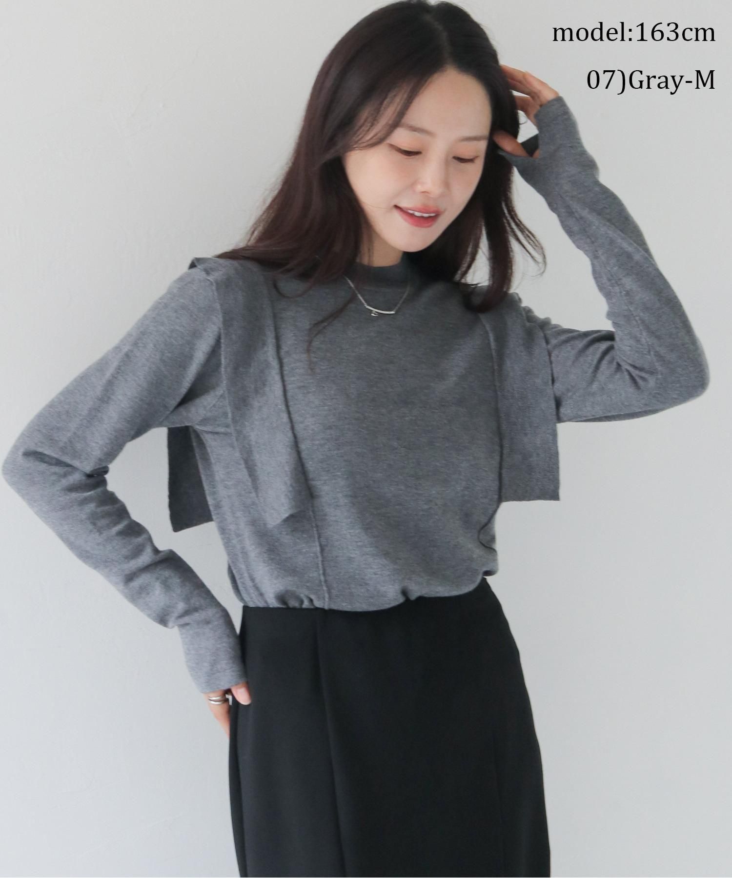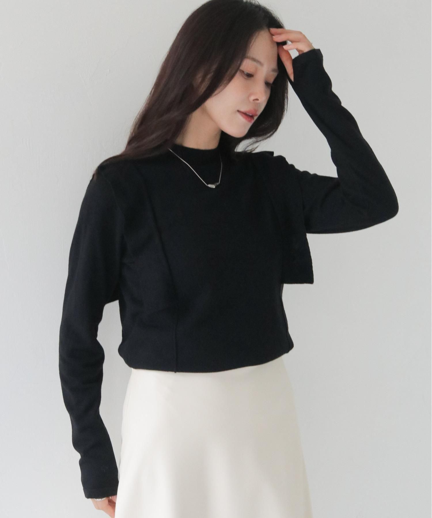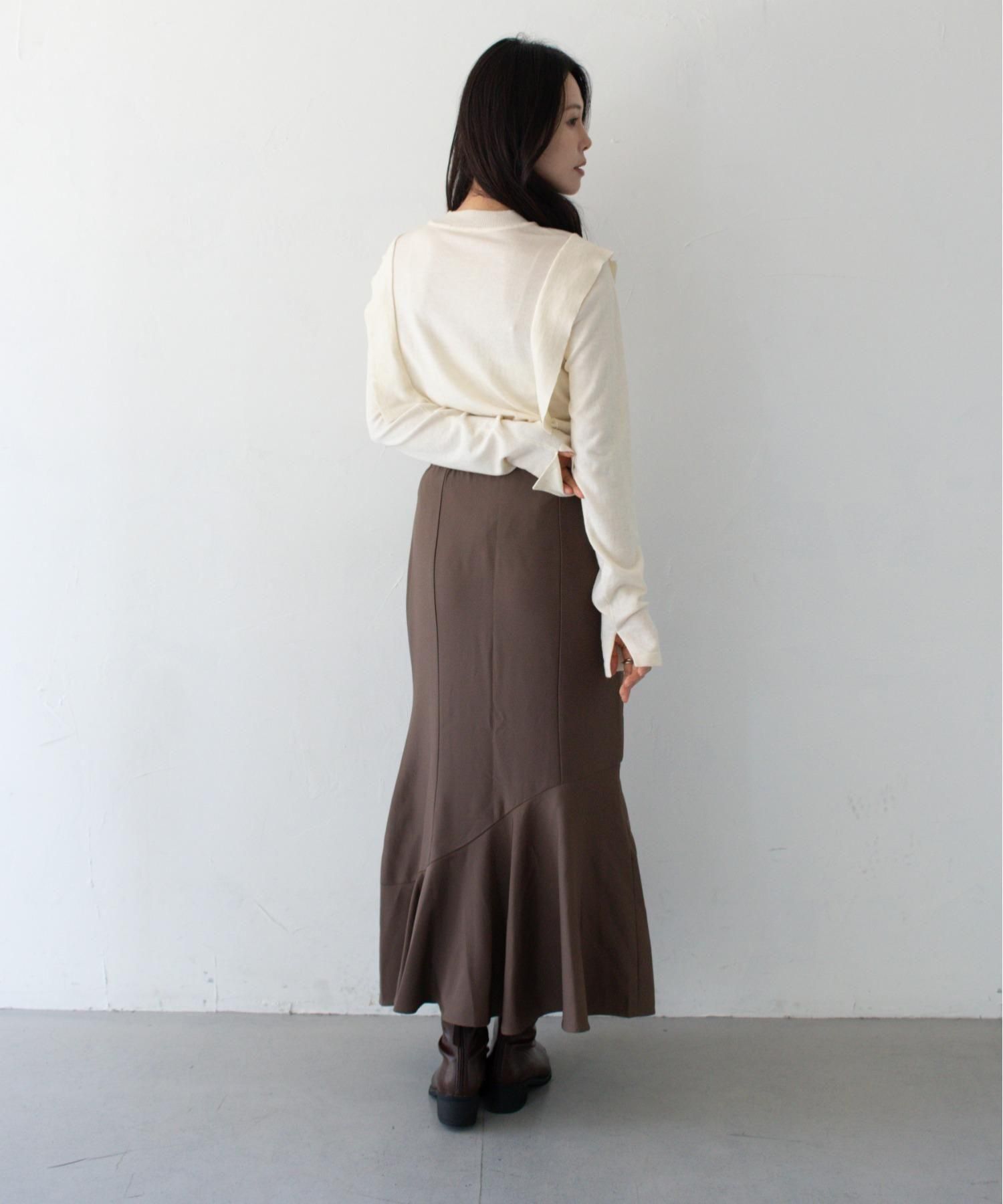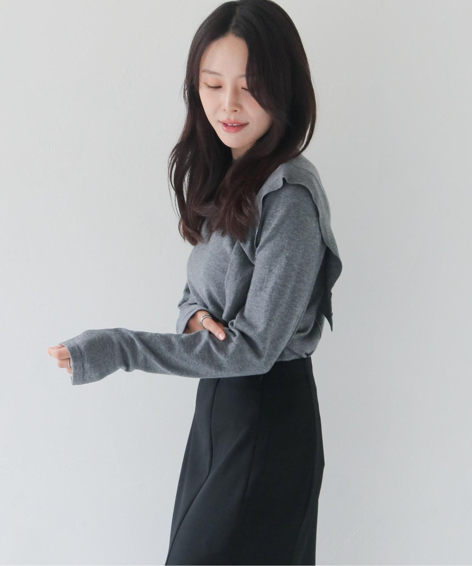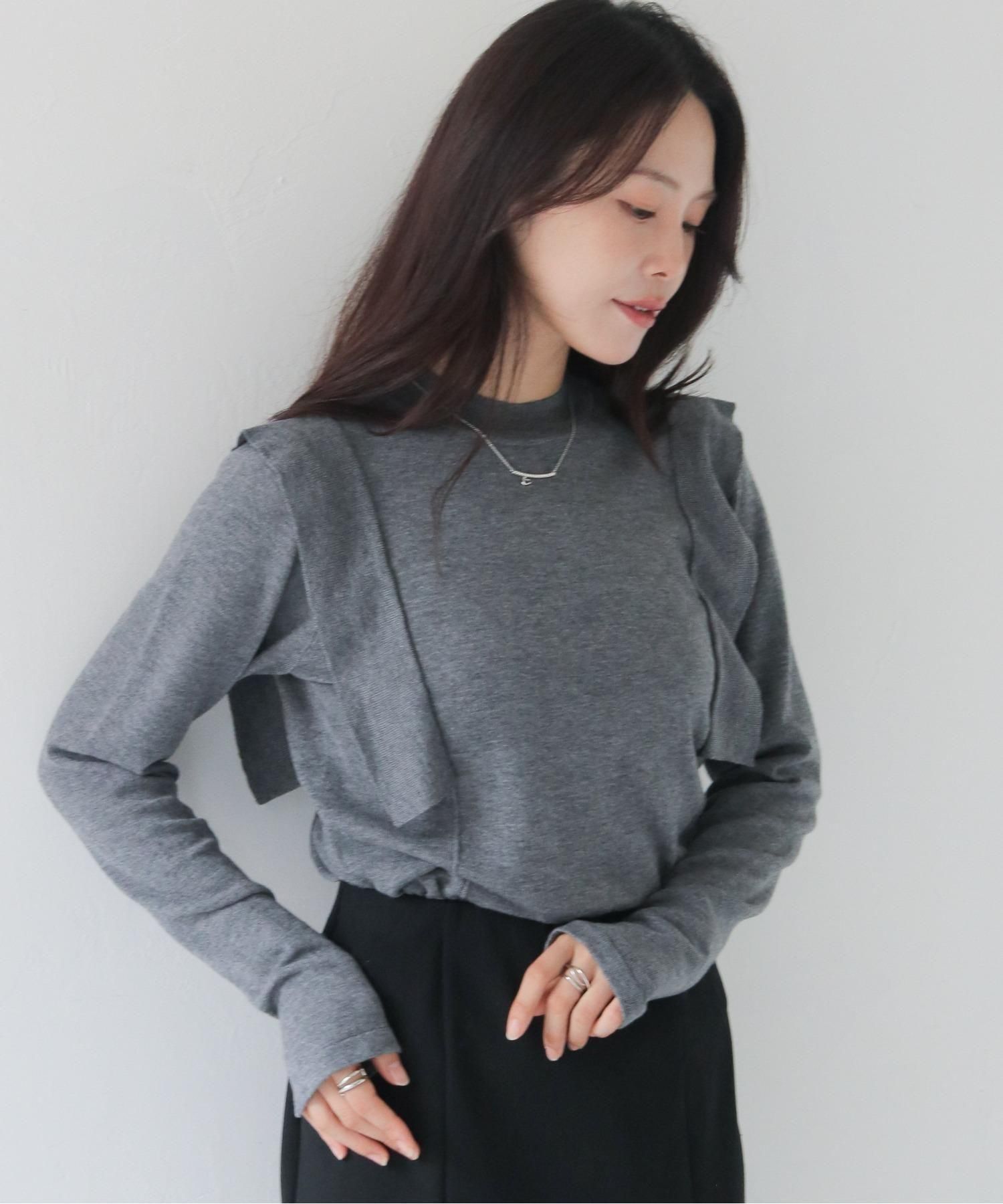 ウール混の素材感で、軽やかさと暖かさを兼ね備えたショルダーデザインニット。
