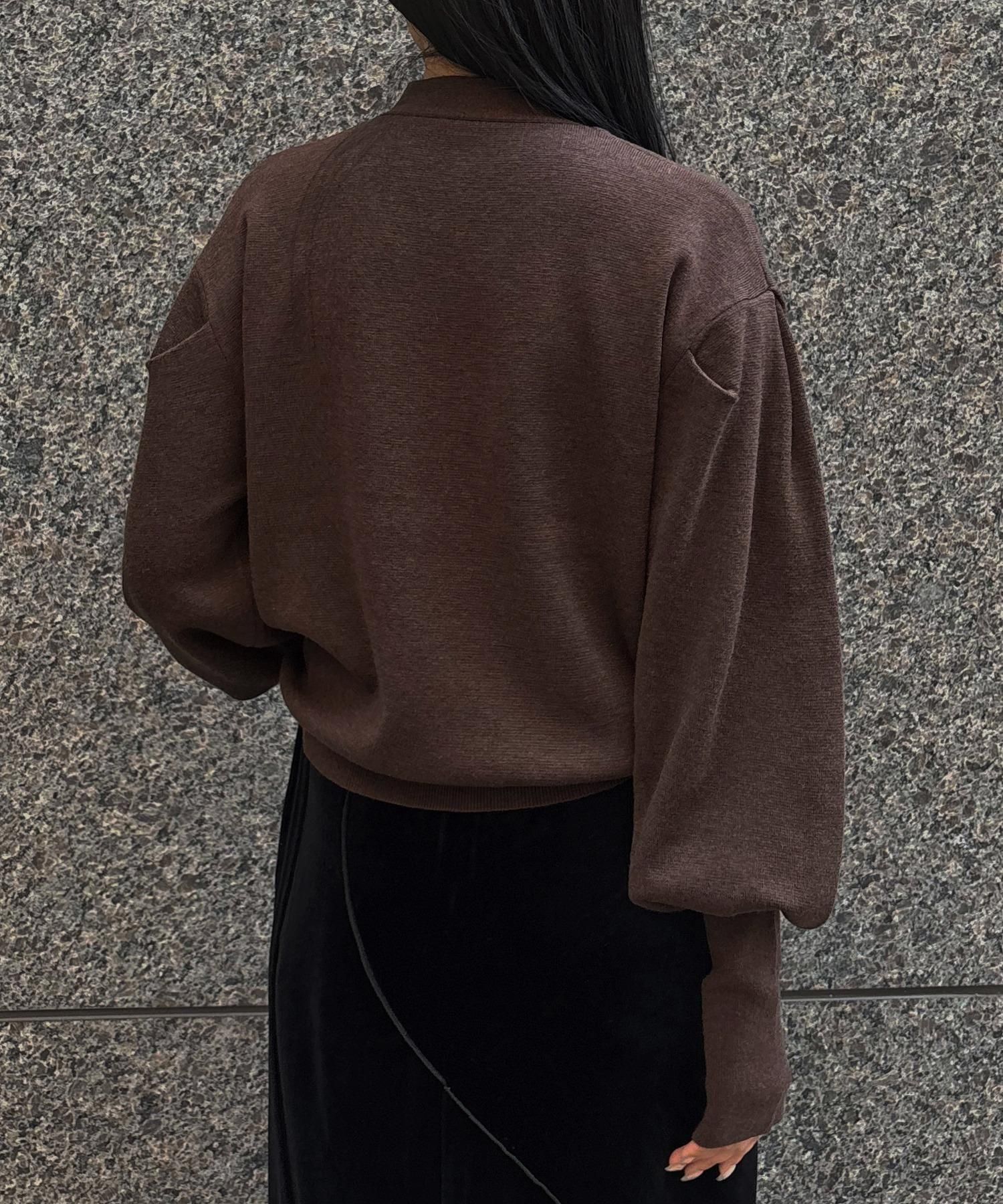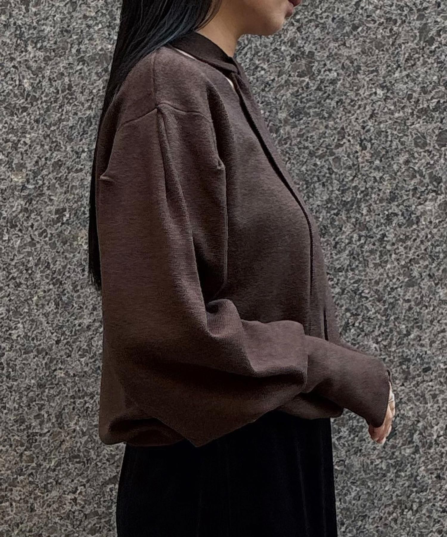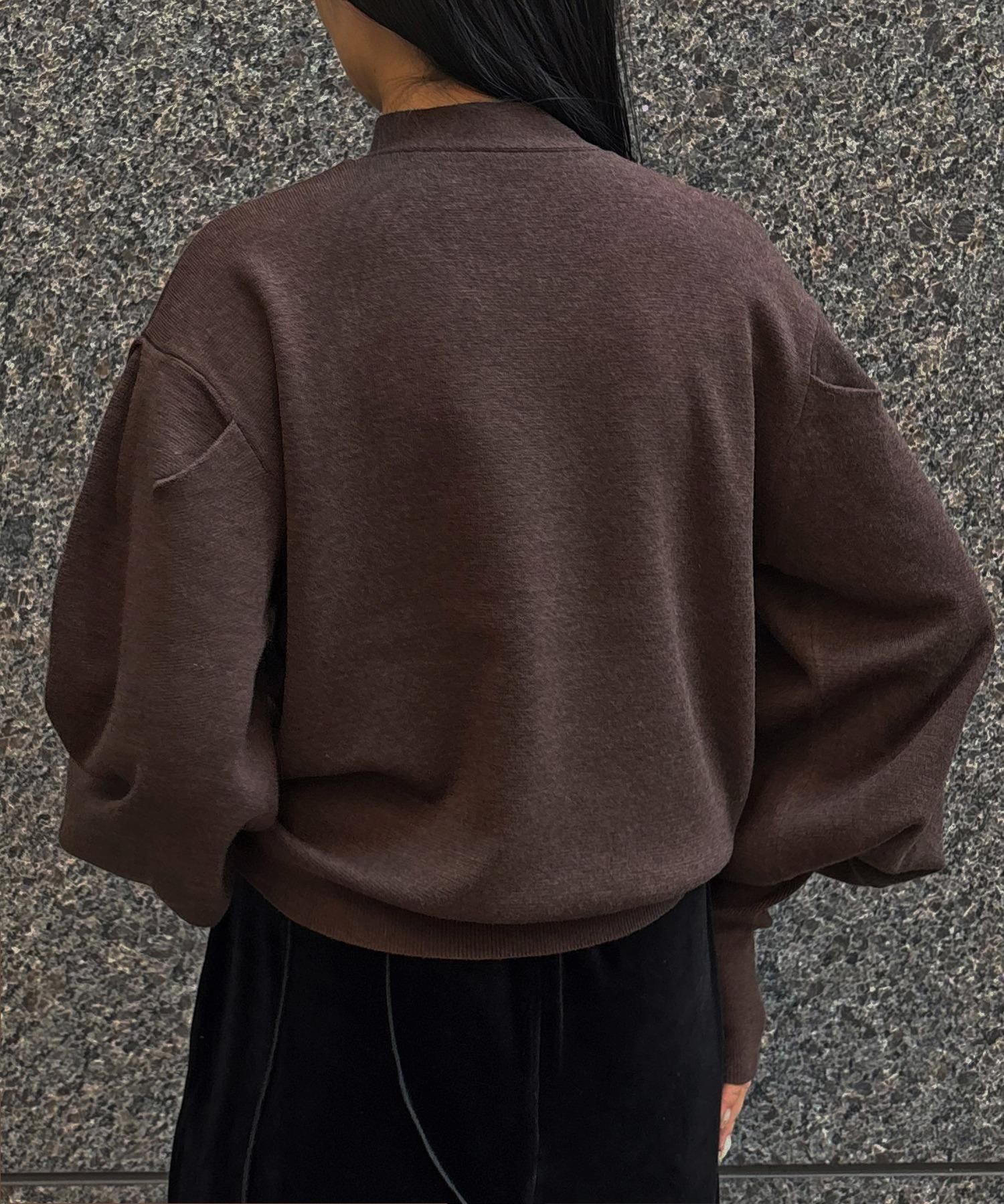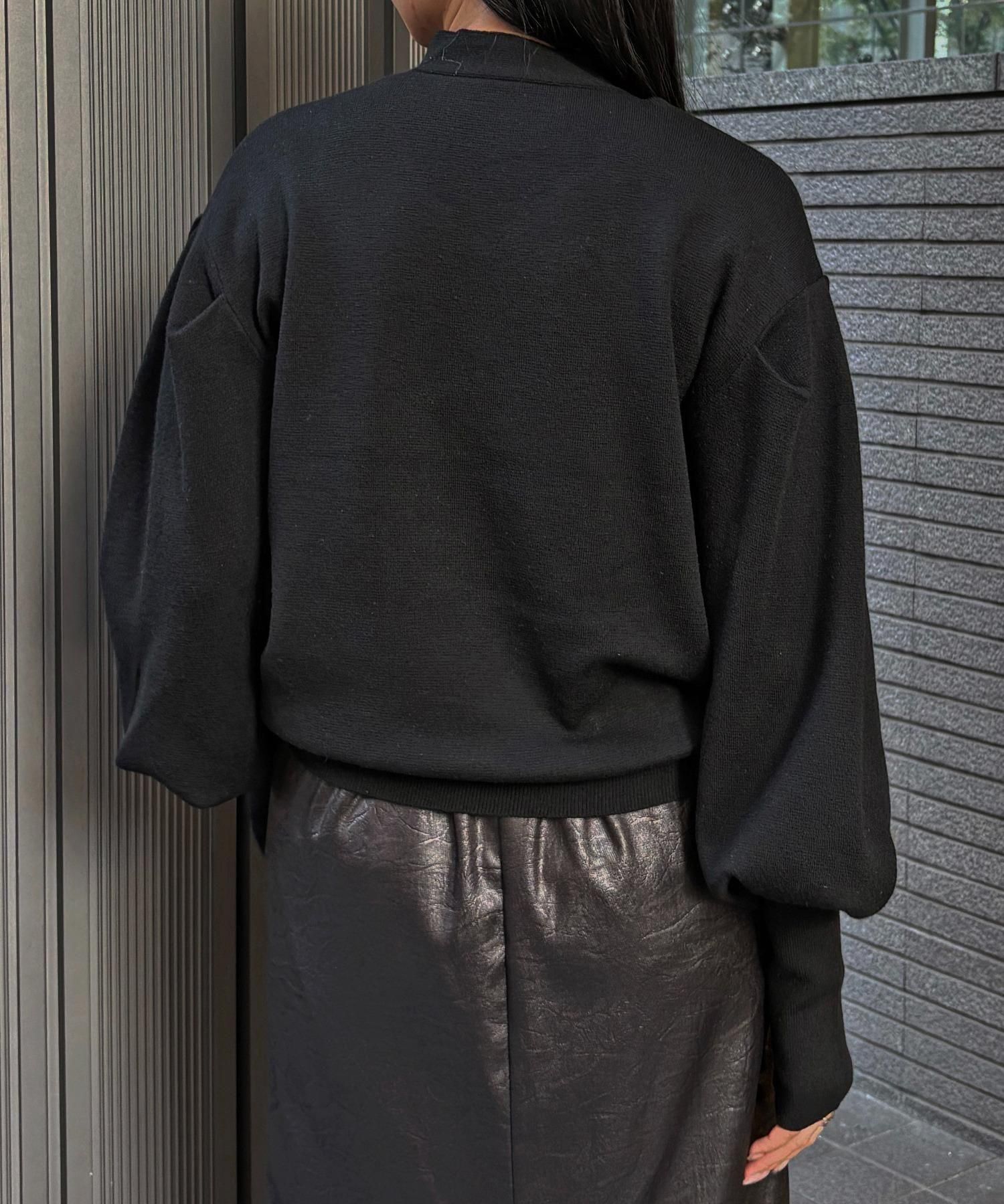 長めの袖リブが腕を細く長く見せ、袖のボリューム感をより引き立てます。