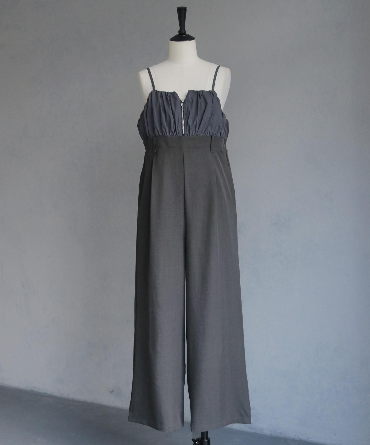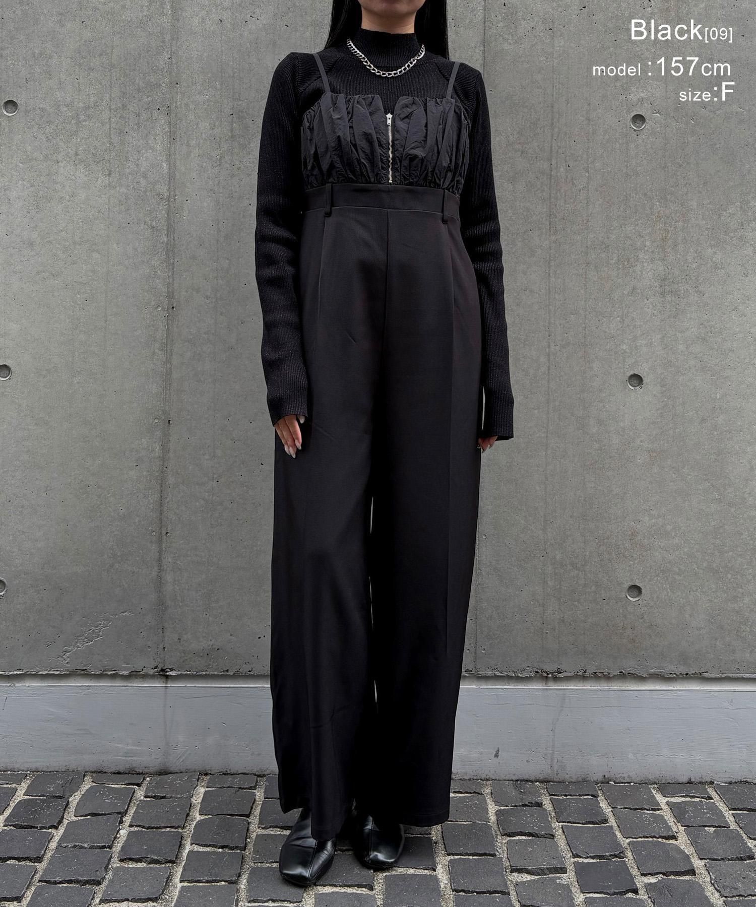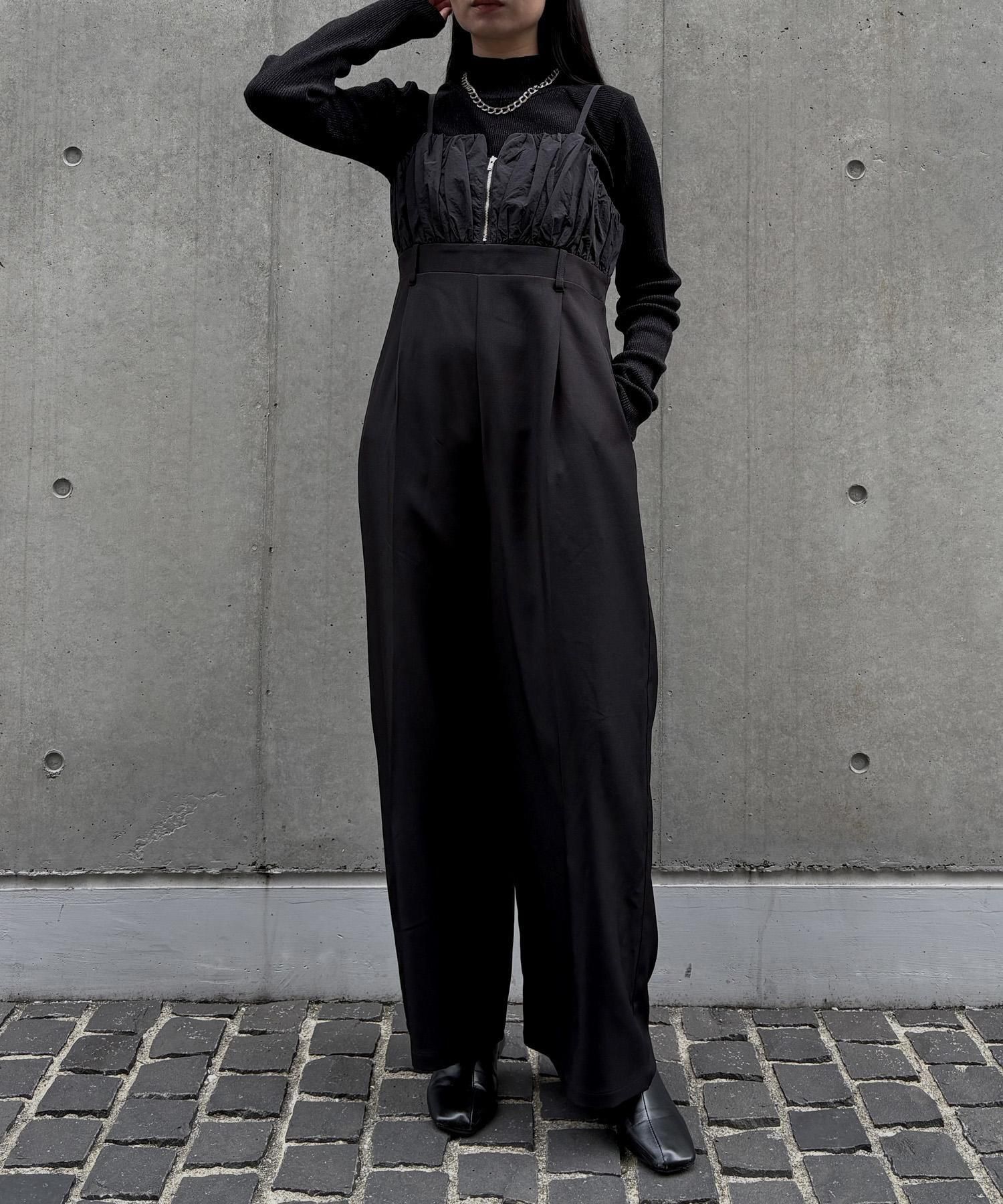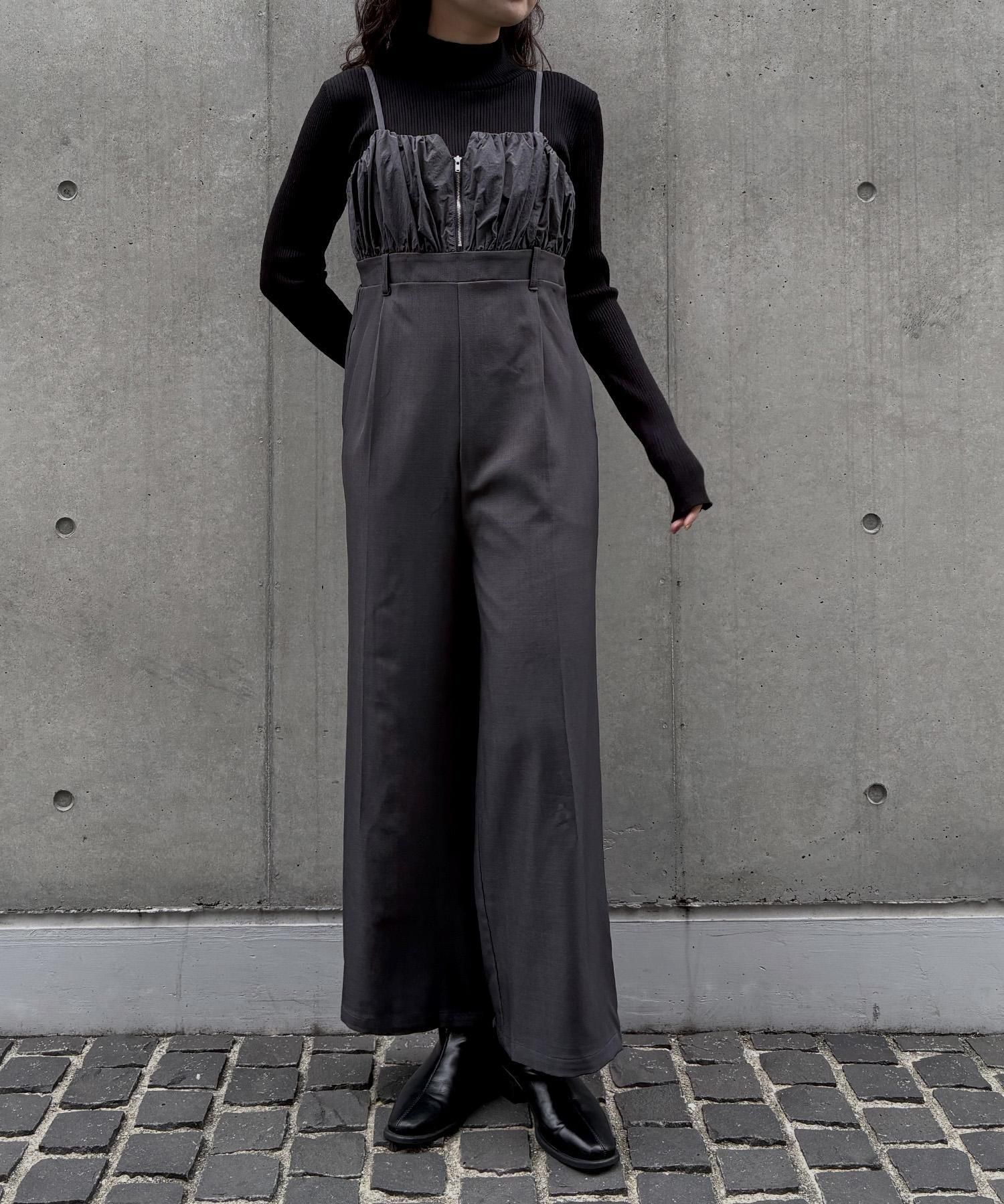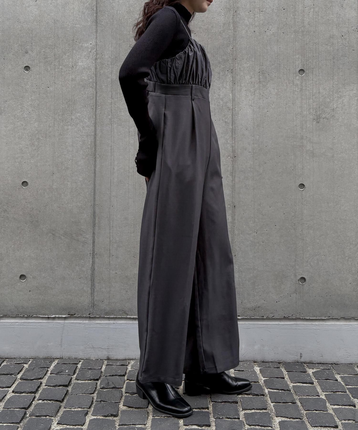 さらっと着やすいオールインワン×異素材ギャザービスチェがポイントの1着