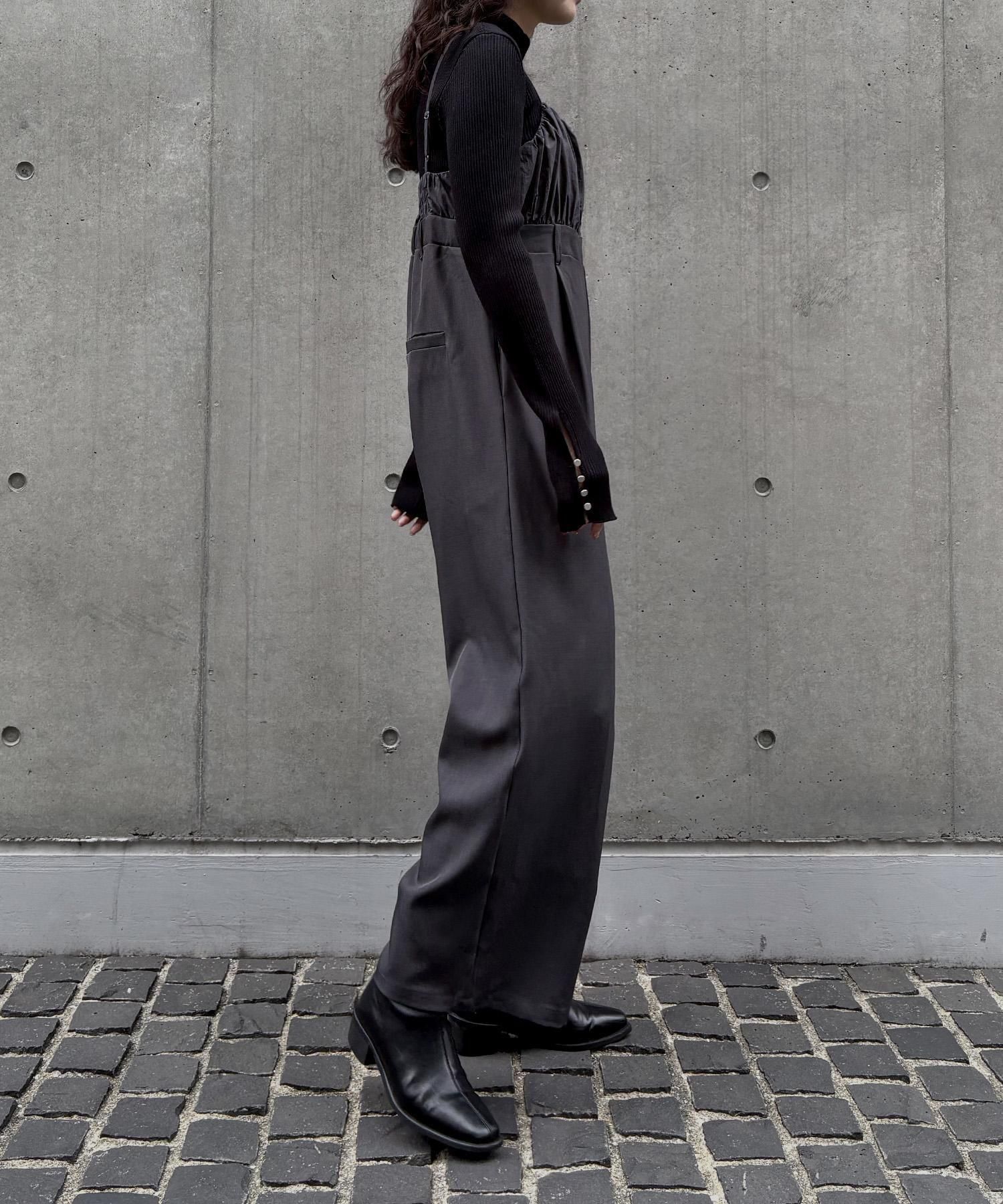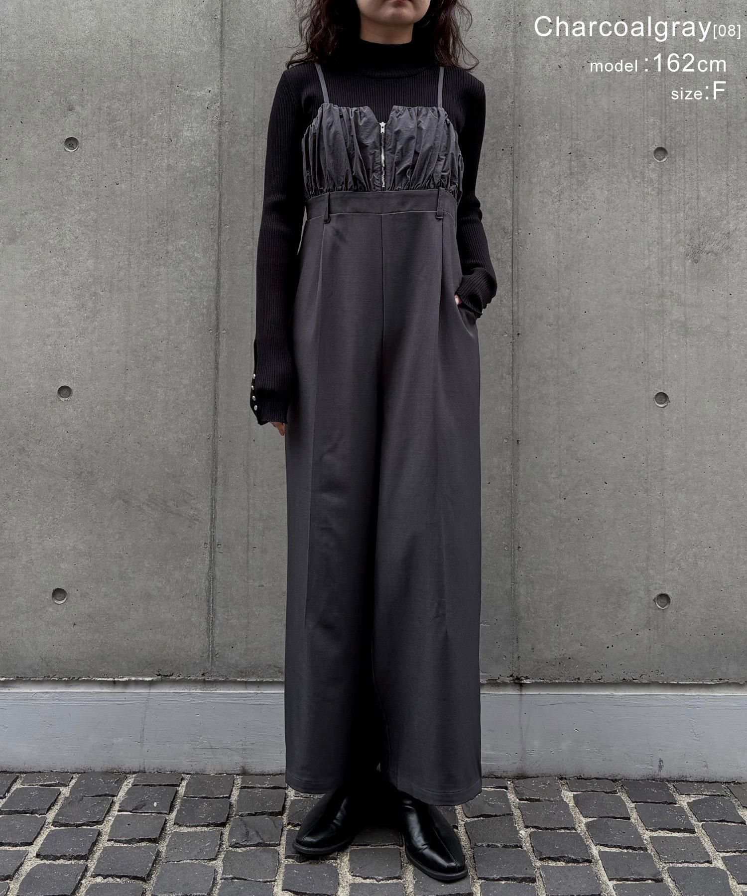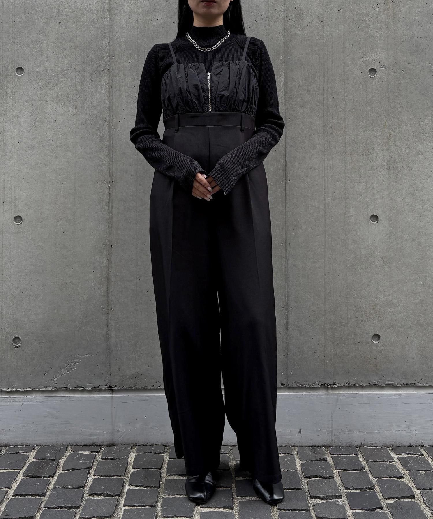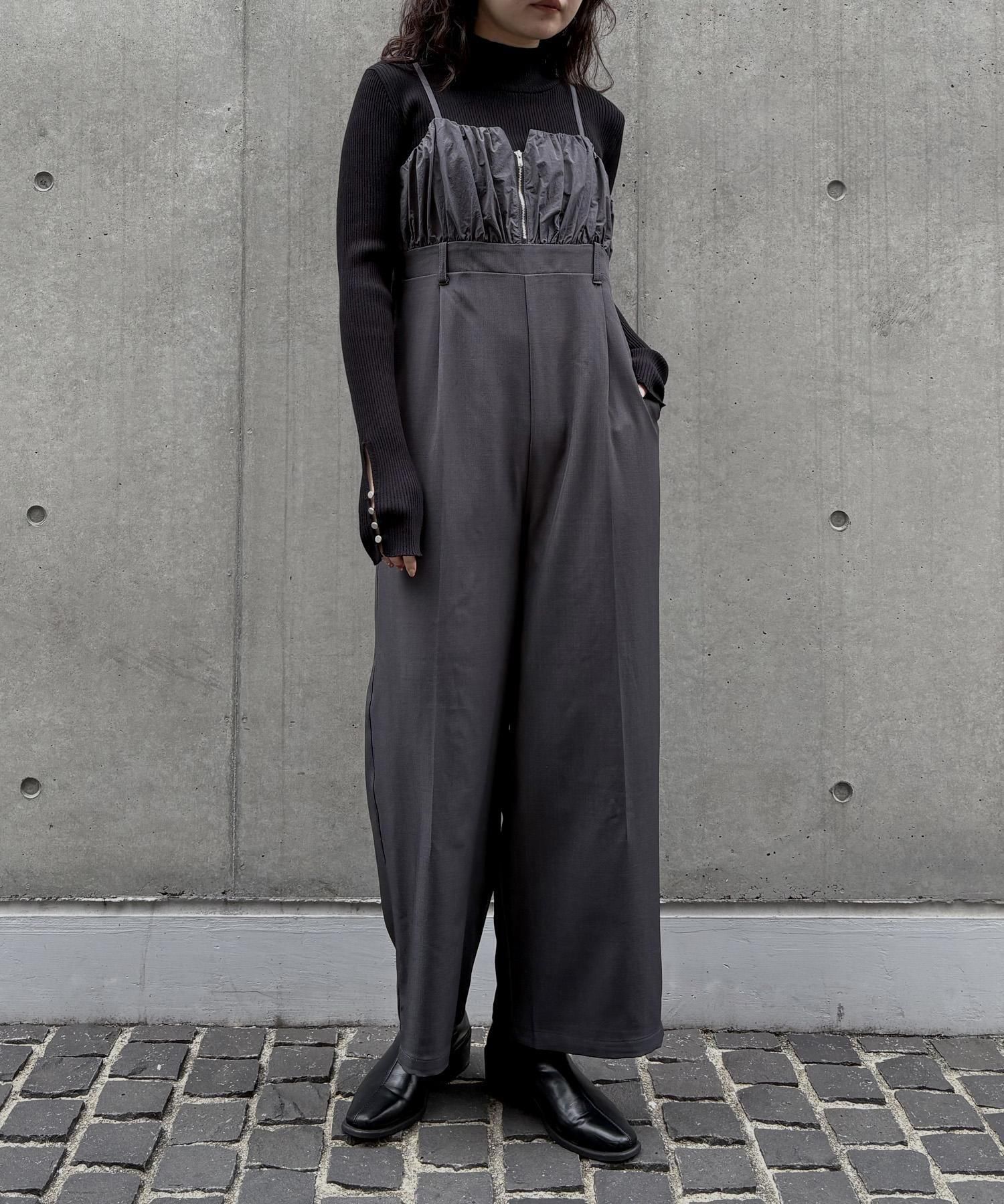 さらっと着やすいオールインワン×異素材ギャザービスチェがポイントの1着