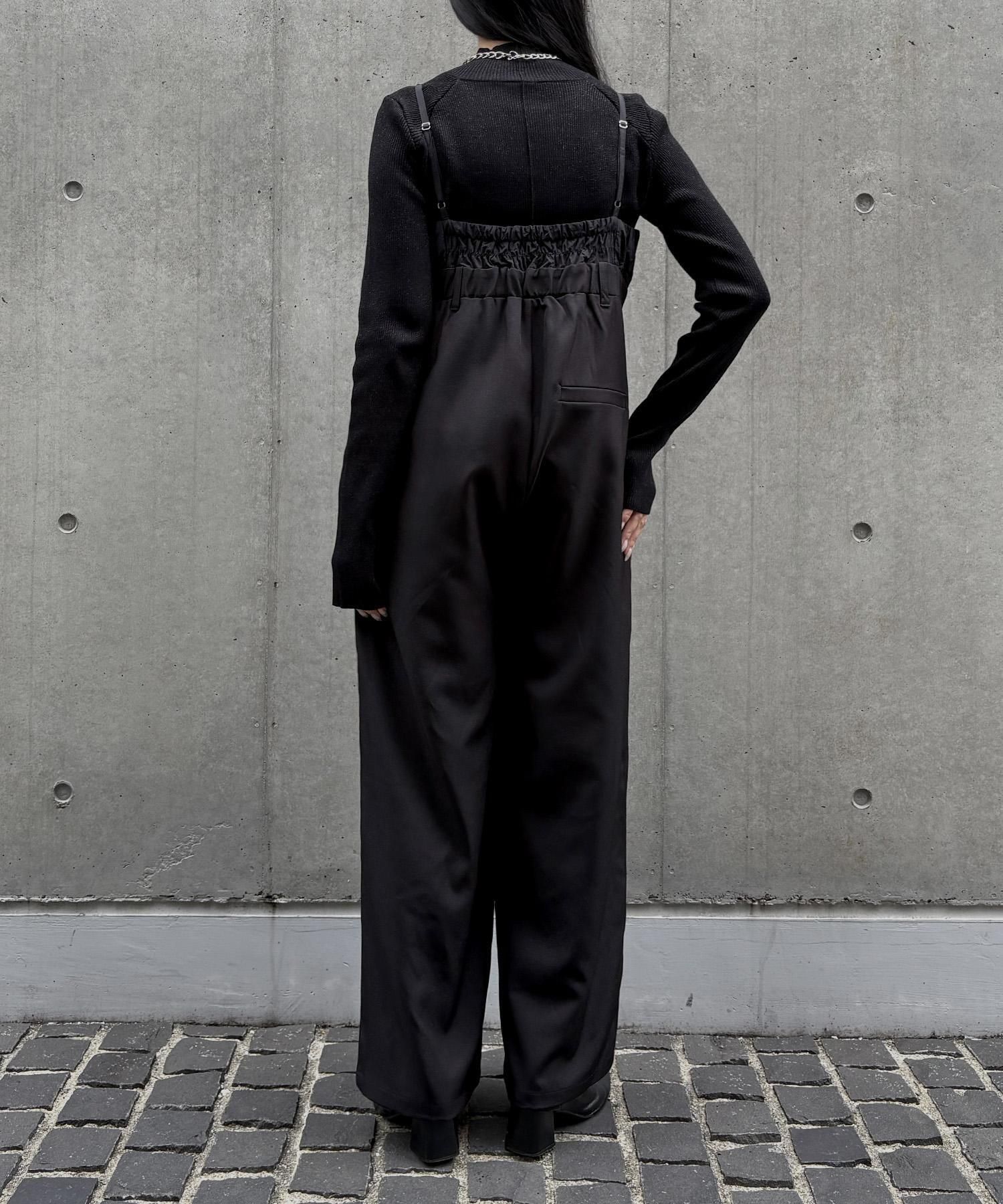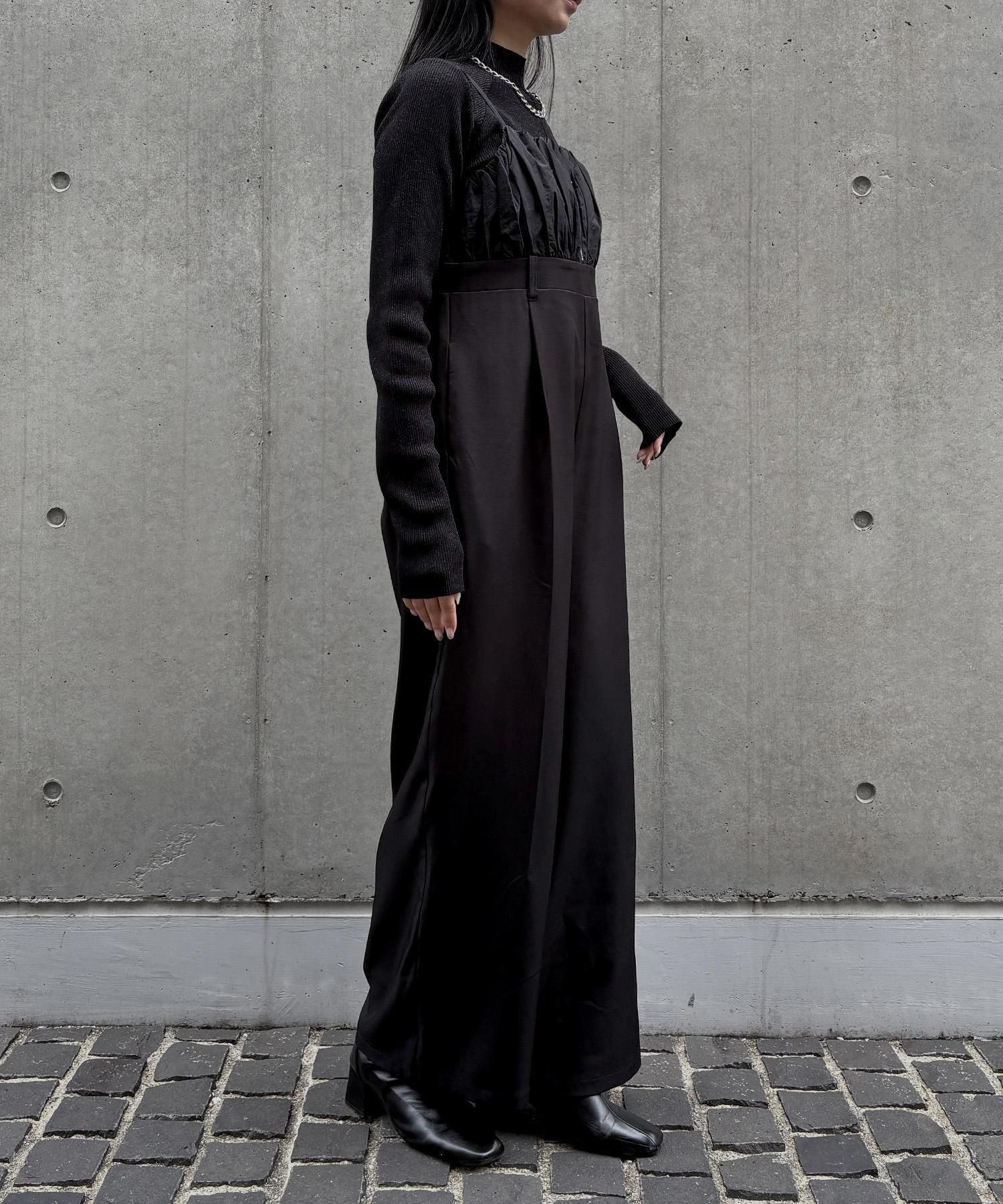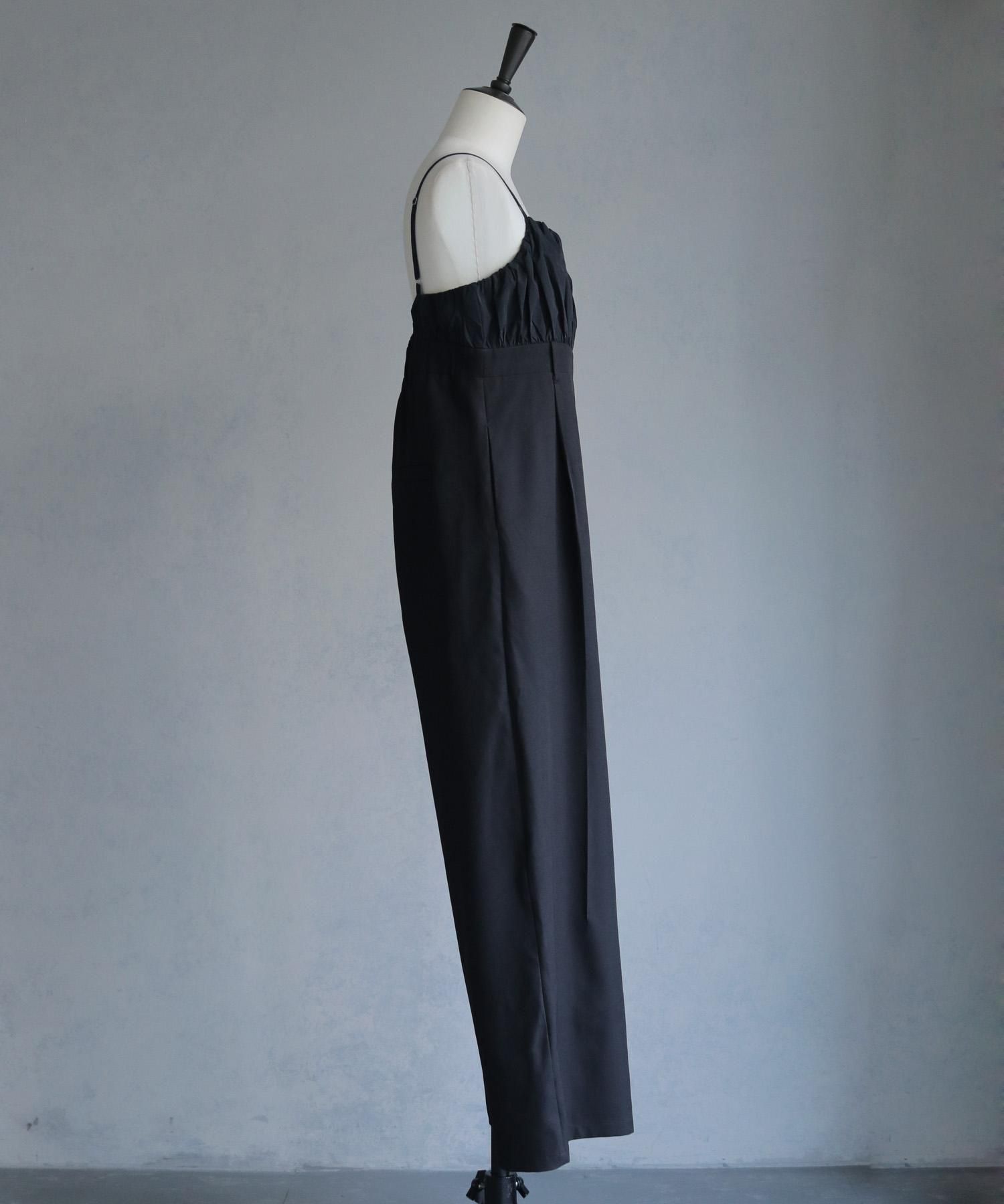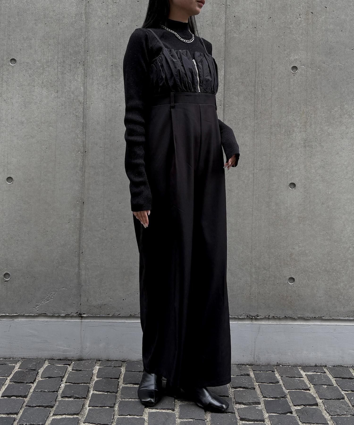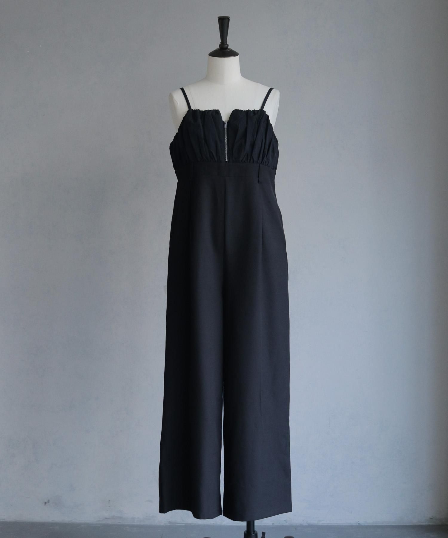 さらっと着やすいオールインワン×異素材ギャザービスチェがポイントの1着