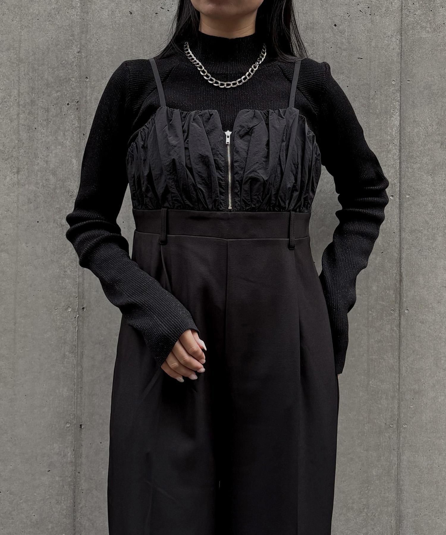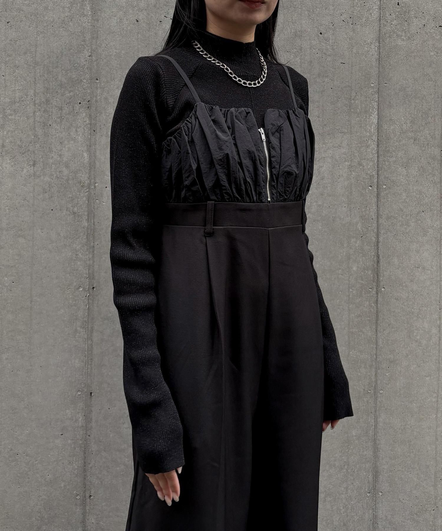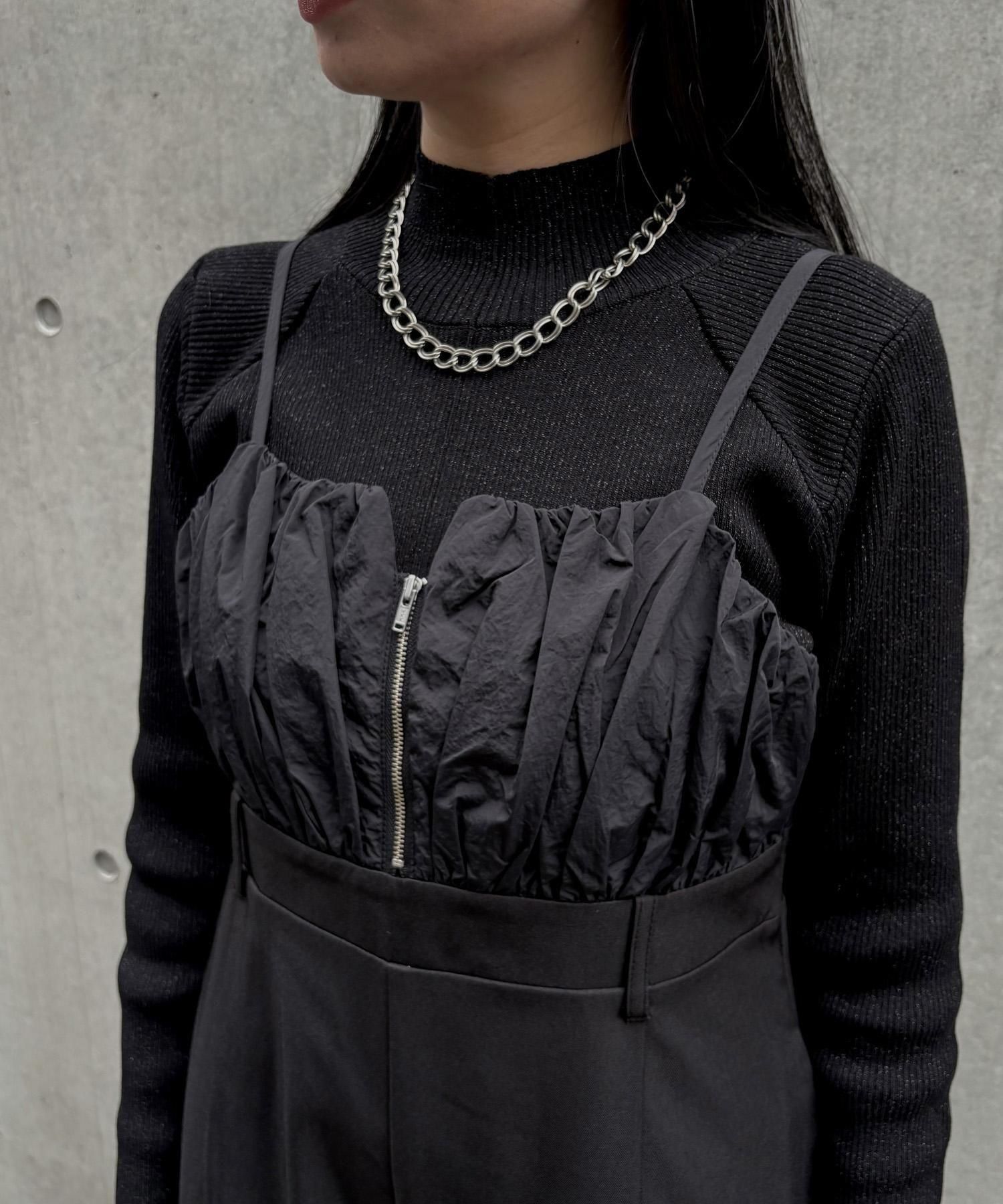 たっぷりギャザーを寄せたナイロンビスチェと、シルバーファスナーがアクセント。