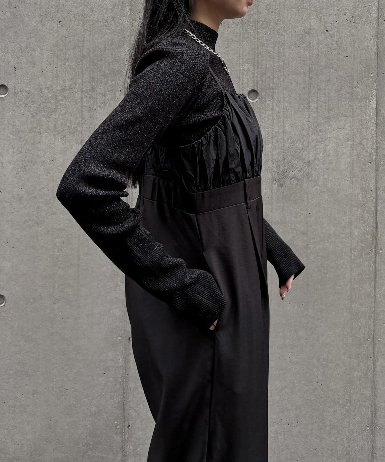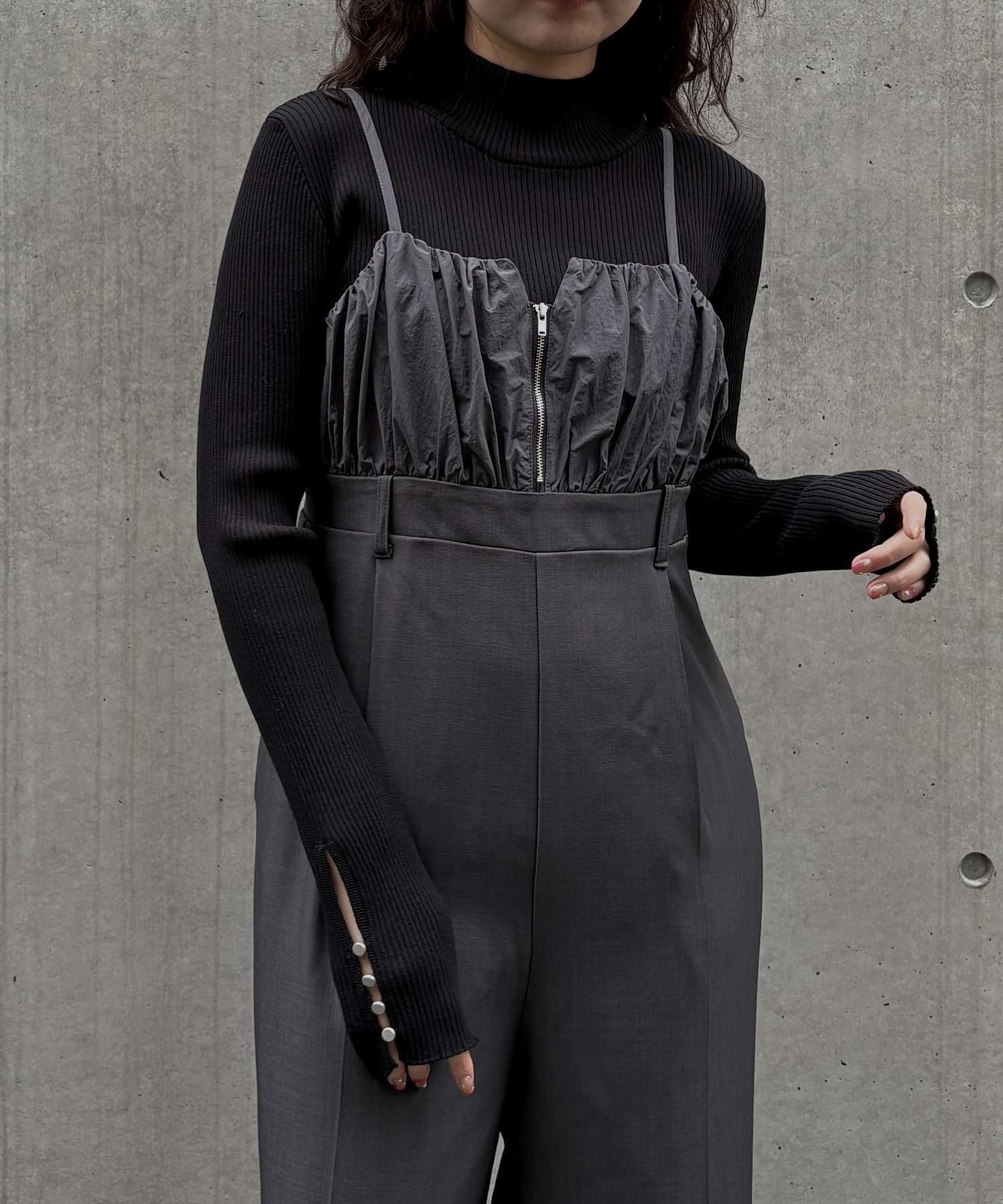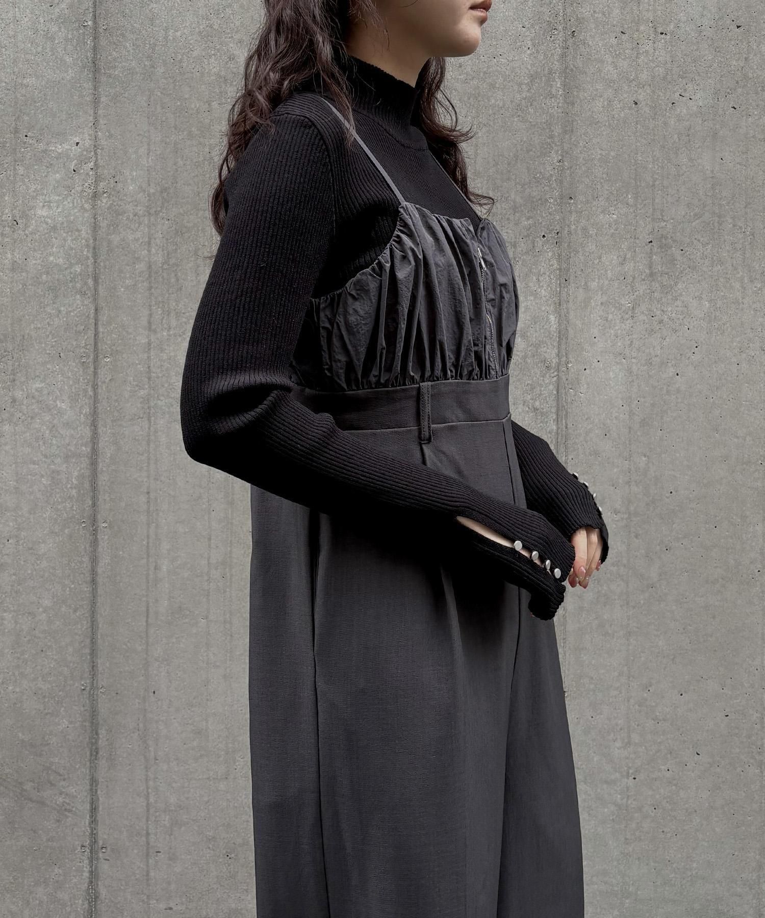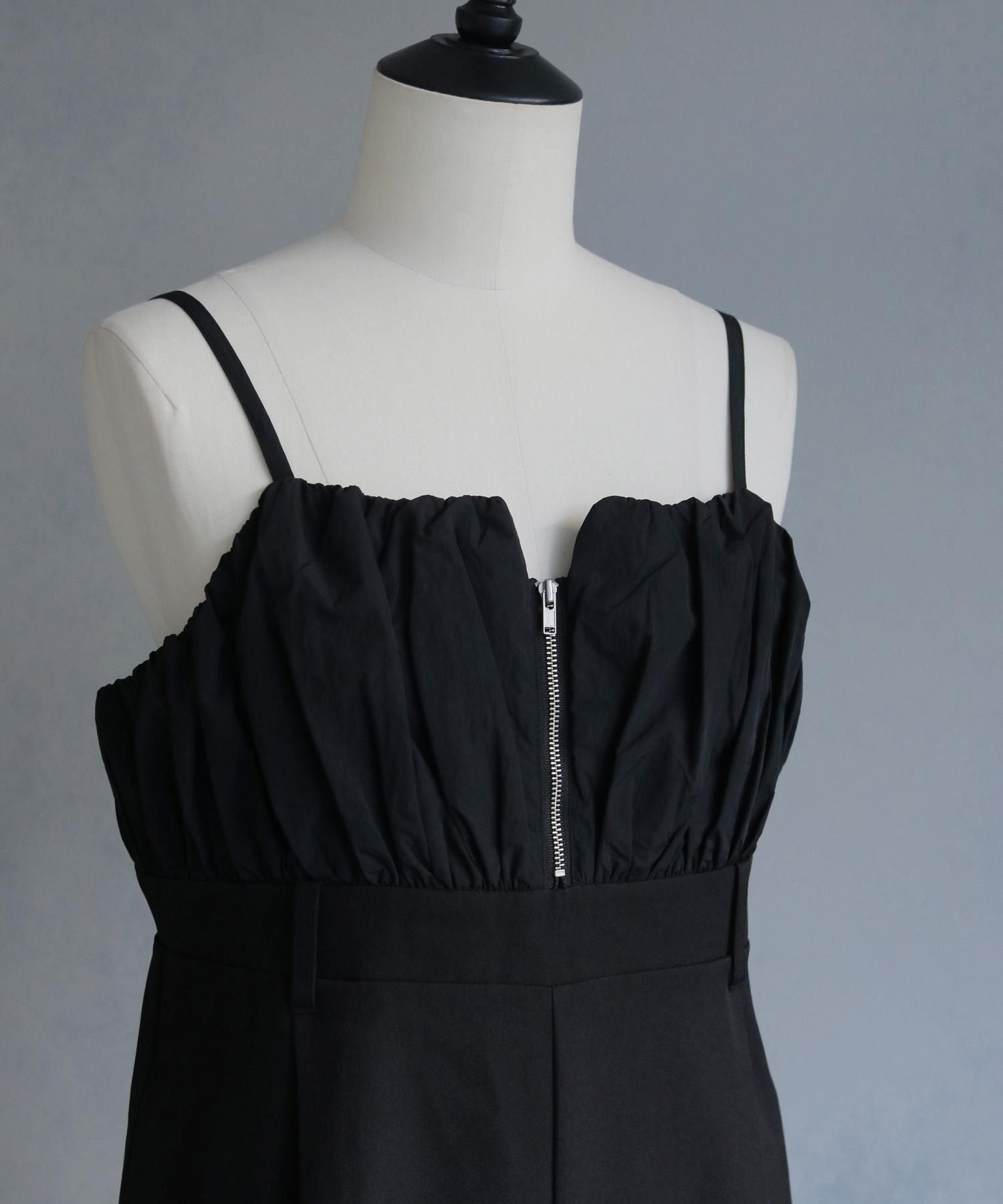 たっぷりギャザーを寄せたナイロンビスチェと、シルバーファスナーがアクセント。