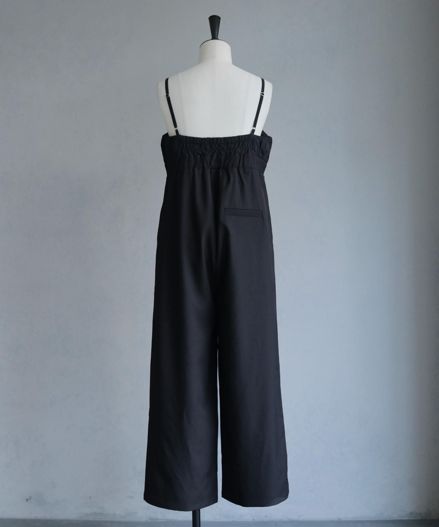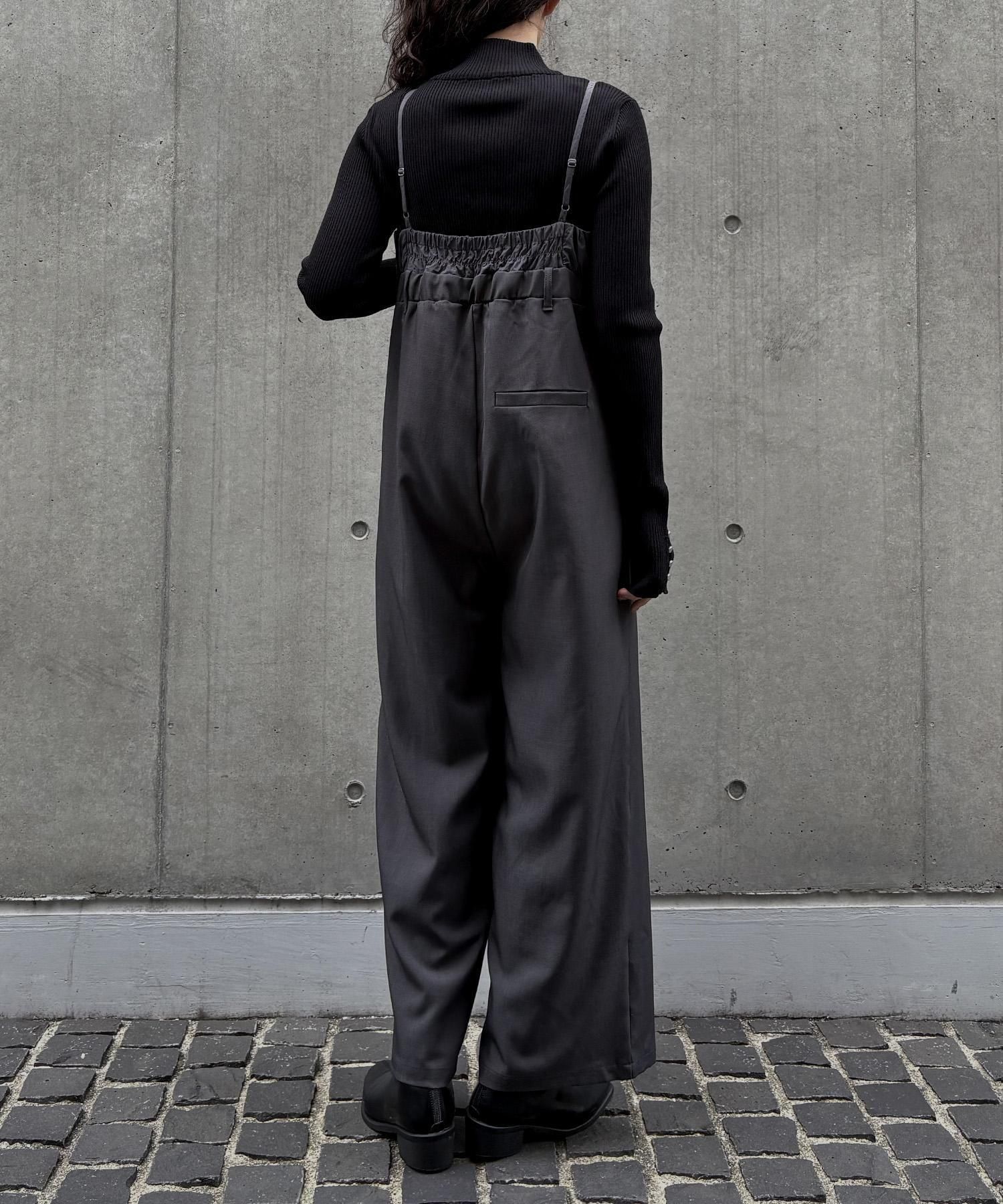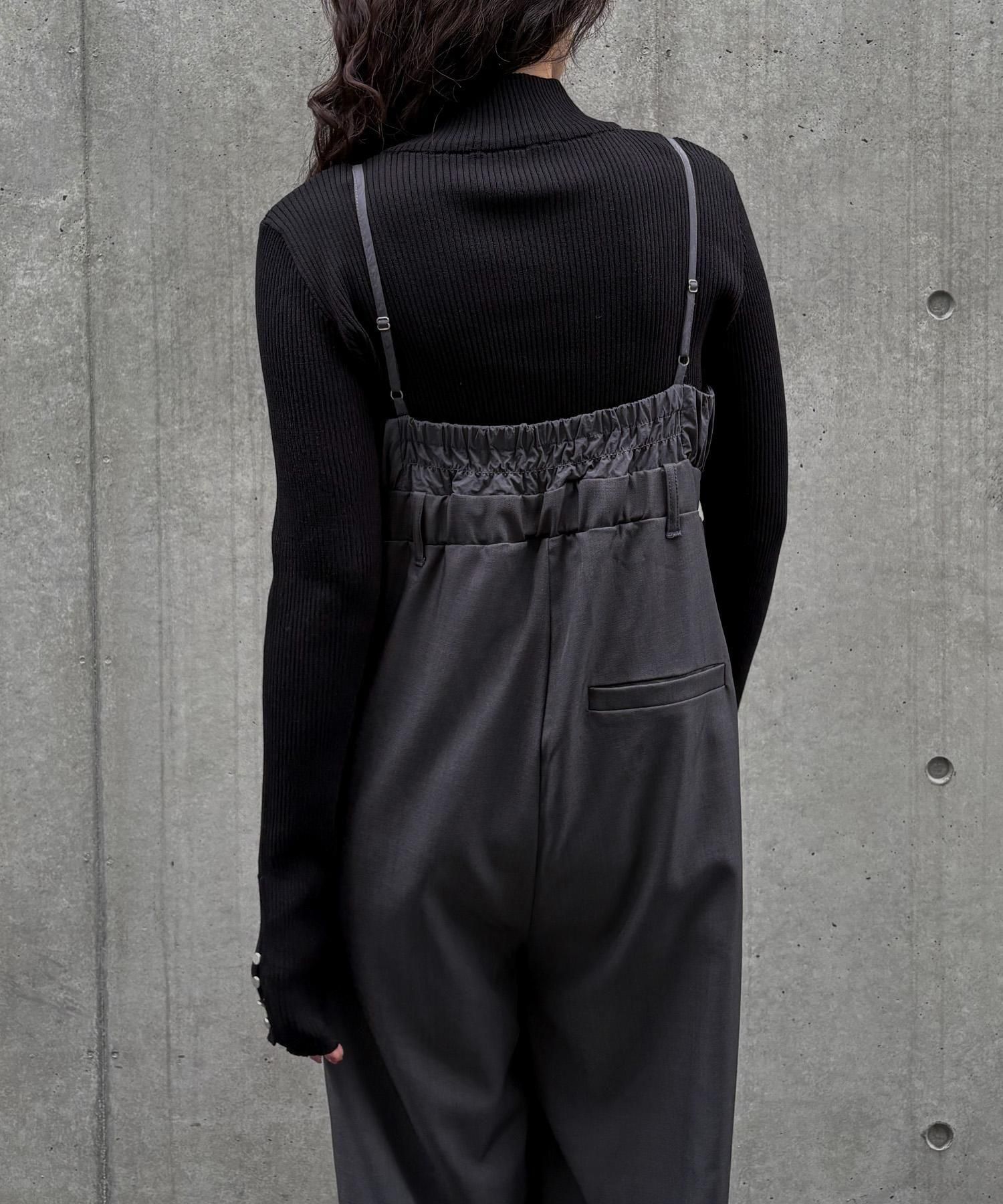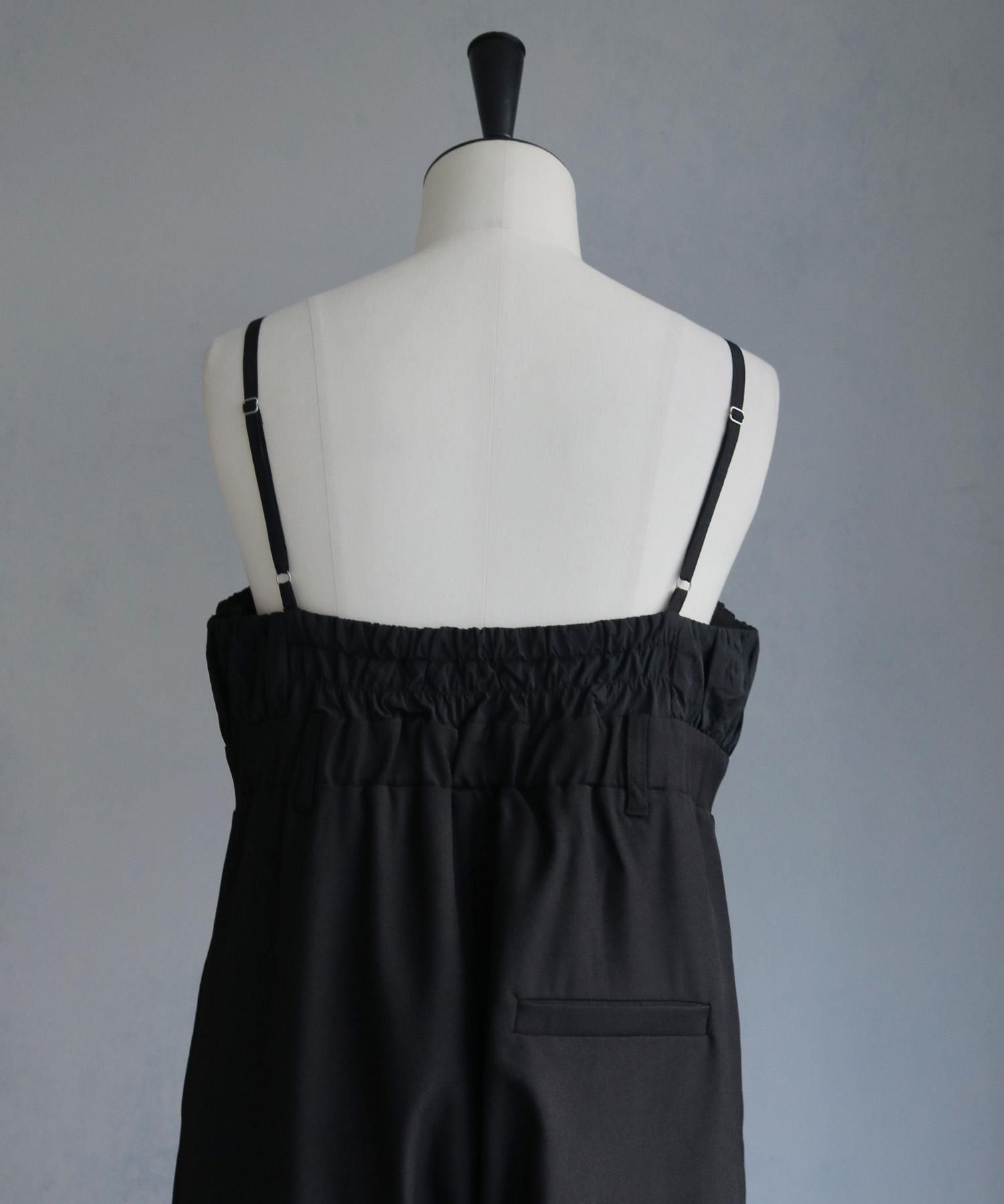 メンズライクなツイル素材に華奢な肩紐を組み合わせ、ほどよいフェミニンさをプラス。