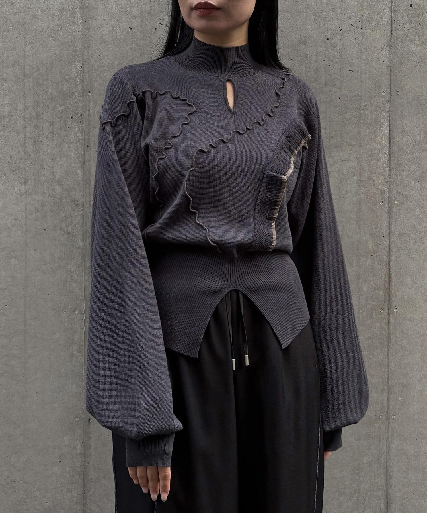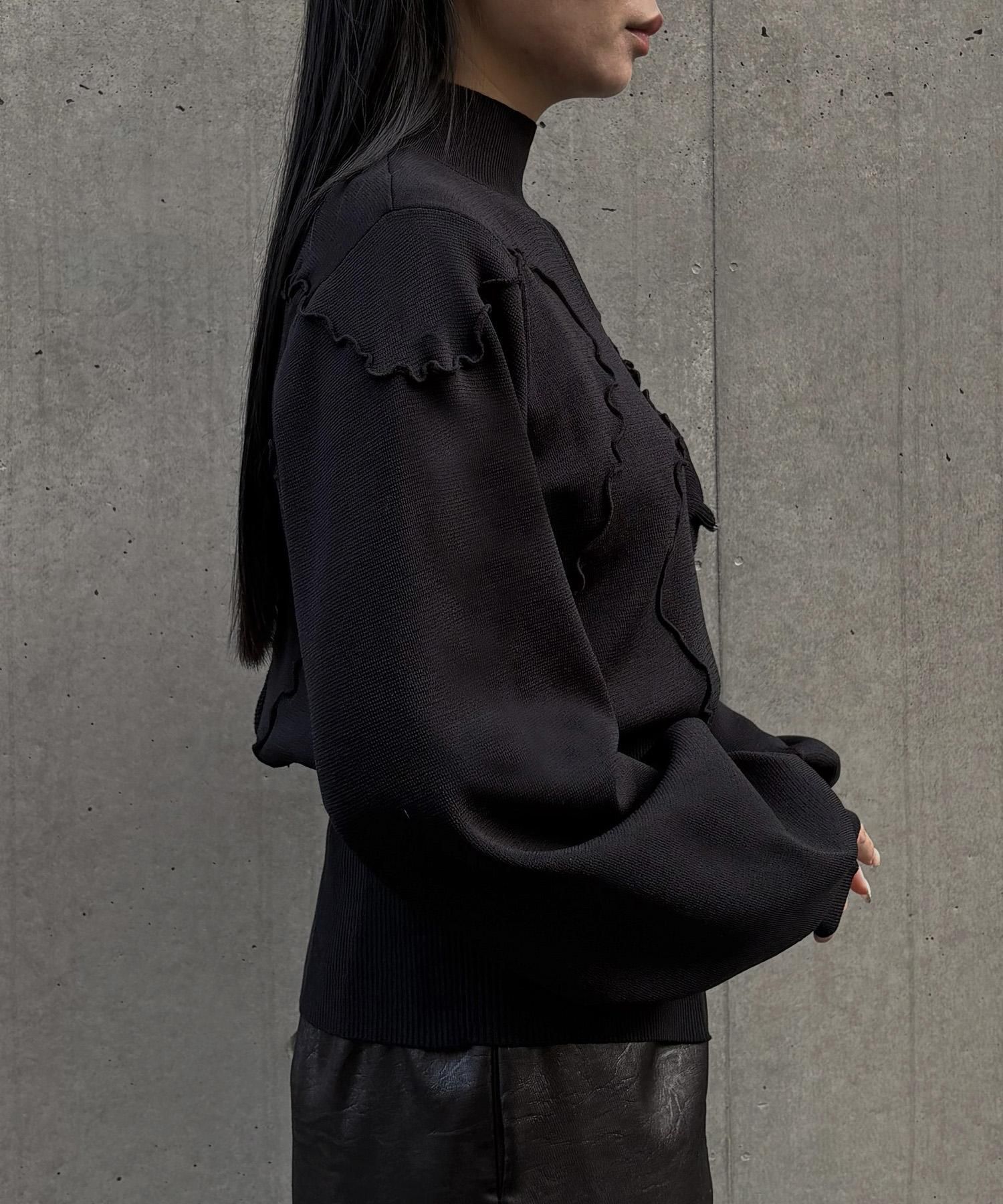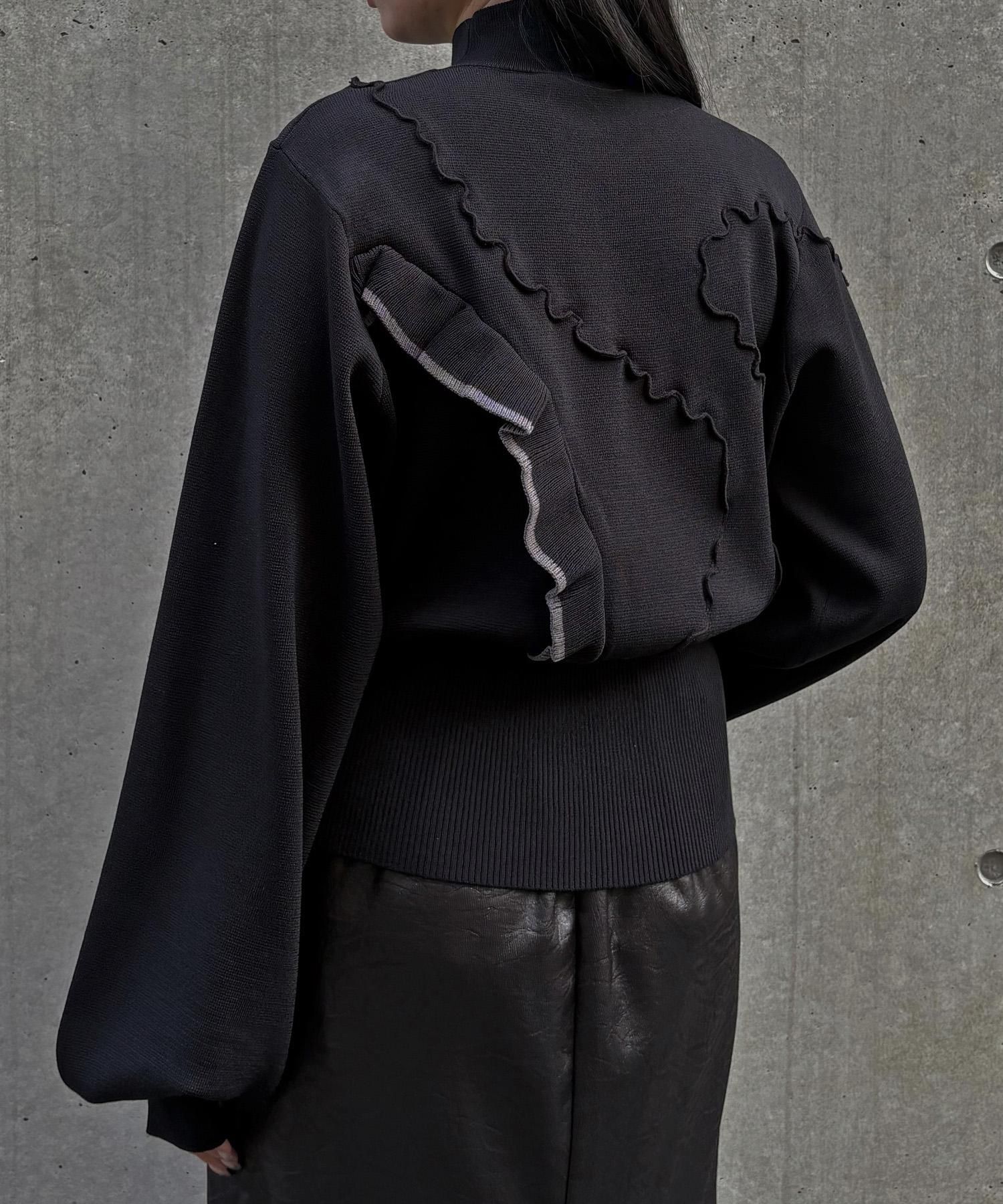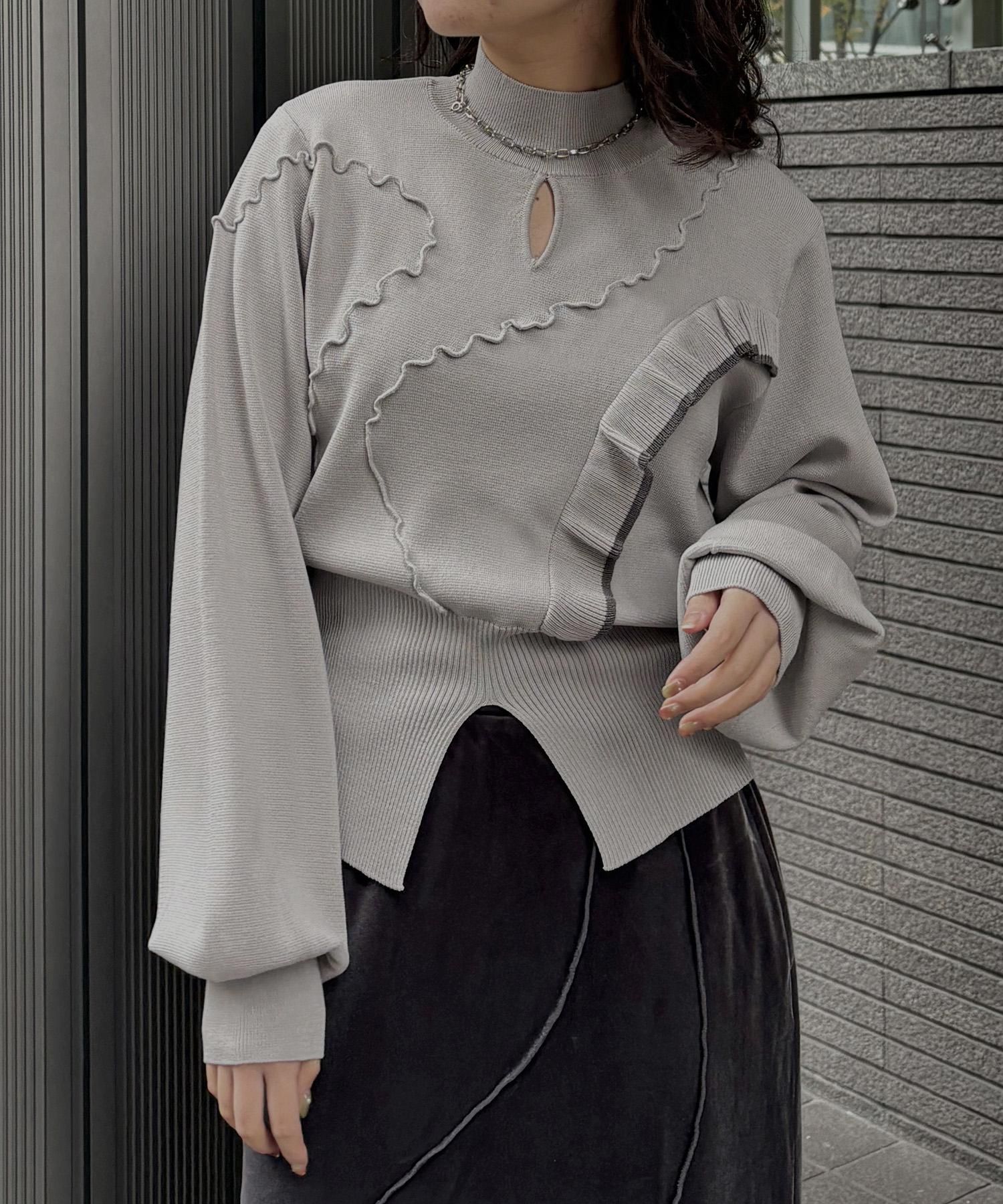 長めのボリュームスリーブとラッフルで華やかなデザインながら、ウエストの長めリブとスリットで全体をスッキリと見せます。