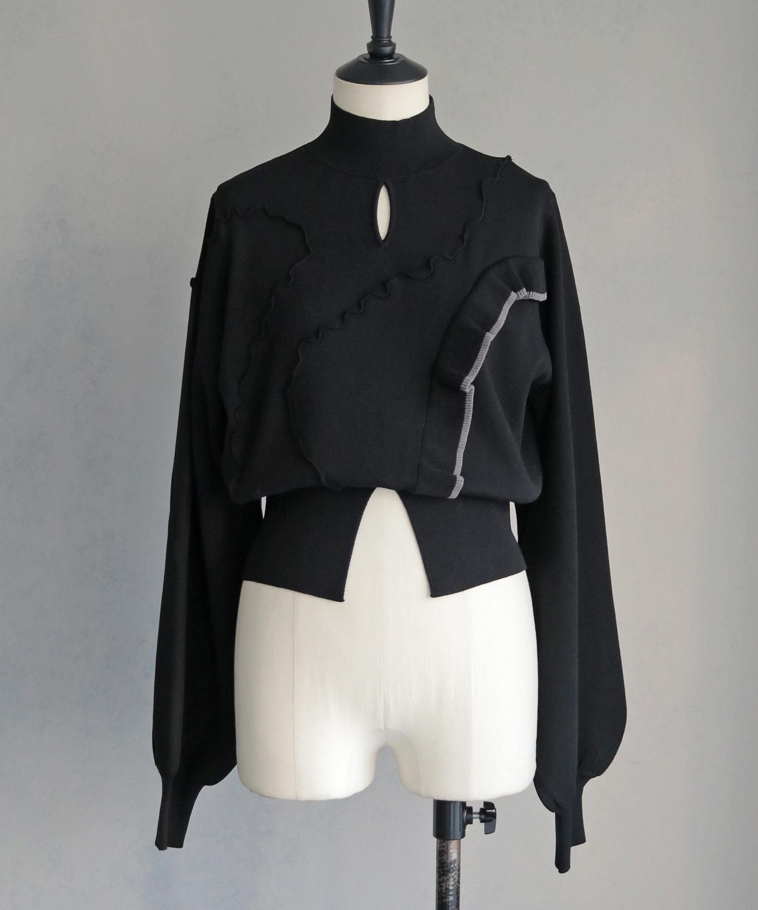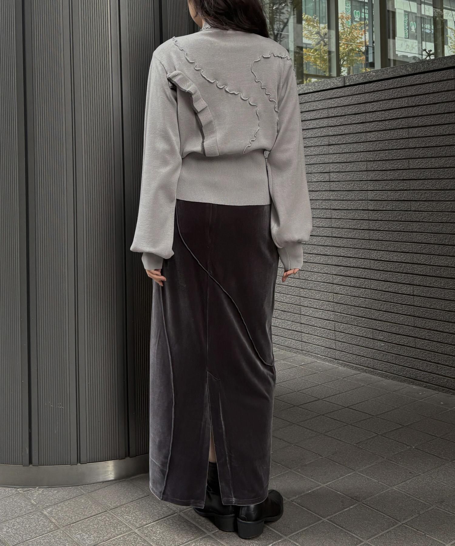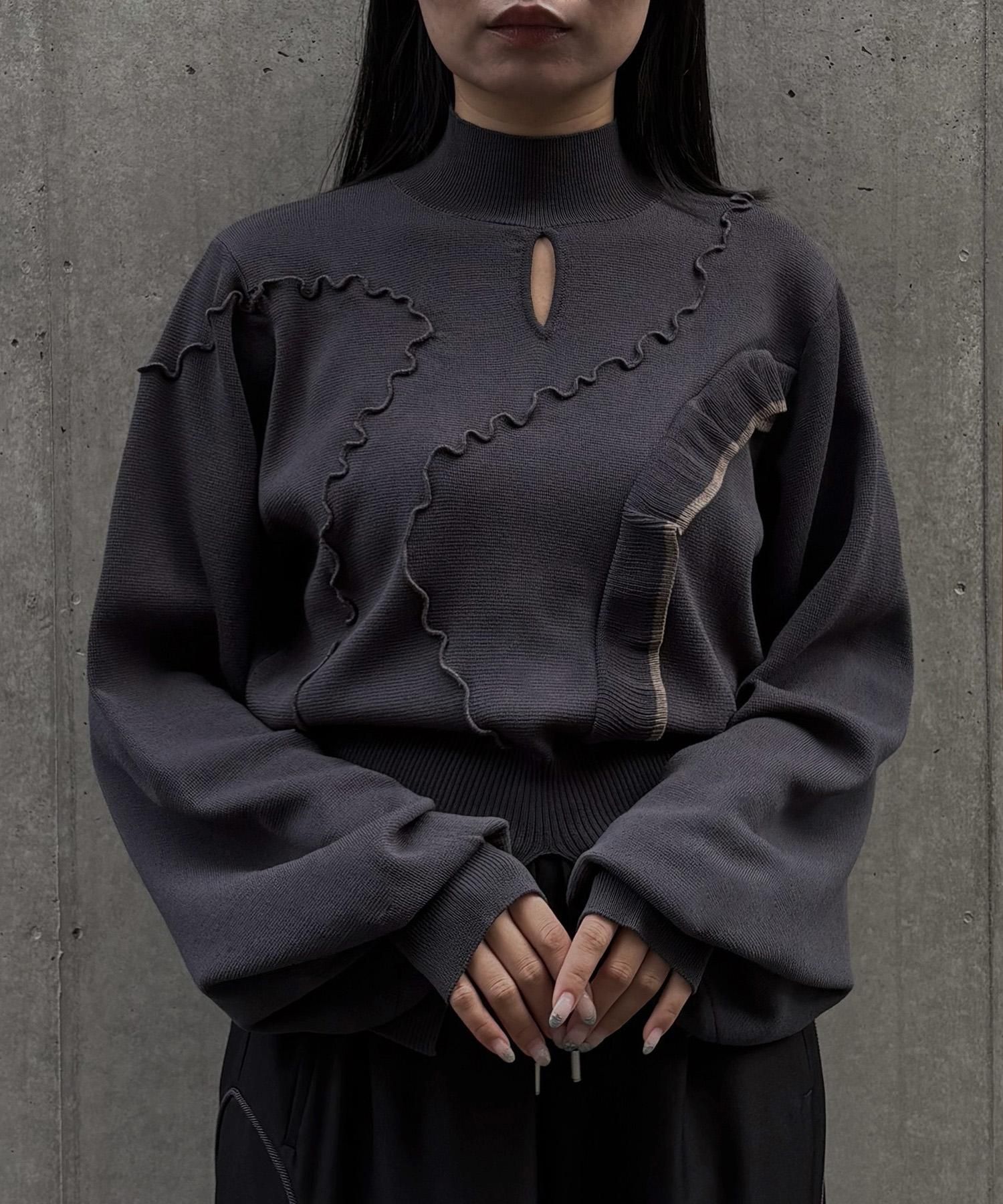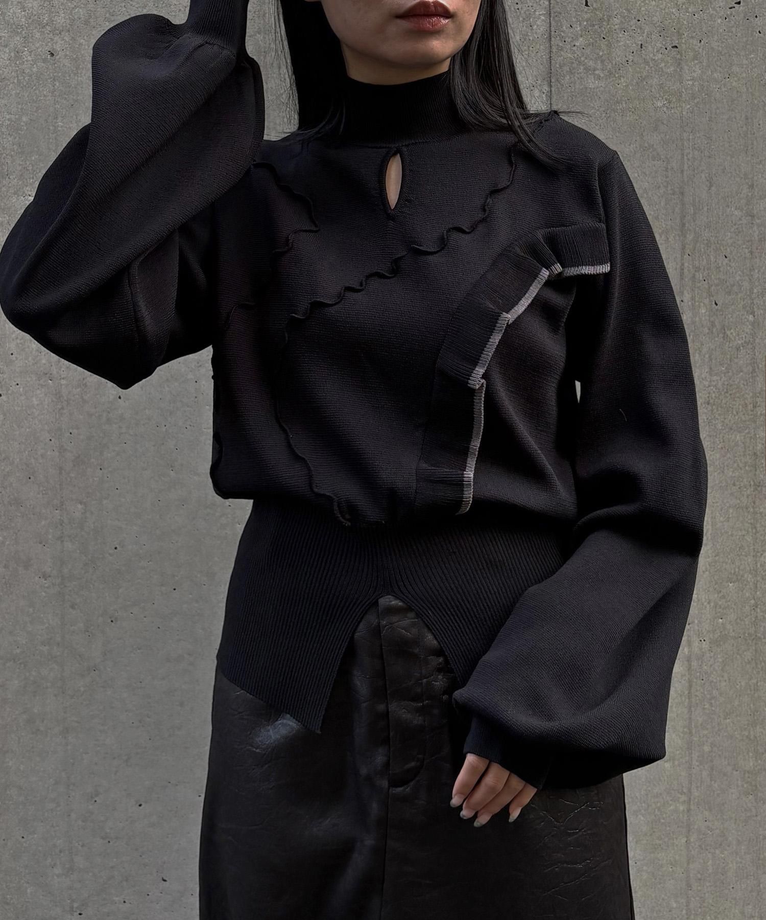 長めのボリュームスリーブとラッフルで華やかなデザインながら、ウエストの長めリブとスリットで全体をスッキリと見せます。
