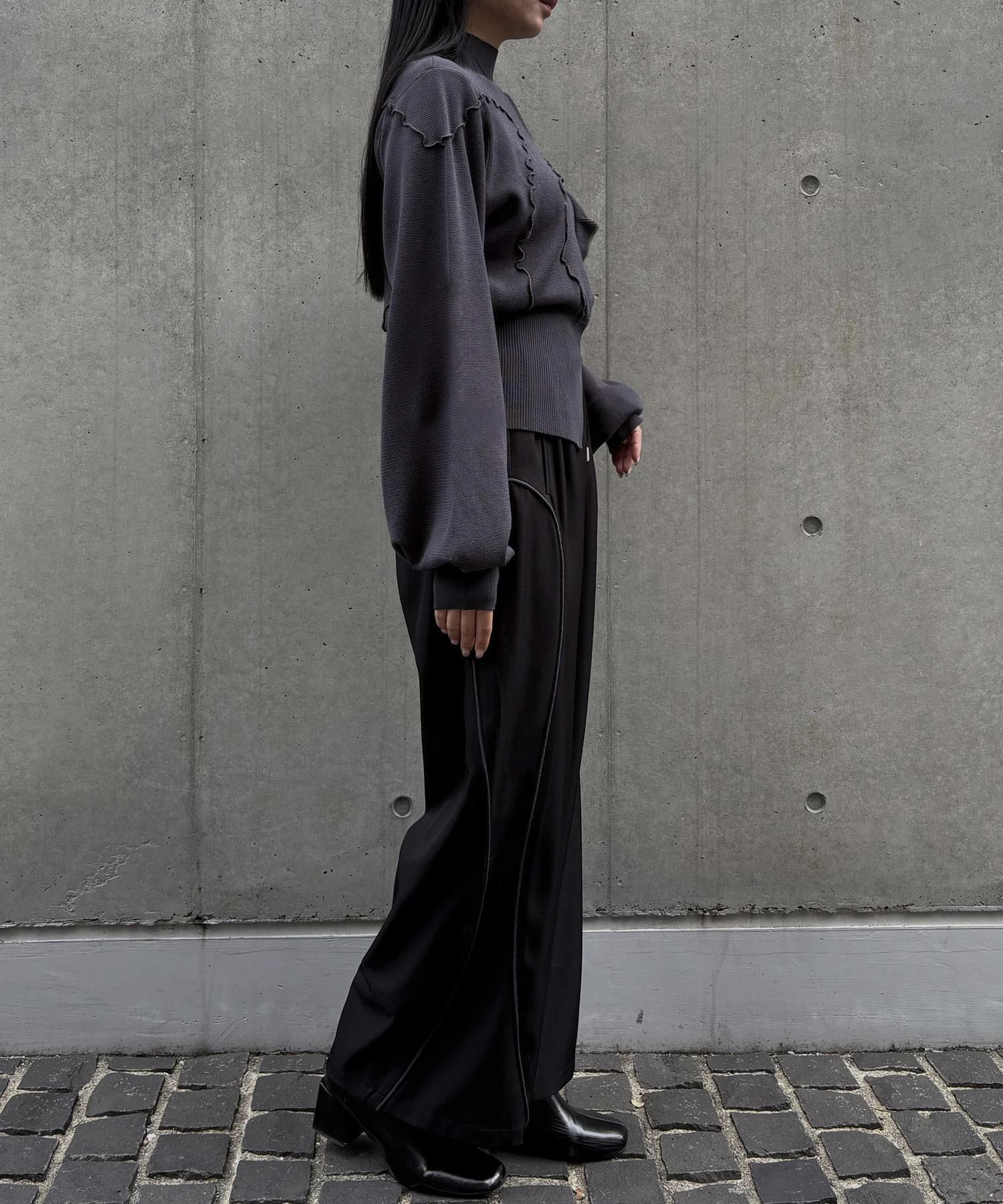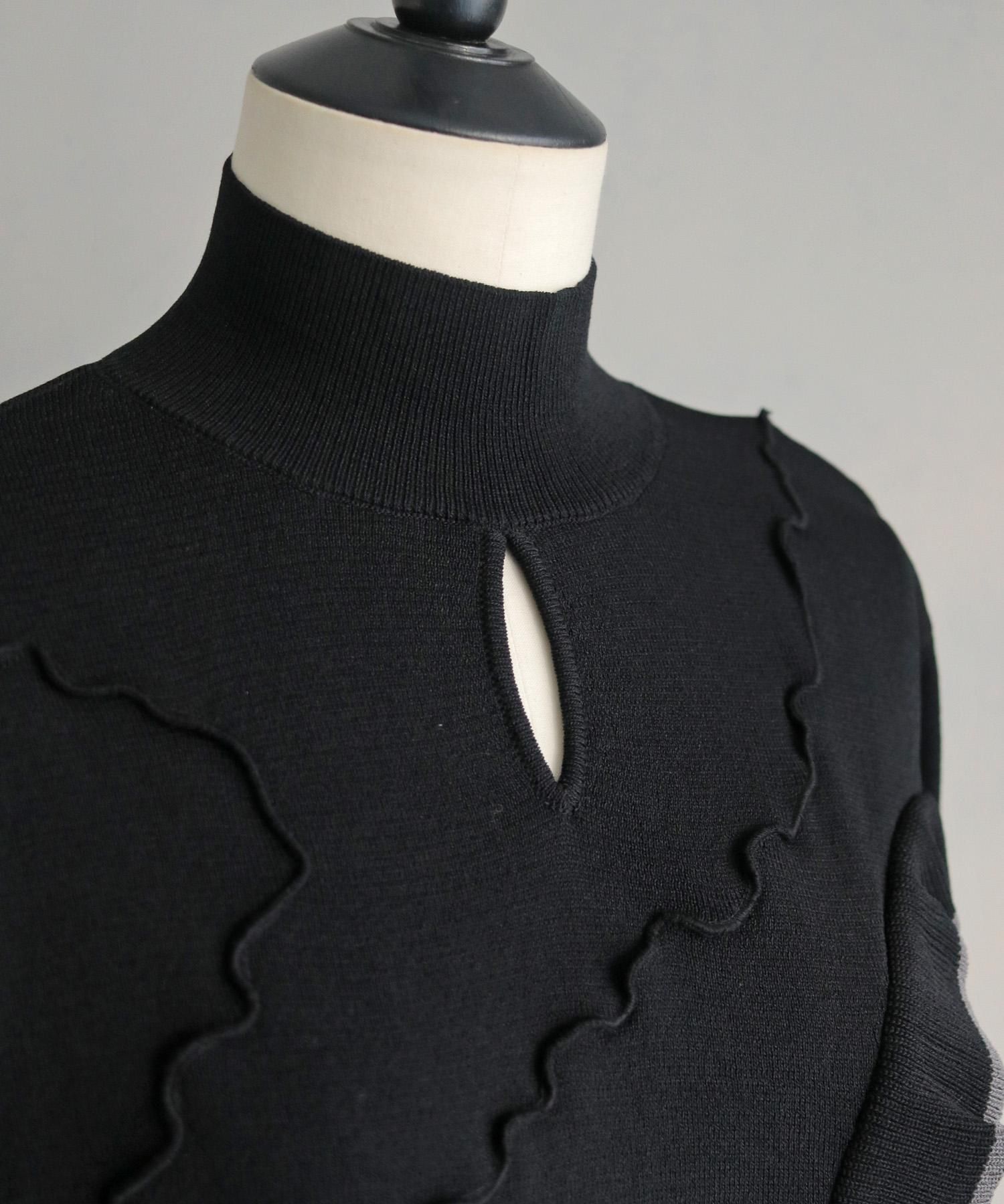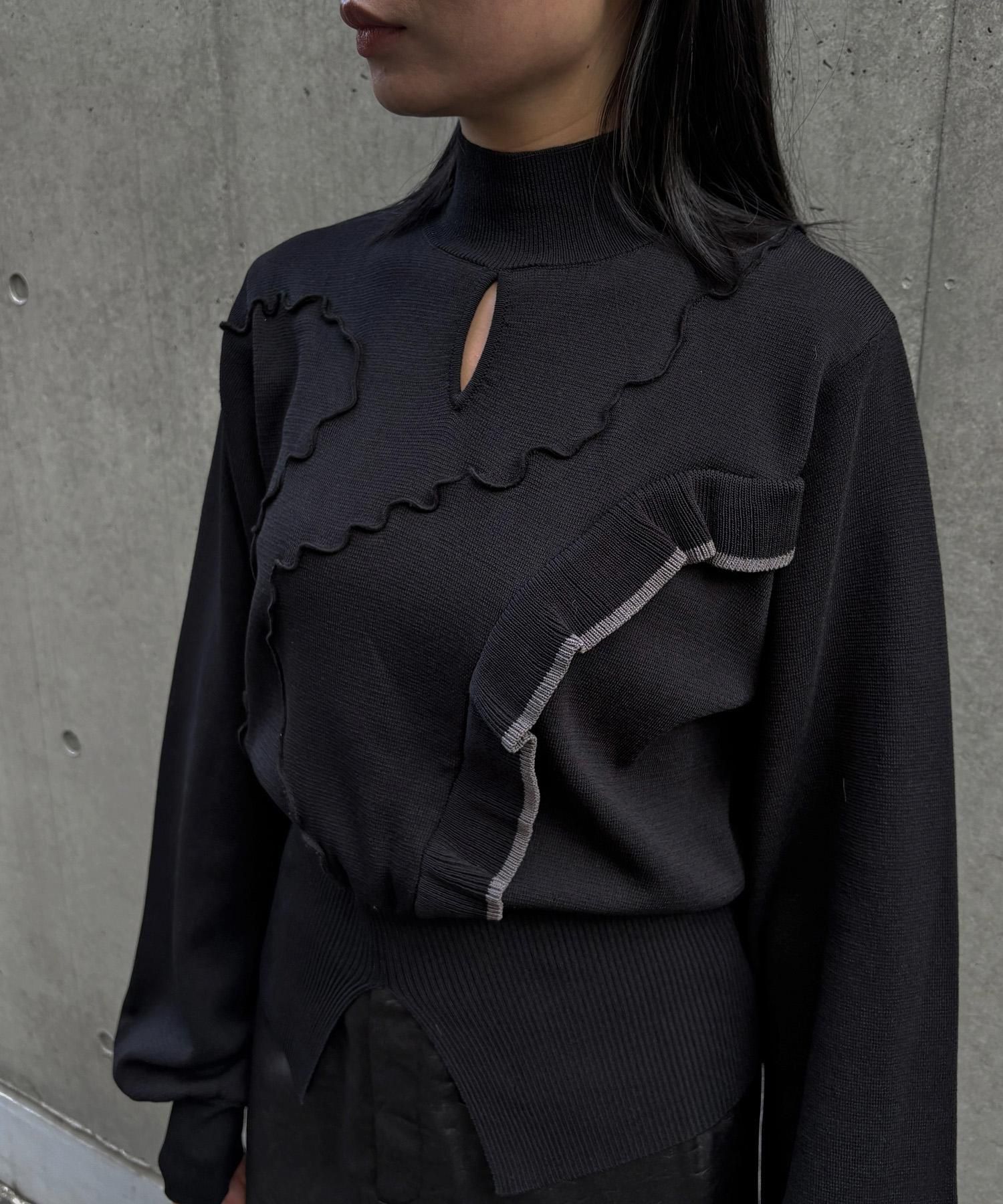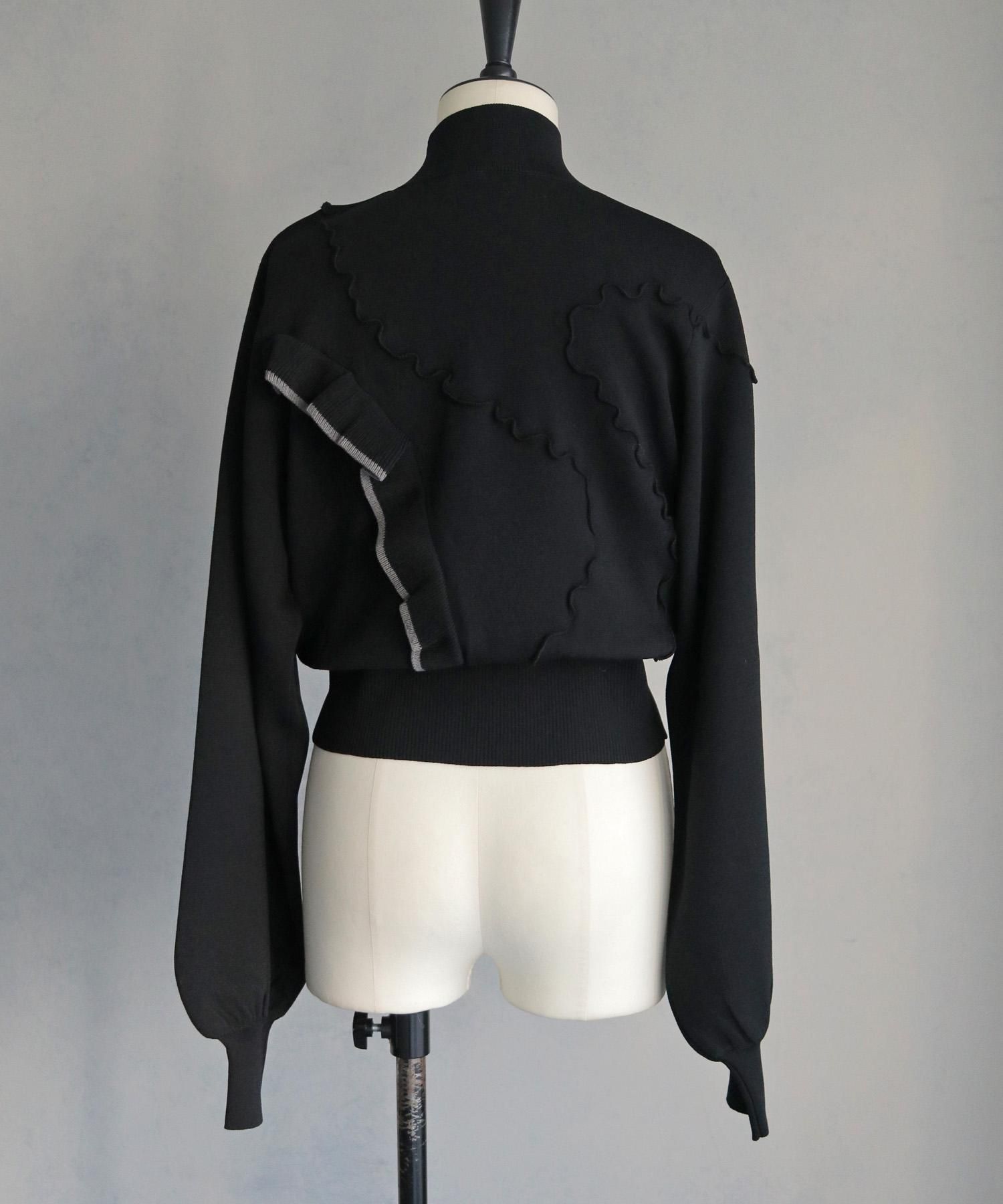 長めのボリュームスリーブとラッフルで華やかなデザインながら、ウエストの長めリブとスリットで全体をスッキリと見せます。