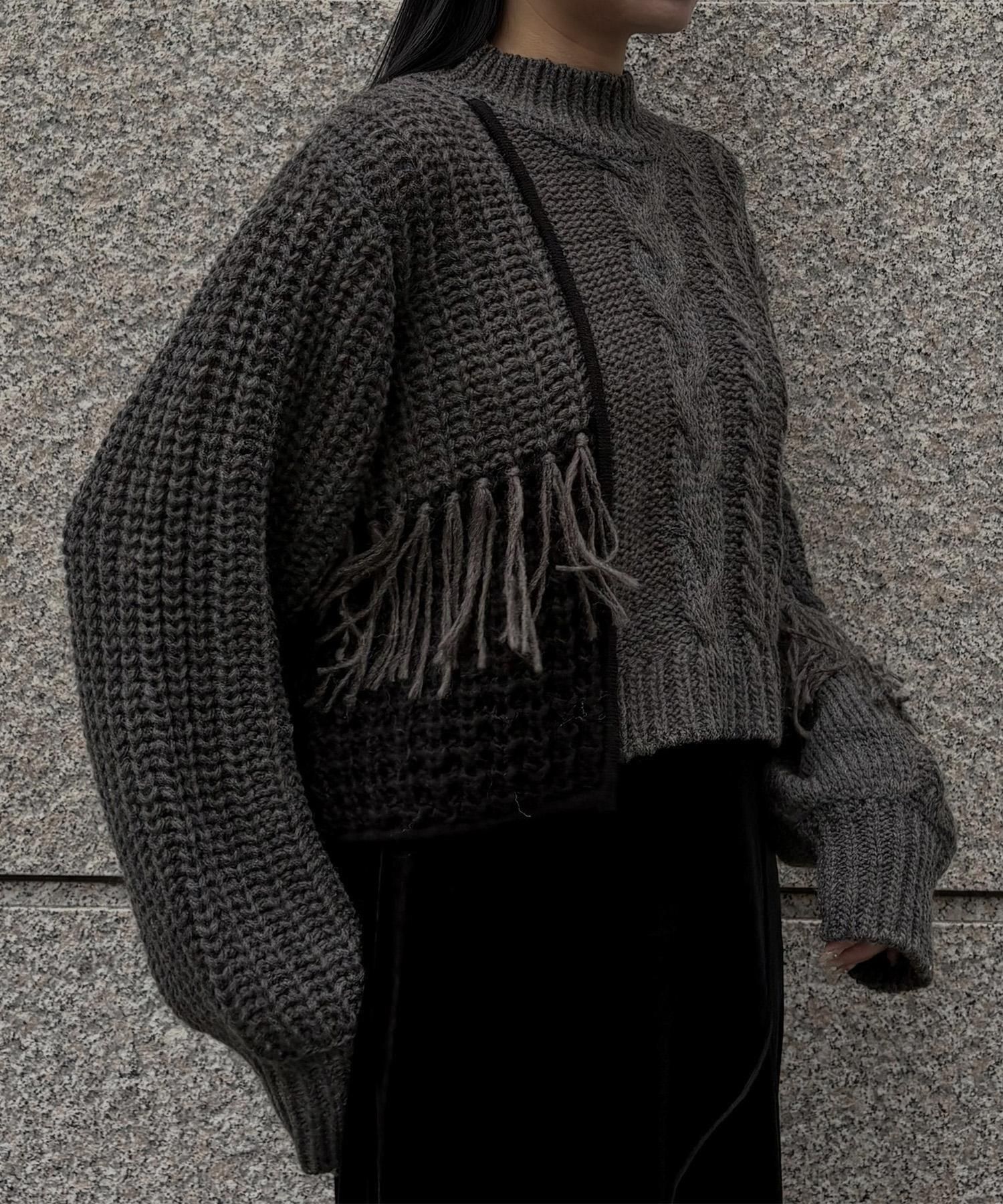 ケーブル編みをはじめとした多様な編地をミックスし、立体感たっぷりに仕上げたフリンジニット。